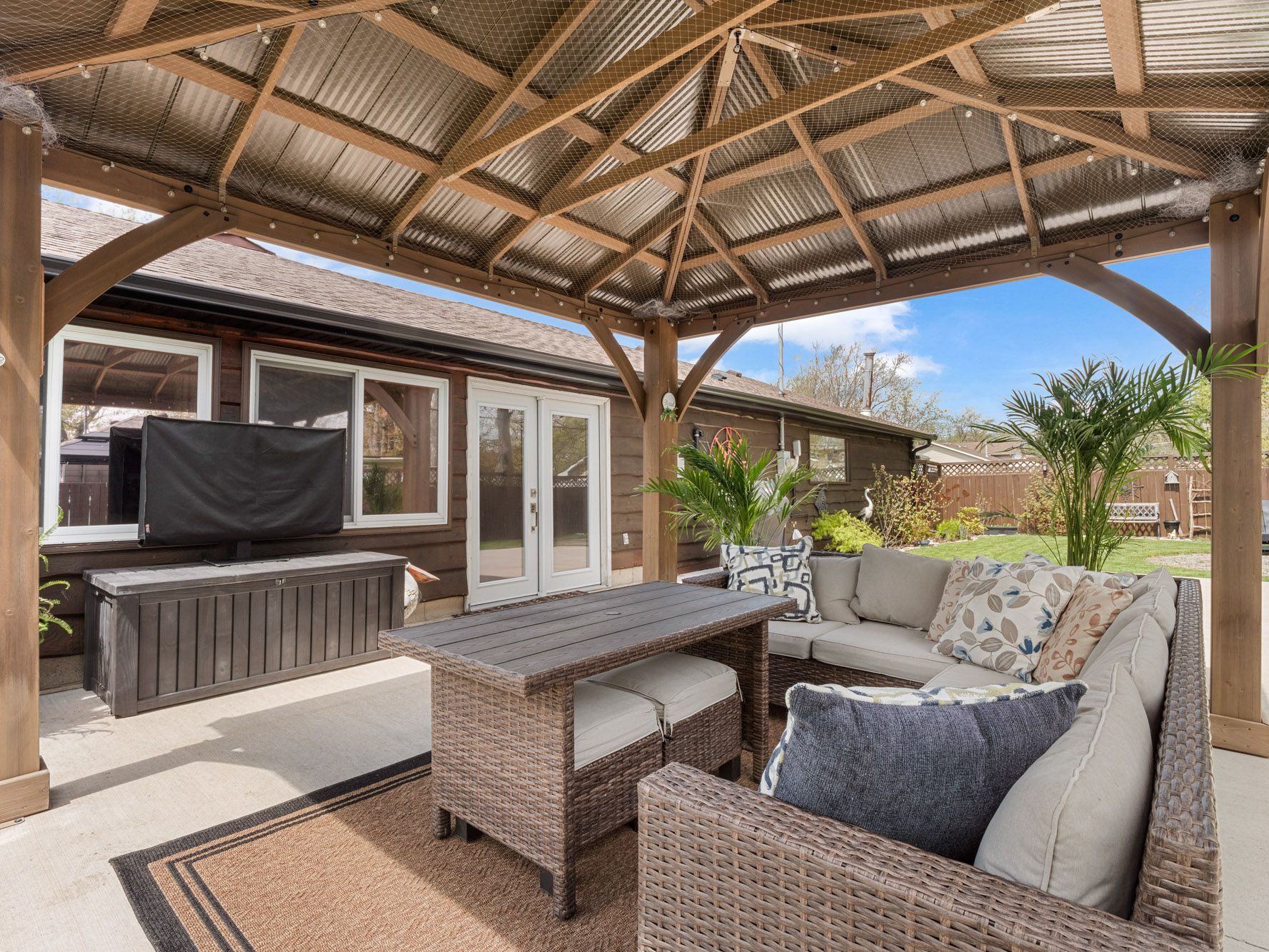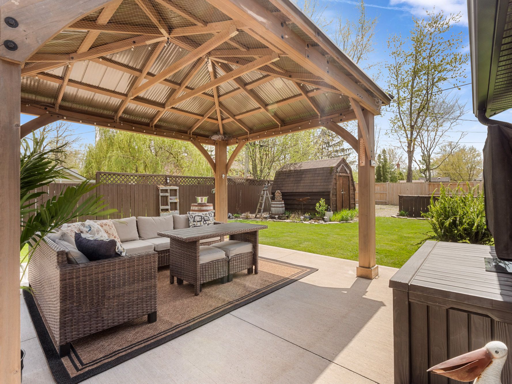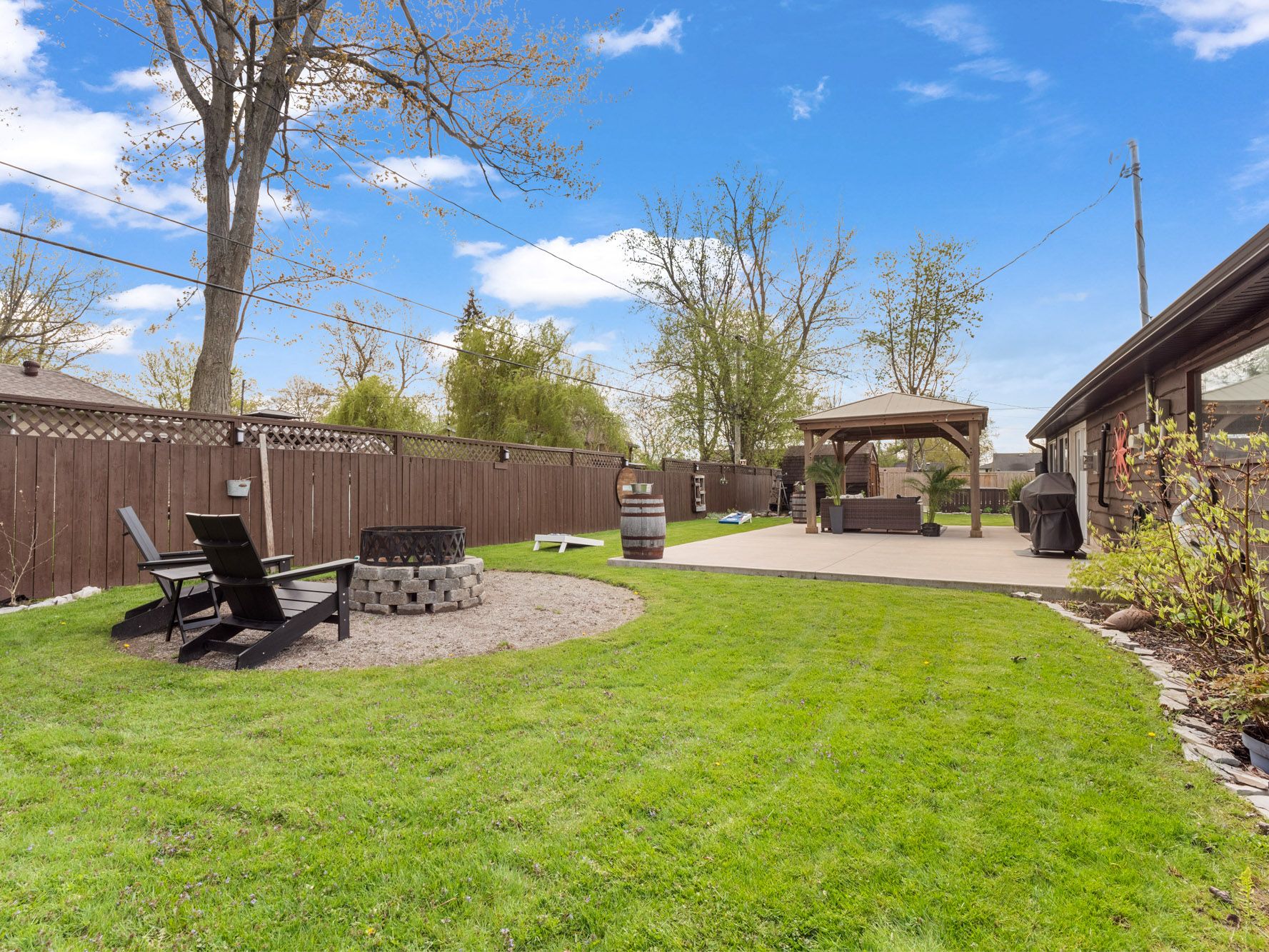• Spacious fenced backyard features a concrete patio and gazebo for relaxation.