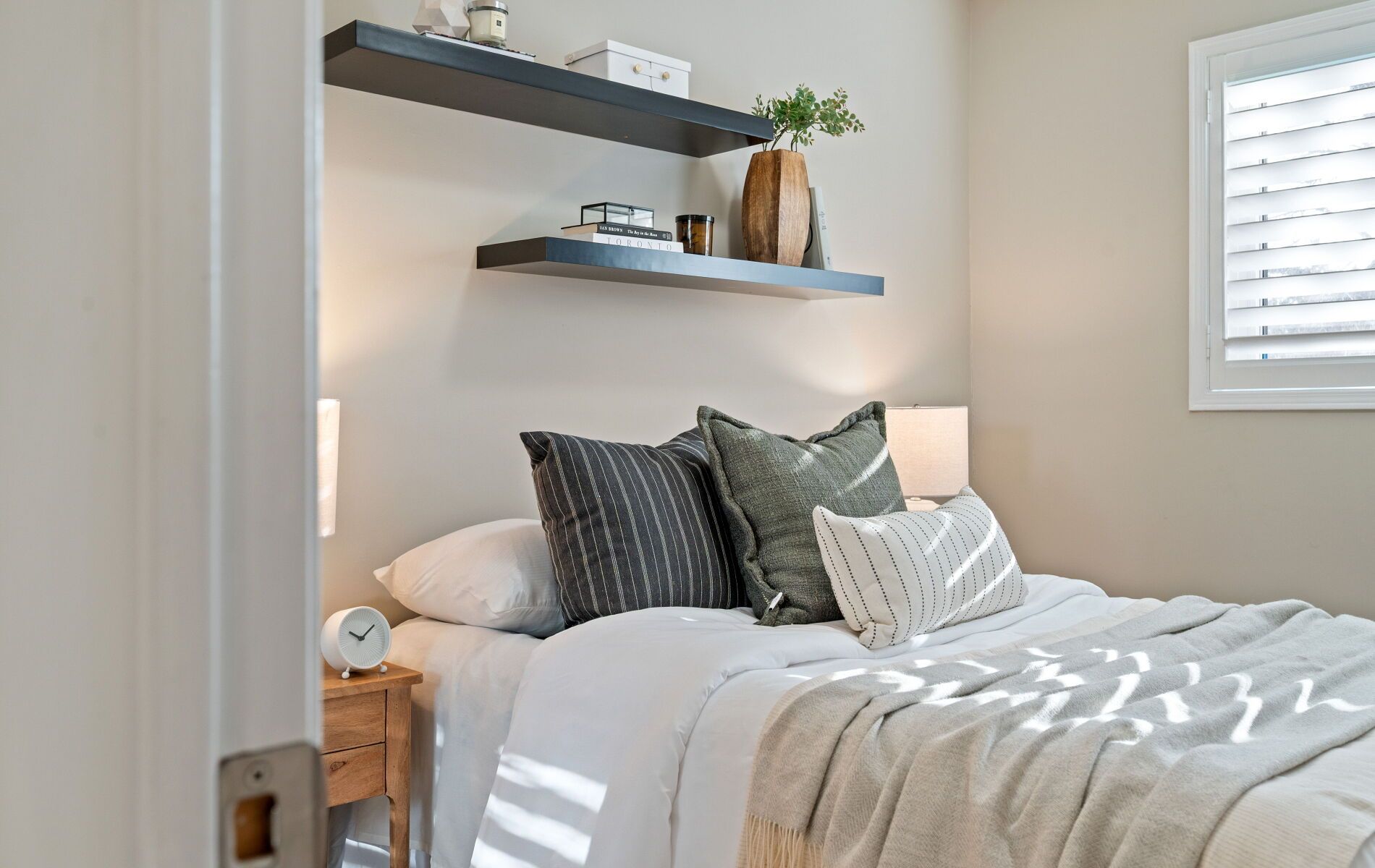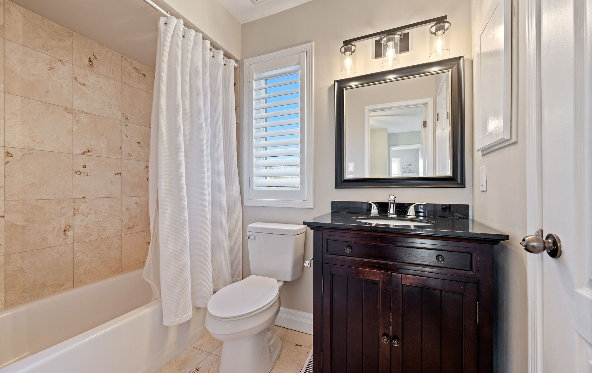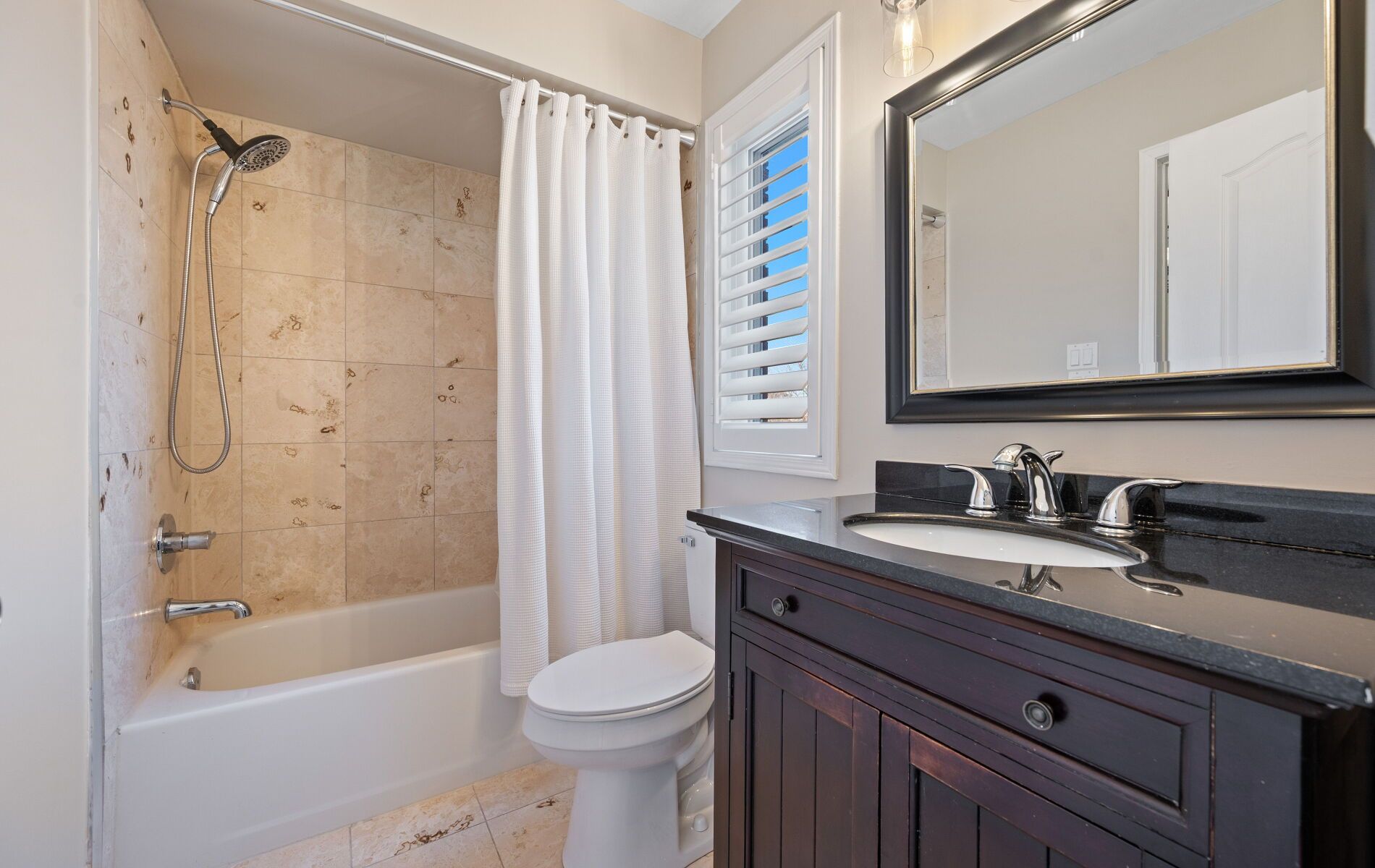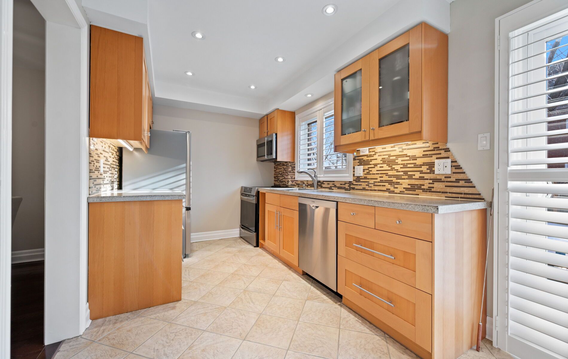 • Spacious eat-in kitchen features custom concrete countertops and updated shutters.