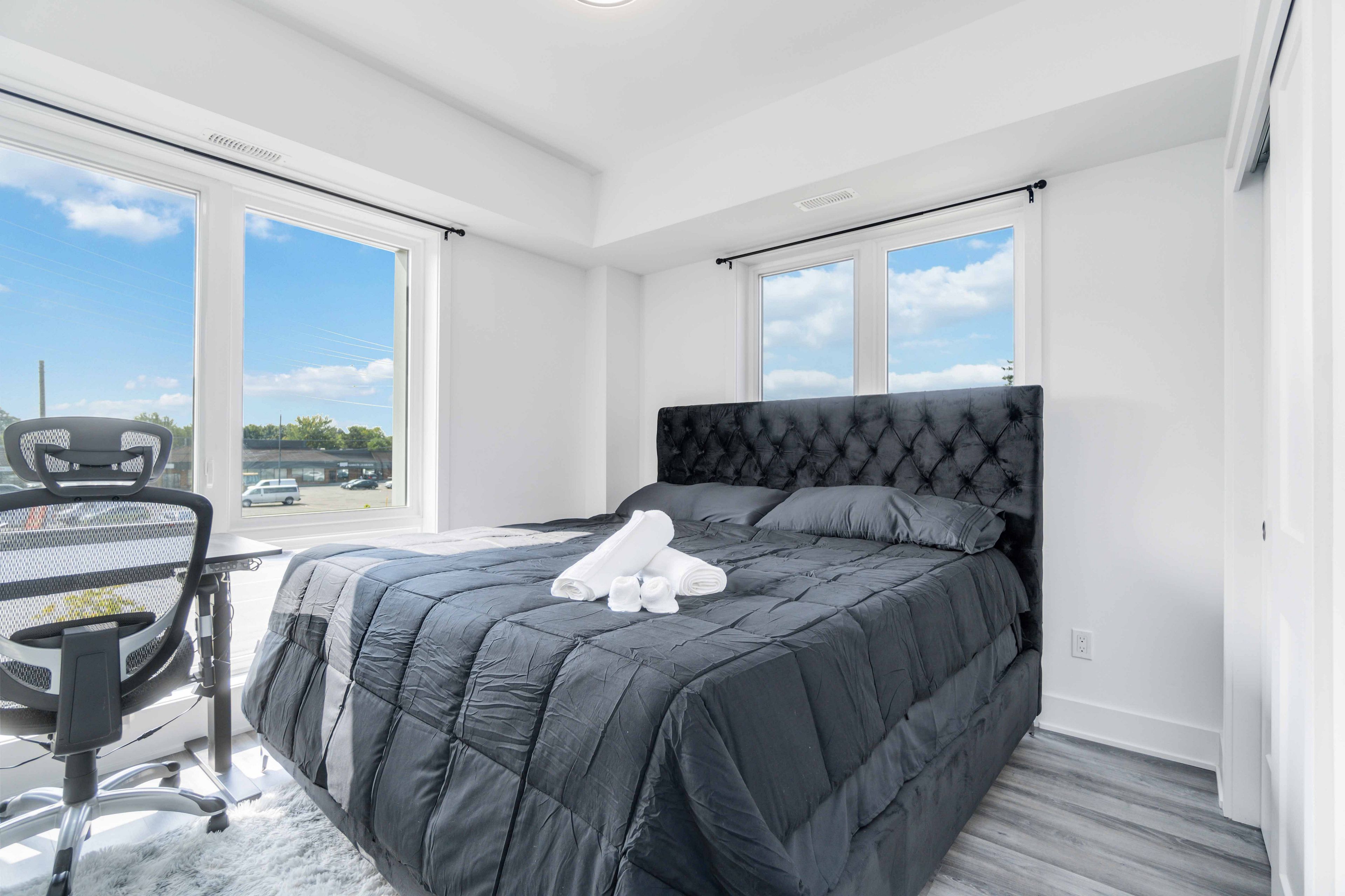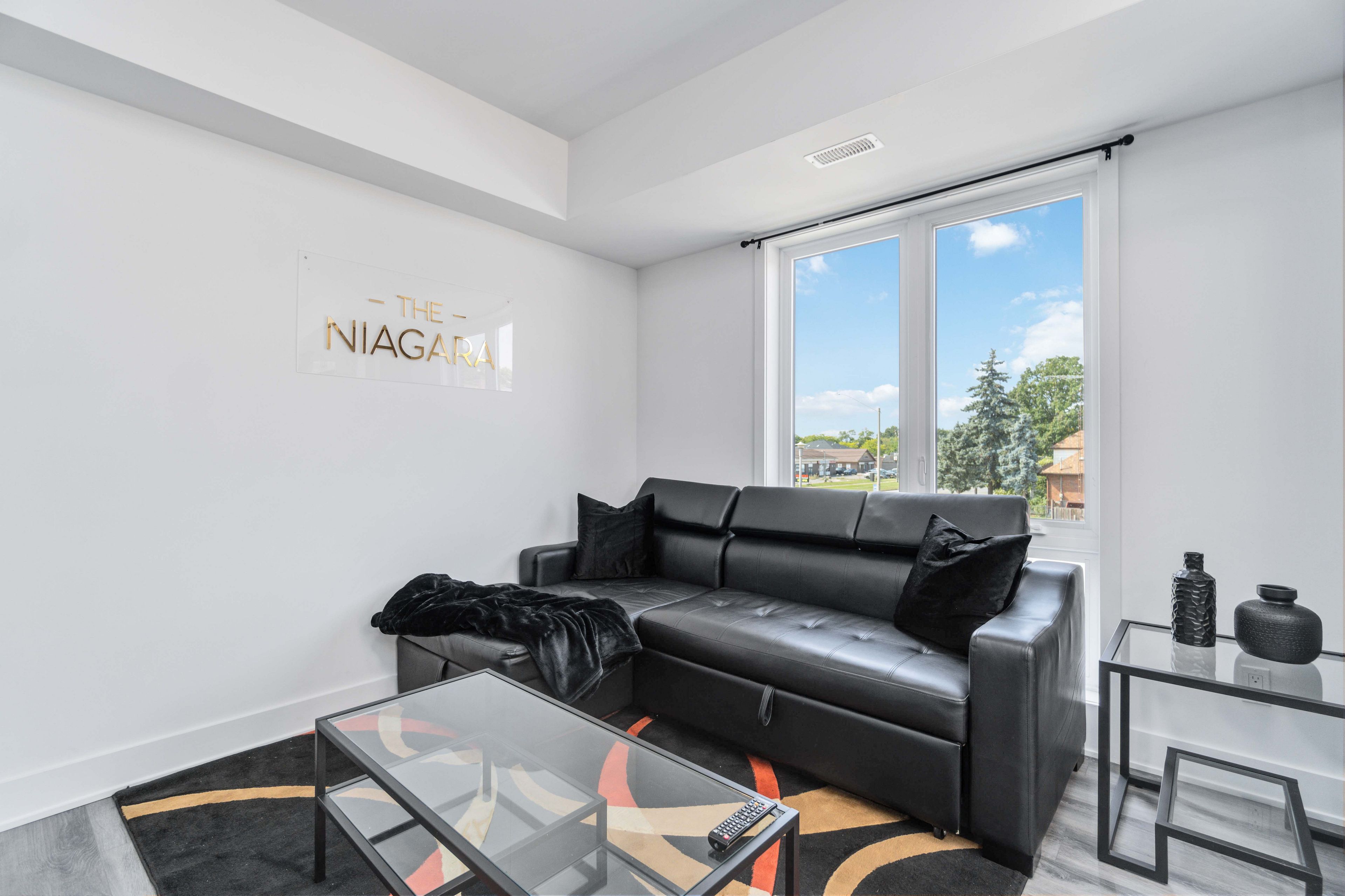 Turnkey furnished investment with rare rooftop terrace! Welcome to this stunning modern corner two-storey condo offering over 1,000 sq ft of stylish living space and strong cash-flow potential. Fully furnished and move-in or rental ready, this rare unit is ideal for investors, short-term rental operators, or end users seeking low-maintenance luxury living. The upgraded chef's kitchen features quartz countertops, a waterfall breakfast bar island, designer backsplash, and premium stainless steel appliances. It opens seamlessly into a bright open-concept living and dining space, perfect for entertaining. 9-ft smooth ceilings, upgraded hardwood flooring, and large windows fill the home with natural light and elevate the modern design. The spacious primary bedroom retreat offers large windows and a private 4-piece ensuite with sleek glass rain shower. Upstairs, you'll find a second generously sized bedroom and full bathroom-ideal for guests, family, or added rental flexibility. One of the home's standout features is the rare 350 sq ft private rooftop terrace, creating the perfect outdoor space to relax or entertain while enjoying open views. Located less than 5 minutes from clifton hill, and close to golf courses, costco, walmart, restaurants, shopping, major highways, and the u. S. Border, this prime location offers exceptional convenience and lifestyle appeal.