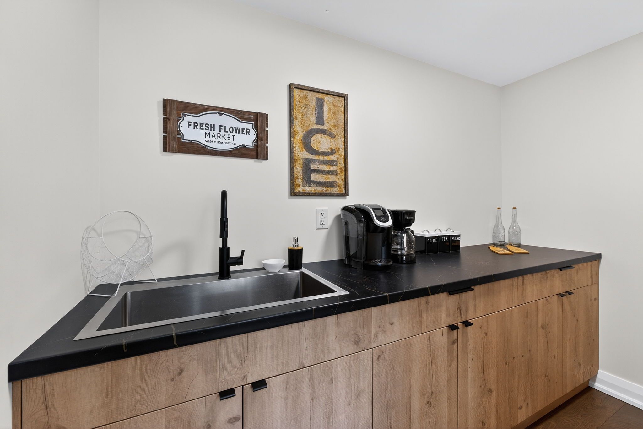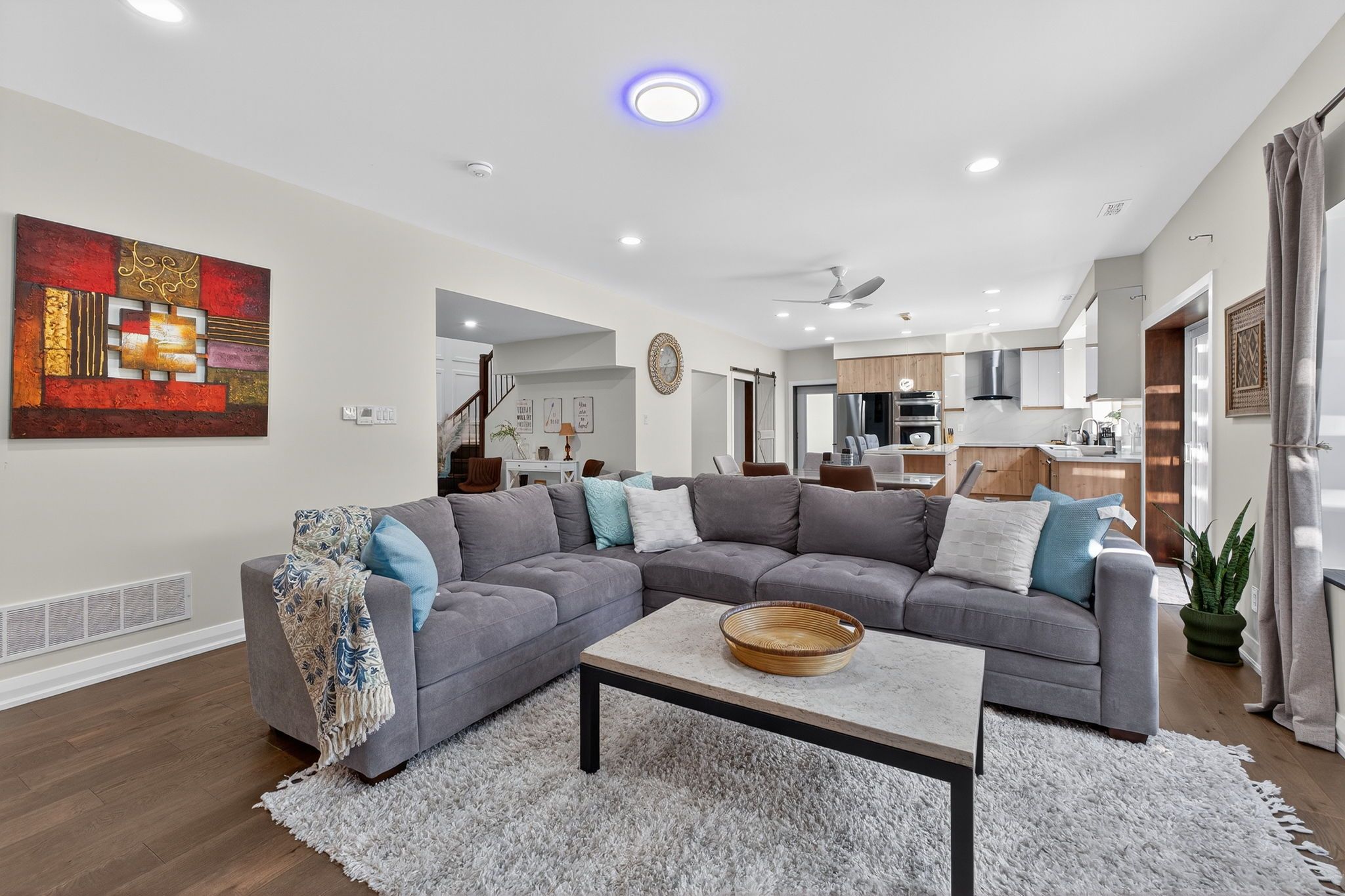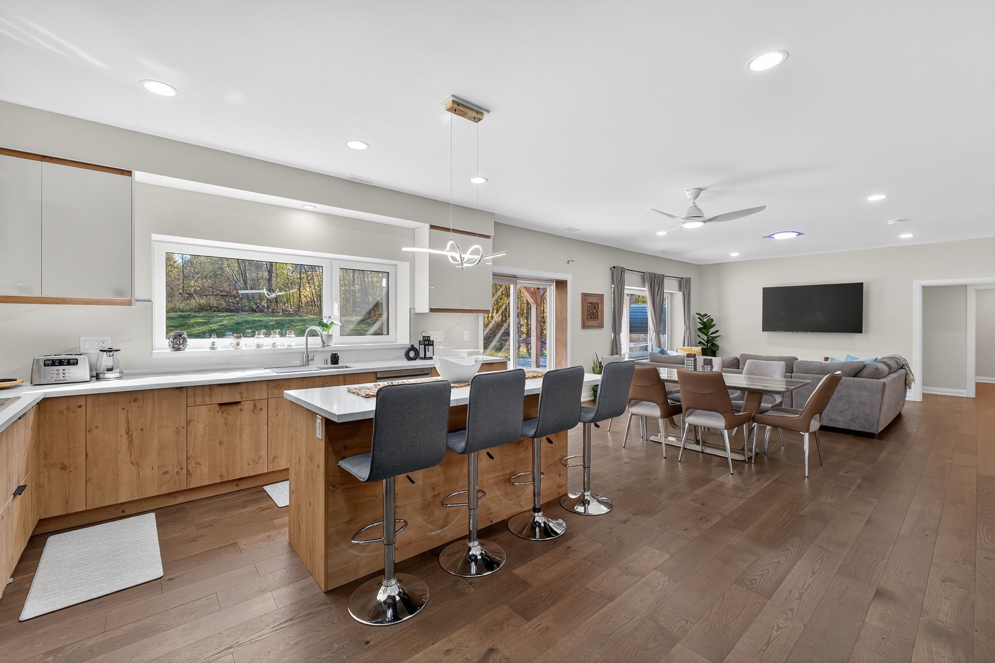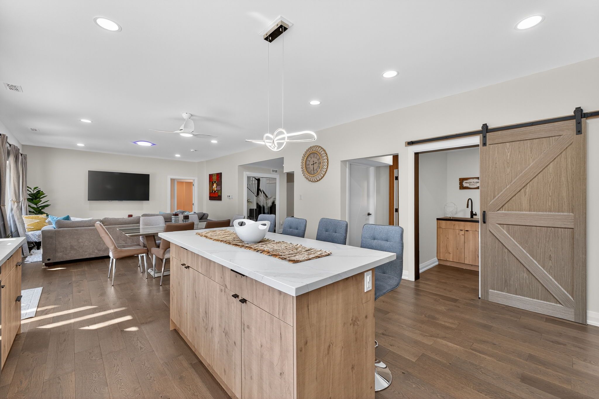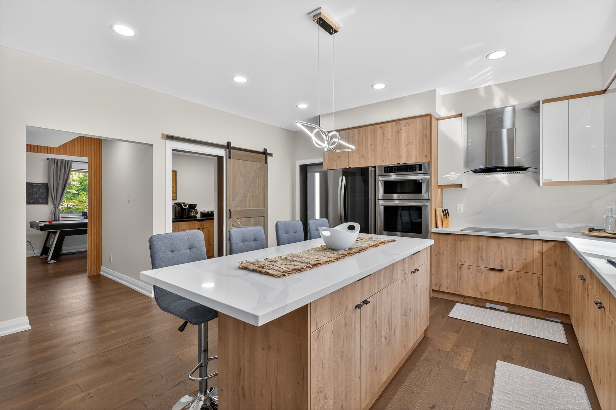 • Chef's kitchen with energy-efficient appliances and quartz countertops.