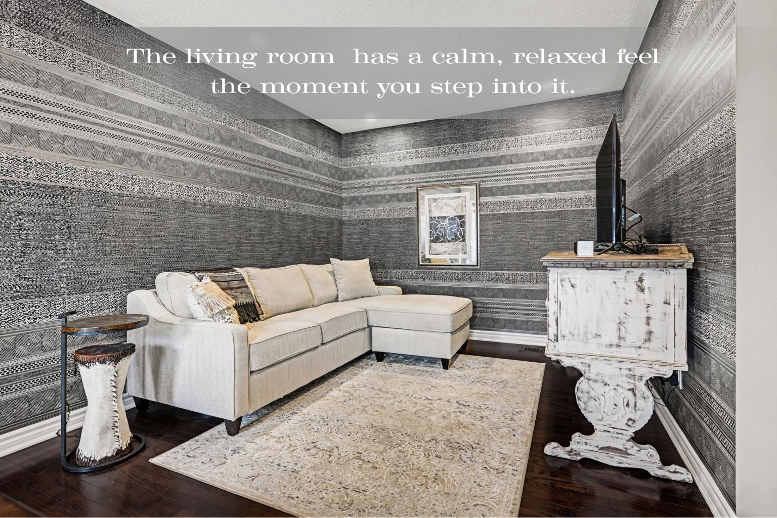• Comfortable living room with hardwood floors and stylish pot lights.