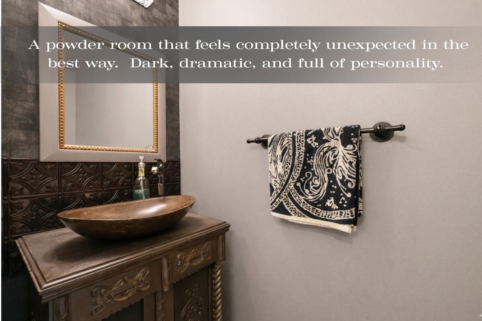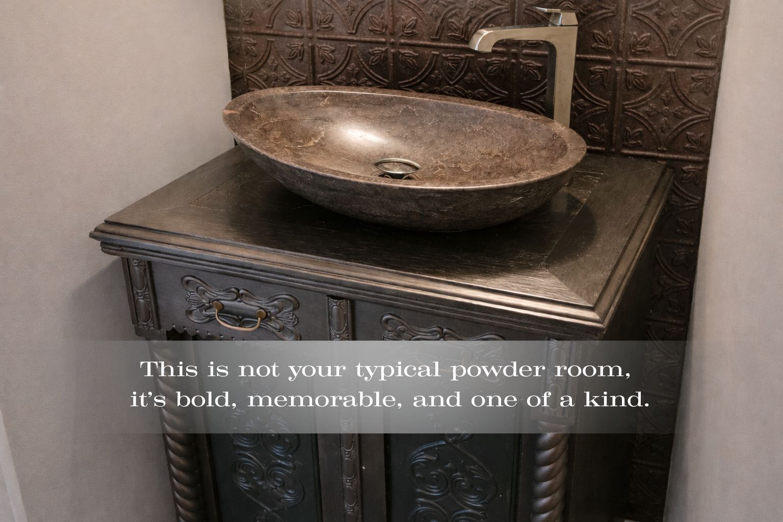 • Stylish powder room with unique fixtures and ceramic flooring.