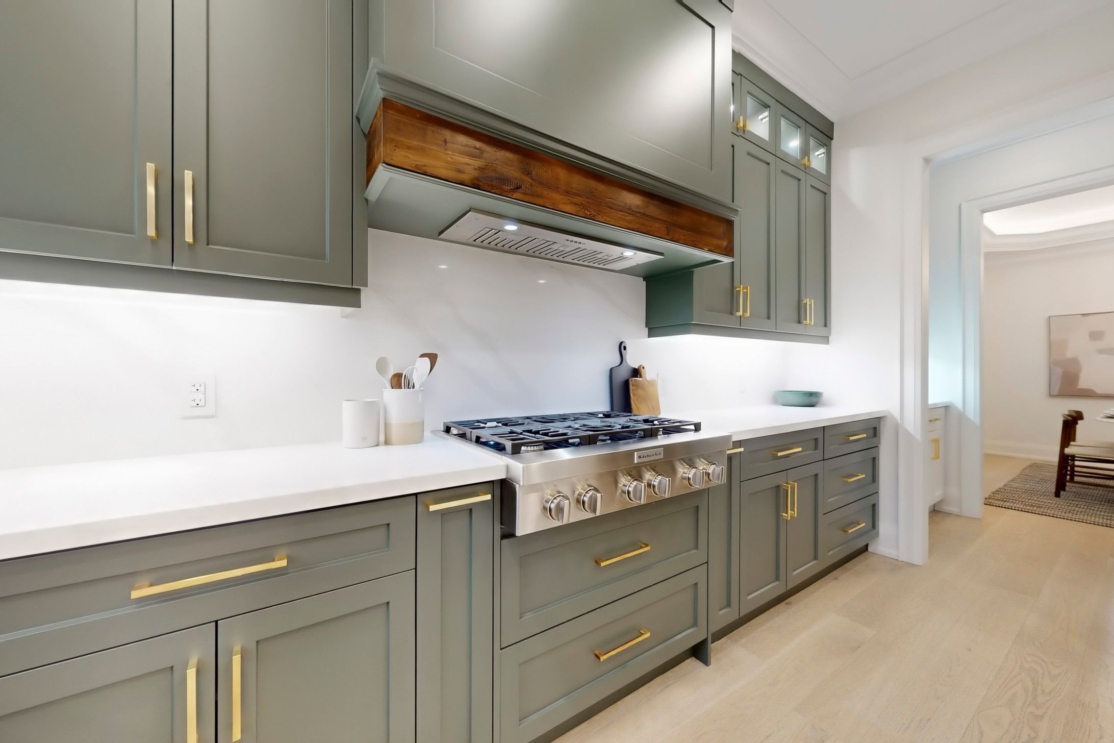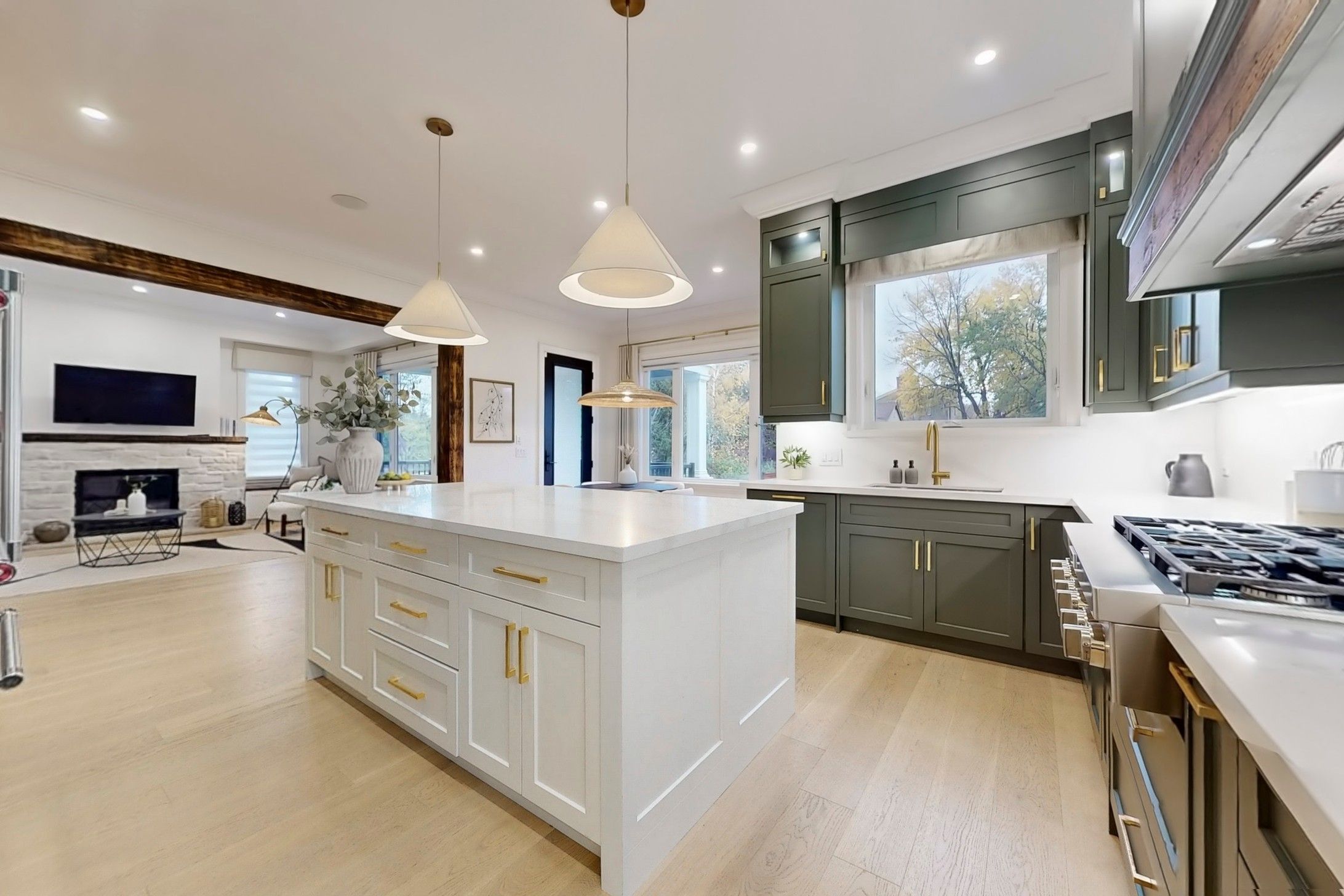 • Modern kitchen with gas stove, island, and pantry for easy cooking.