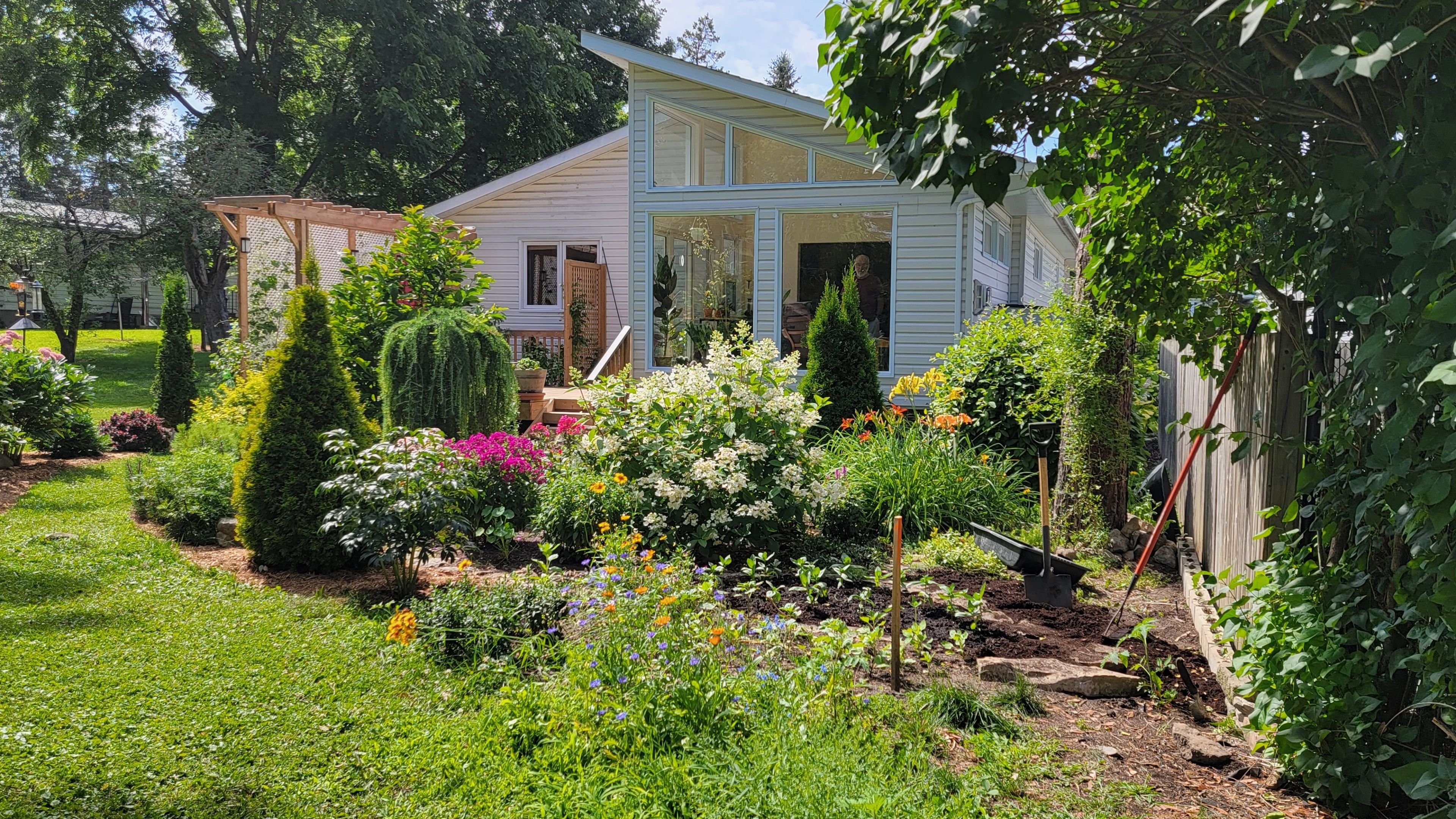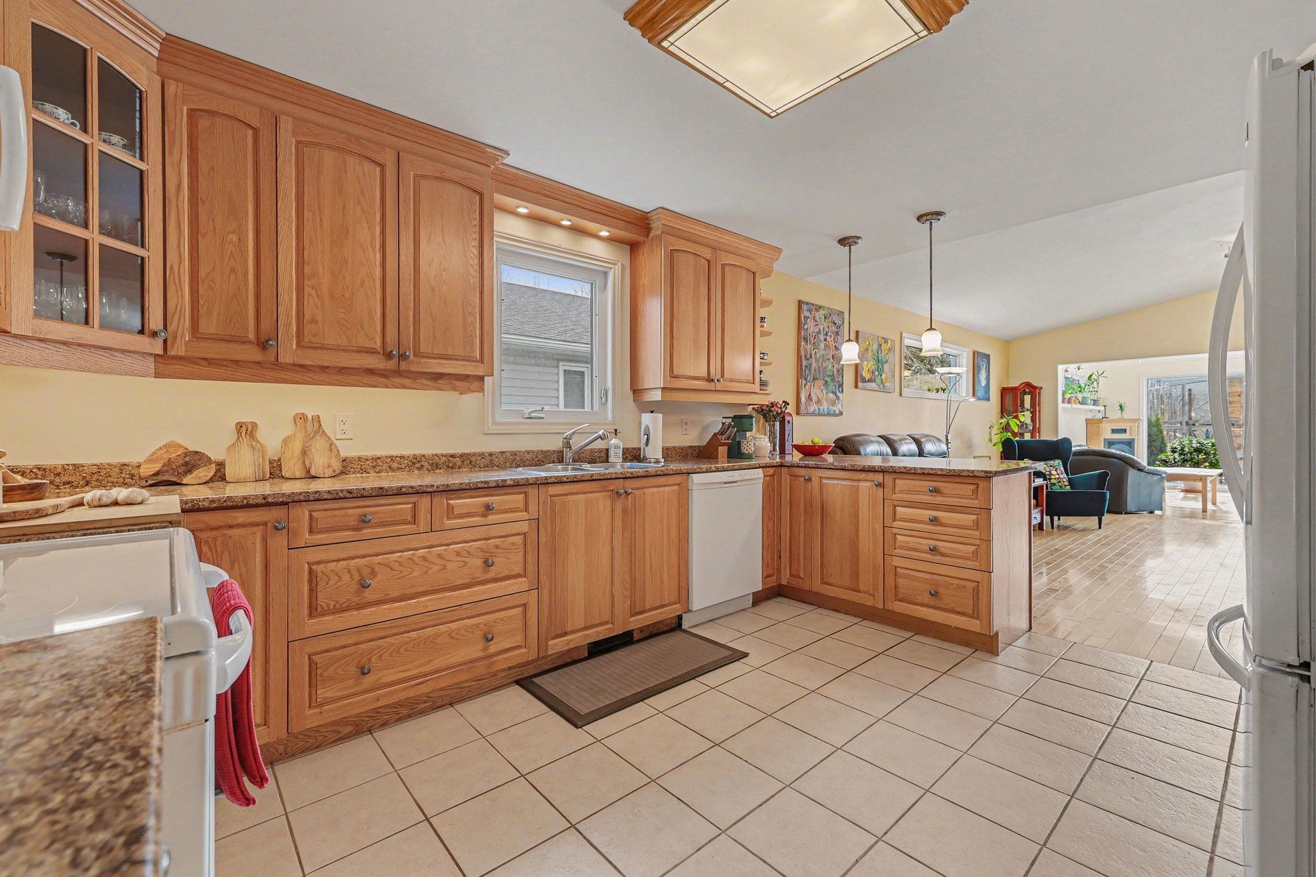 A true gardener's paradise - this bungalow offers comfort, functionality, and charm in a family-friendly neighbourhood. The entrance foyer features tile flooring and convenient inside access to the attached double garage and the main floor office / den overlooking the front yard, providing the perfect space for working from home, a quiet retreat, or an orchid room :) the open-concept main level is thoughtfully designed with seamless sightlines from the kitchen through the living / dining areas and into the stunning family room addition. This sun-filled space is a true highlight, featuring vaulted ceilings, walls of windows, a cozy gas fireplace, and patio doors leading to a private deck-perfect for entertaining or relaxing while enjoying the backyard. The main floor offers two spacious bedrooms, including a large primary suite complete with a walk-in closet and 3-piece ensuite bath. A convenient main floor laundry room adds to the home's practical layout. Downstairs, the partially finished basement provides excellent additional living space with a third bedroom, a rec-room area, a 2-piece bathroom, and ample storage in the utility room. Comfort is ensured year-round with a natural gas furnace, central air conditioning, and radiant in-floor heating in the basement. When you step outside you'll discover a true gardener's paradise. The beautifully landscaped yard is filled with mature plants and vibrant perennials that bloom throughout the seasons, offering an ever-changing backdrop of colour and tranquility. Additional features include a newer roof (2018), on-demand hot water system, and a natural gas bbq hook-up. Ideally located close to all of kemptville's amenities, the waterfront trail, local cafés, and quick access to the 416, this home offers the perfect blend of small-town charm and commuter convenience. A wonderful opportunity to enjoy comfortable living in a picturesque setting.