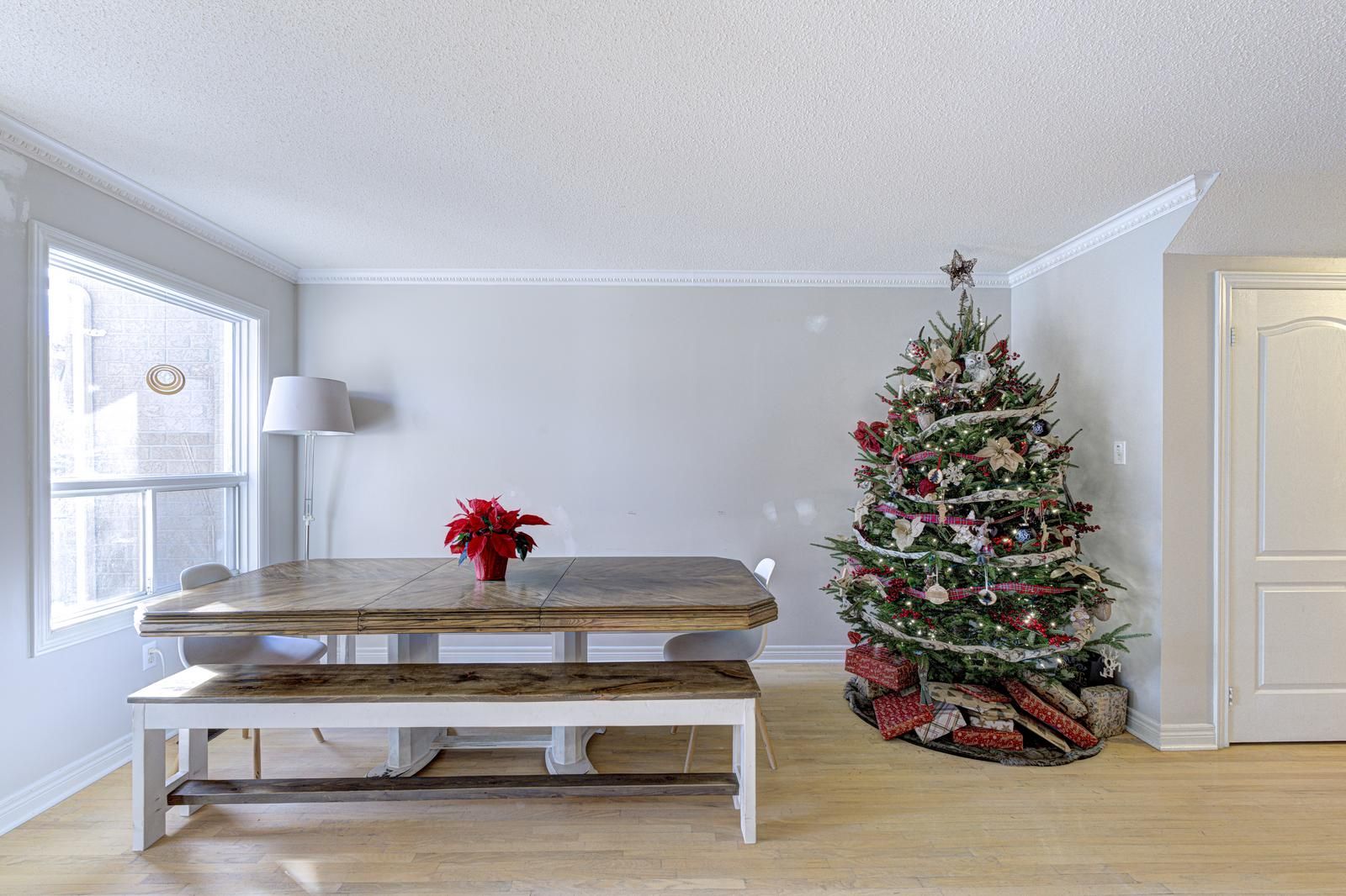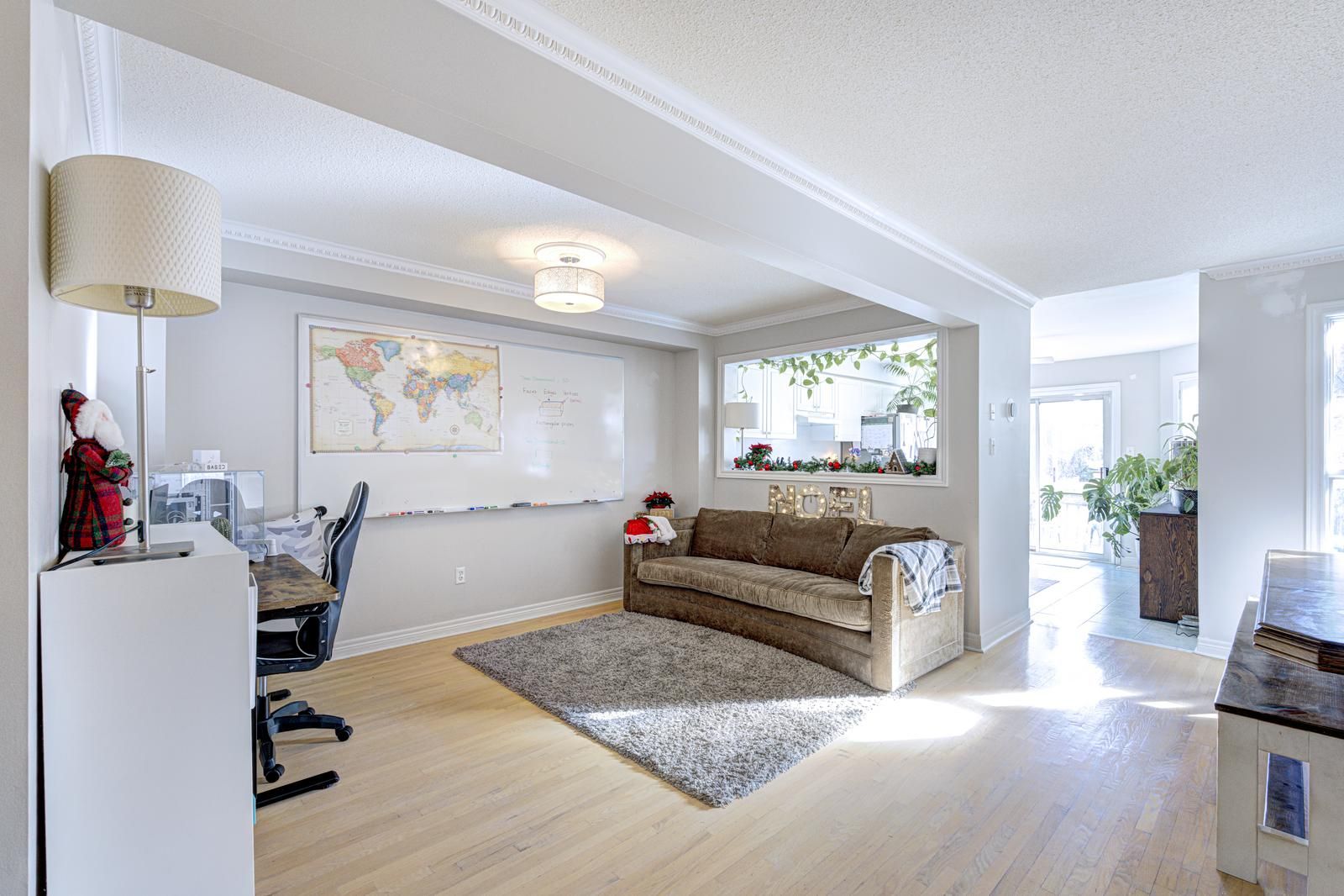 • Bright open-concept living and dining area with hardwood flooring.