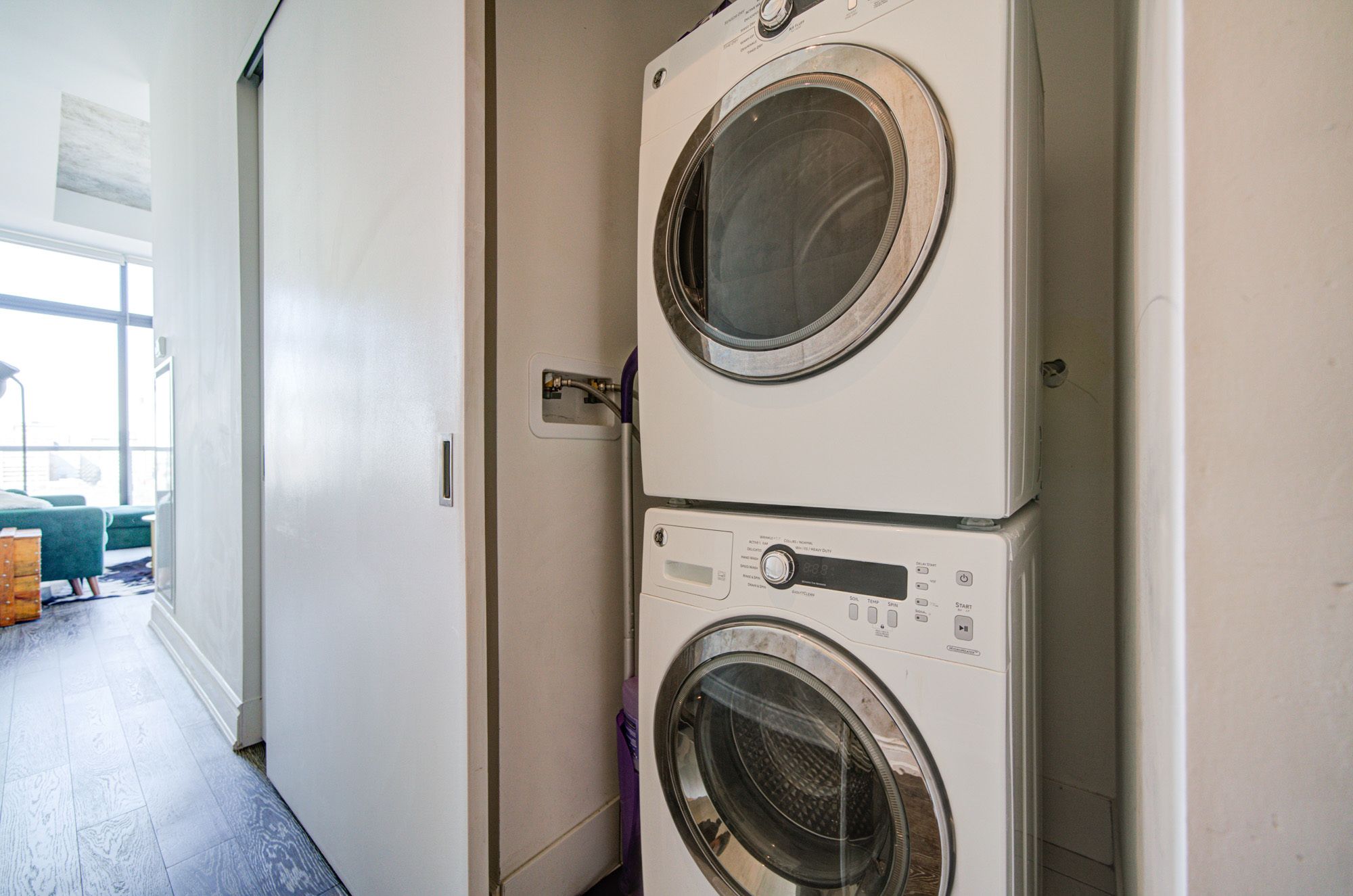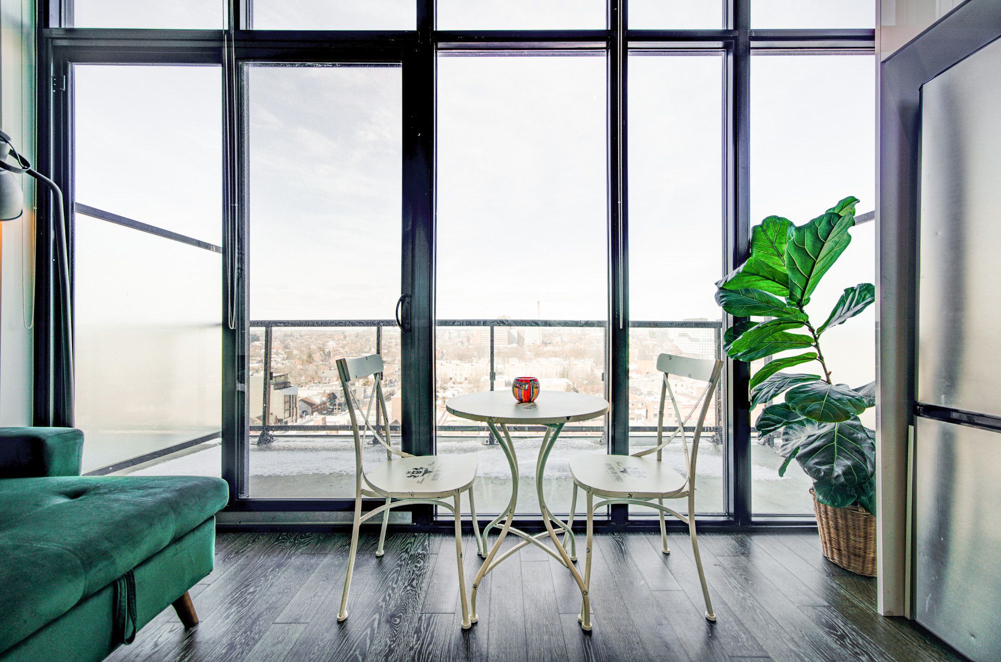 • Bright living space with floor-to-ceiling factory style windows.