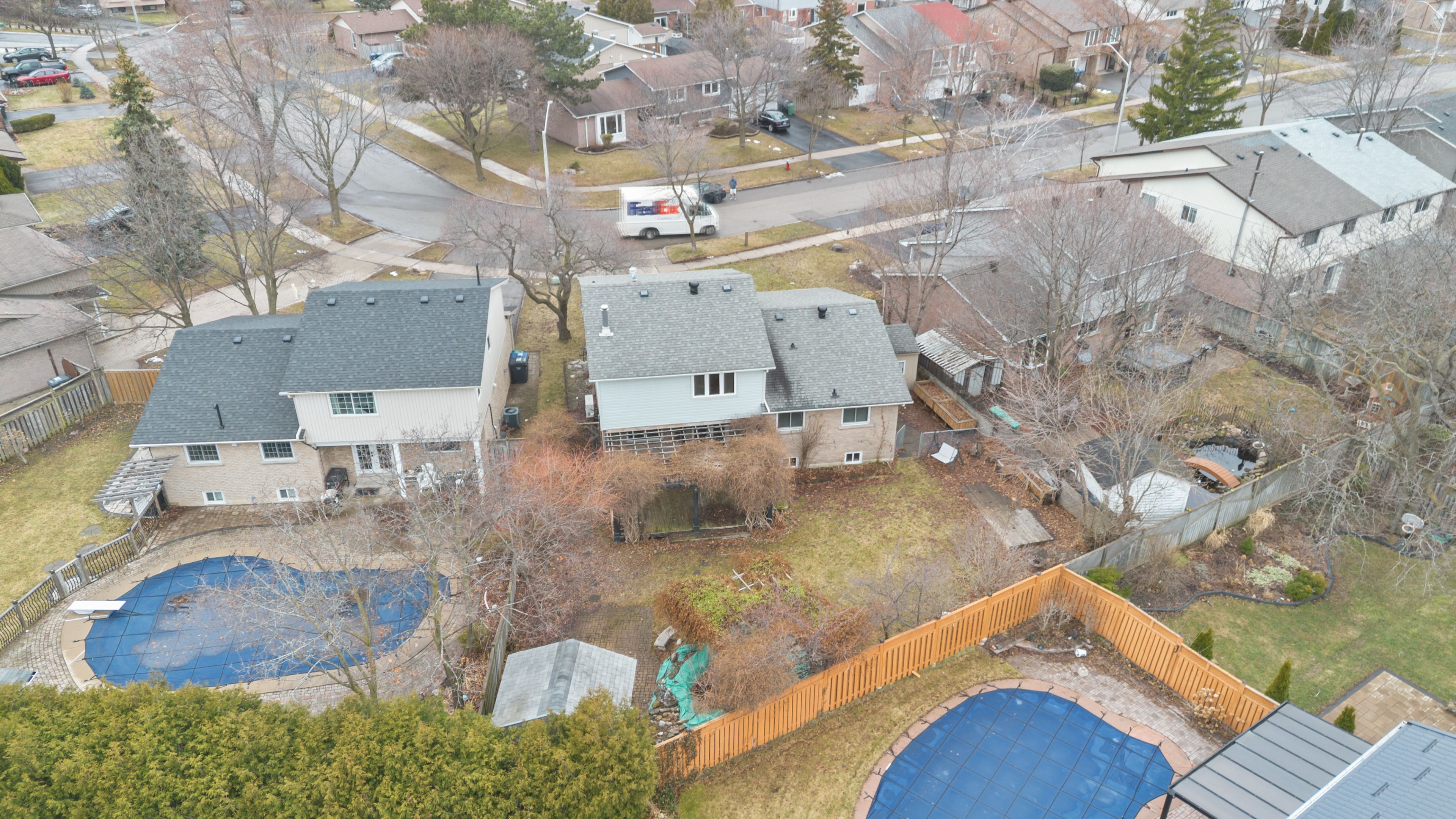 • Large backyard features a deck, koi pond, and garden area.