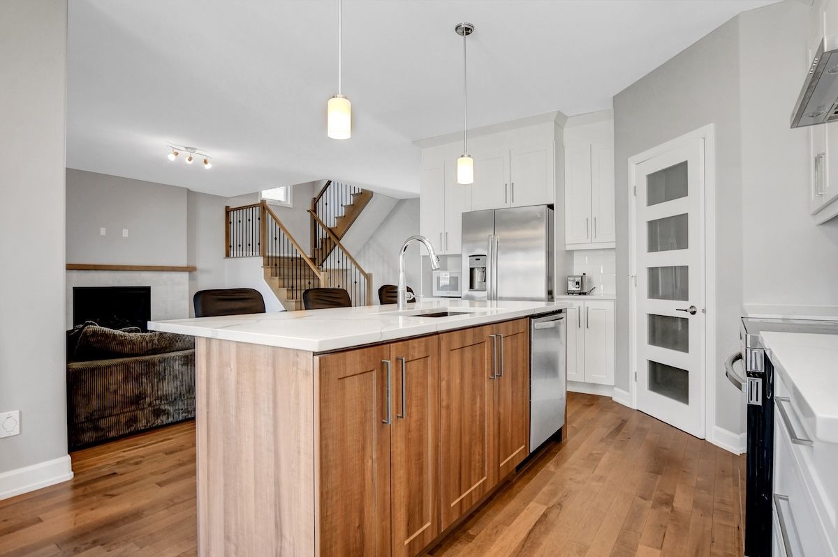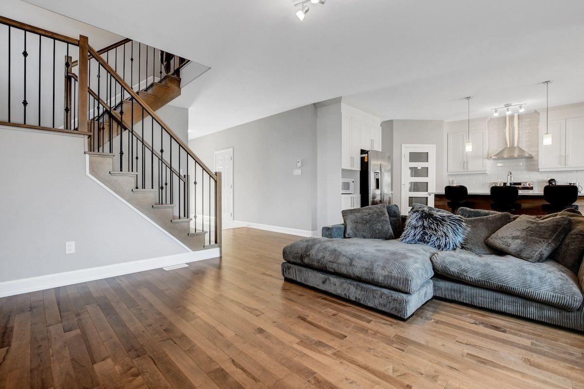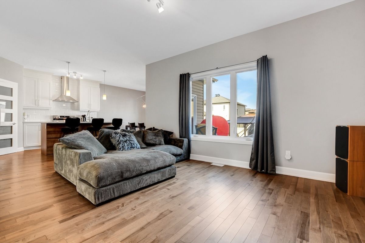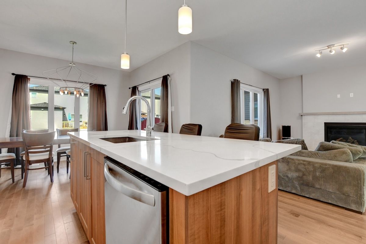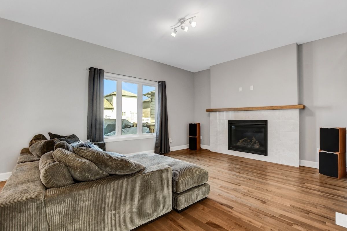 • Open-concept main floor with hardwood flooring and cozy fireplace.