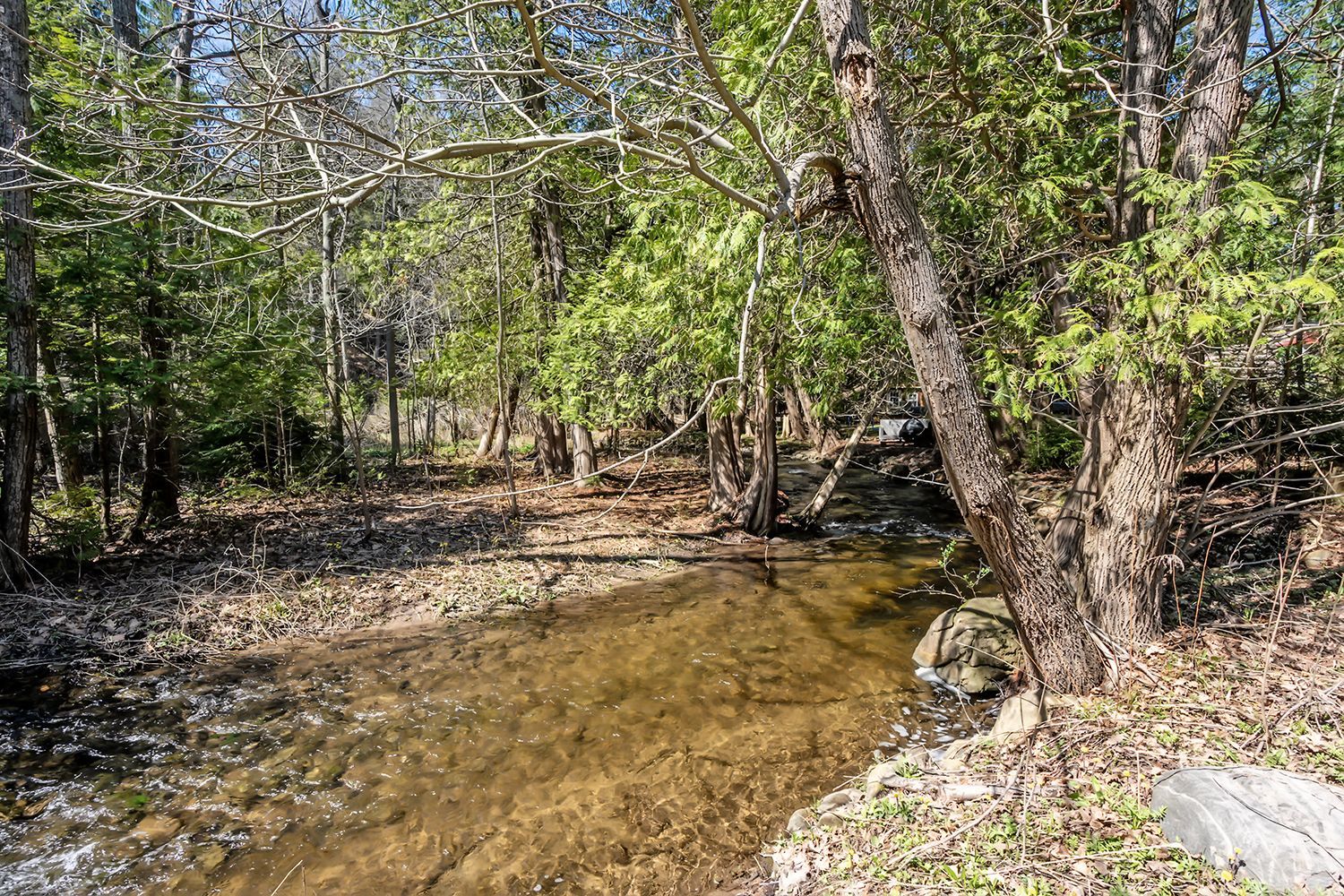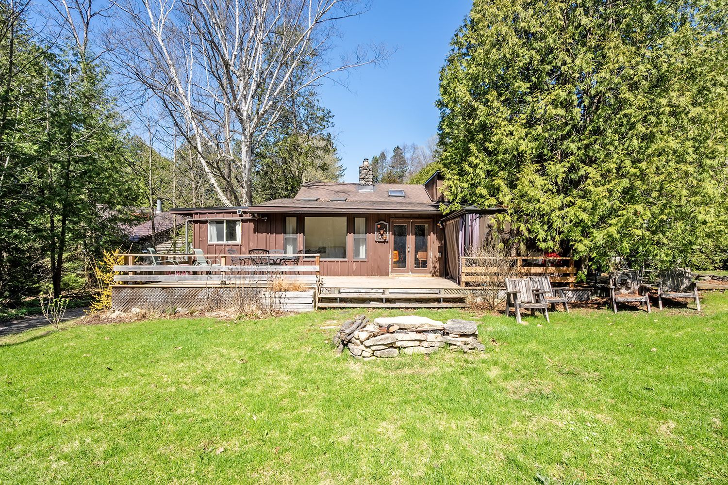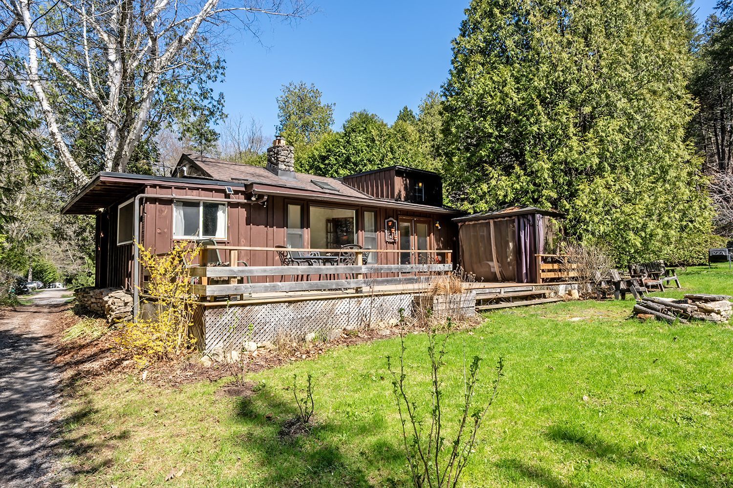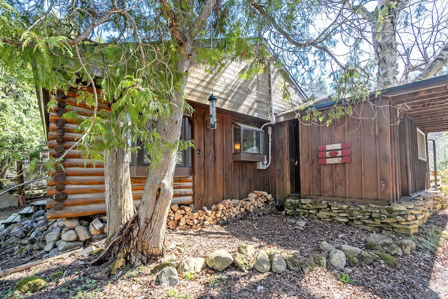 Nestled within the sought-after cedar springs community club, this charming 3 bedroom plus den, seasonal recreational rustic log cottage, offers the perfect blend of nature, comfort, and vibrant community living. Set on a beautifully treed lot at the end of a court with a peaceful creek backdrop, this seasonal retreat invites you to unwind and enjoy cottage life at its finest without the long drive and bumper to bumper traffic. A flagstone pathway leads to the inviting double wood entry, opening into a vaulted foyer with wide plank floors and classic log and wood finishes throughout. The open-concept living and dining area is centered around a stunning floor-to-ceiling stone wood-burning fireplace, creating a warm and welcoming space for gatherings. Skylights and vaulted ceilings enhance the bright, airy feel, while the updated kitchen features granite countertops, stainless steel appliances, and charming open shelving. Three + versatile bedrooms, including a loft-style retreat, provide plenty of space for family and guests. The updated bath blends rustic character with modern touches. Step outside to the expansive deck and take in serene views of the creek and surrounding nature, perfect for relaxing or entertaining. Enjoy a true resort like lifestyle with access to a private beach, a 9 hole golf course, pickleball court, red clay tennis court, sports field, playground, and a vibrant calendar of community events. With direct access to the bruce trail, outdoor enthusiasts will love the endless hiking opportunities and high-speed internet availability makes it easy to stay connected if needed. The shed offers excellent potential to be converted into a bunkie subject to approval. Skip muskoka, this is effortless summer living at its finest, right where convenience meets lifestyle.