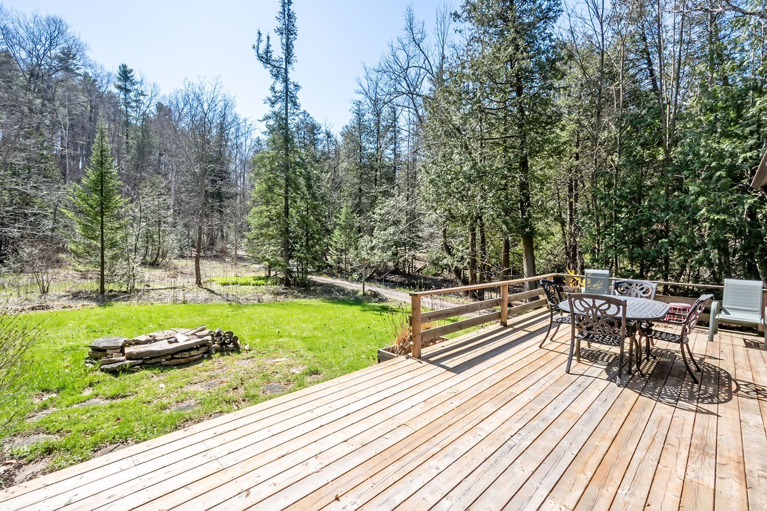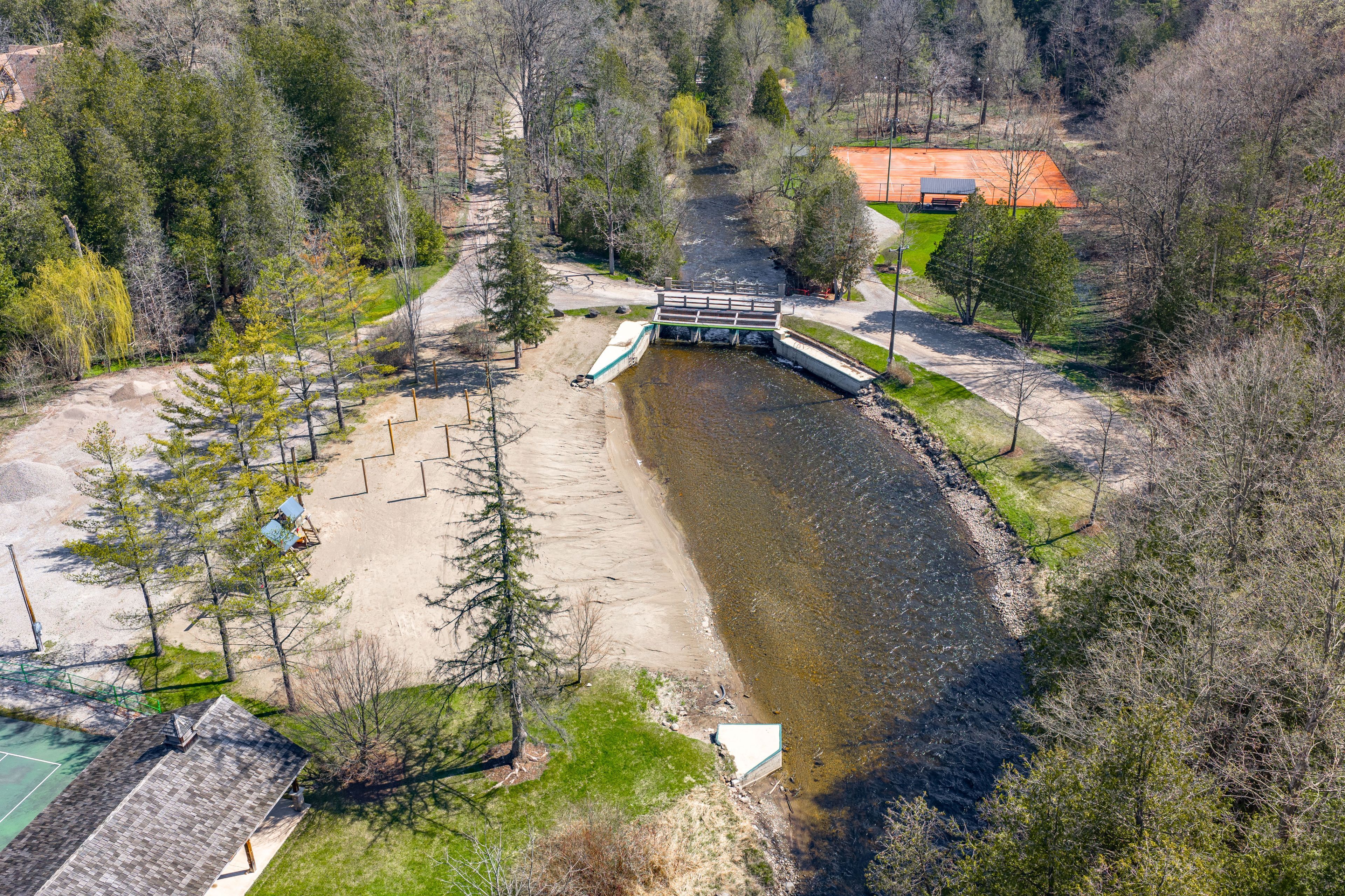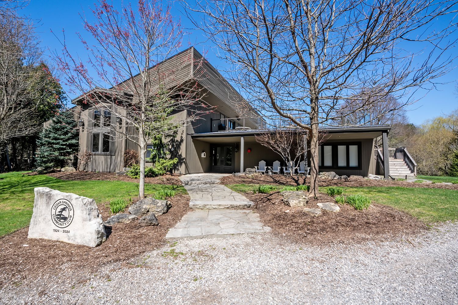Nestled within the sought-after cedar springs community club, this charming 3 bedroom plus den, seasonal recreational rustic log cottage, offers the perfect blend of nature, comfort, and vibrant community living. Set on a beautifully treed lot at the end of a court with a peaceful creek backdrop, this seasonal retreat invites you to unwind and enjoy cottage life at its finest without the long drive and bumper to bumper traffic. A flagstone pathway leads to the inviting double wood entry, opening into a vaulted foyer with wide plank floors and classic log and wood finishes throughout. The open-concept living and dining area is centered around a stunning floor-to-ceiling stone wood-burning fireplace, creating a warm and welcoming space for gatherings. Skylights and vaulted ceilings enhance the bright, airy feel, while the updated kitchen features granite countertops, stainless steel appliances, and charming open shelving. Three + versatile bedrooms, including a loft-style retreat, provide plenty of space for family and guests. The updated bath blends rustic character with modern touches. Step outside to the expansive deck and take in serene views of the creek and surrounding nature, perfect for relaxing or entertaining. Enjoy a true resort like lifestyle with access to a private beach, a 9 hole golf course, pickleball court, red clay tennis court, sports field, playground, and a vibrant calendar of community events. With direct access to the bruce trail, outdoor enthusiasts will love the endless hiking opportunities and high-speed internet availability makes it easy to stay connected if needed. The shed offers excellent potential to be converted into a bunkie subject to approval. Skip muskoka, this is effortless summer living at its finest, right where convenience meets lifestyle.