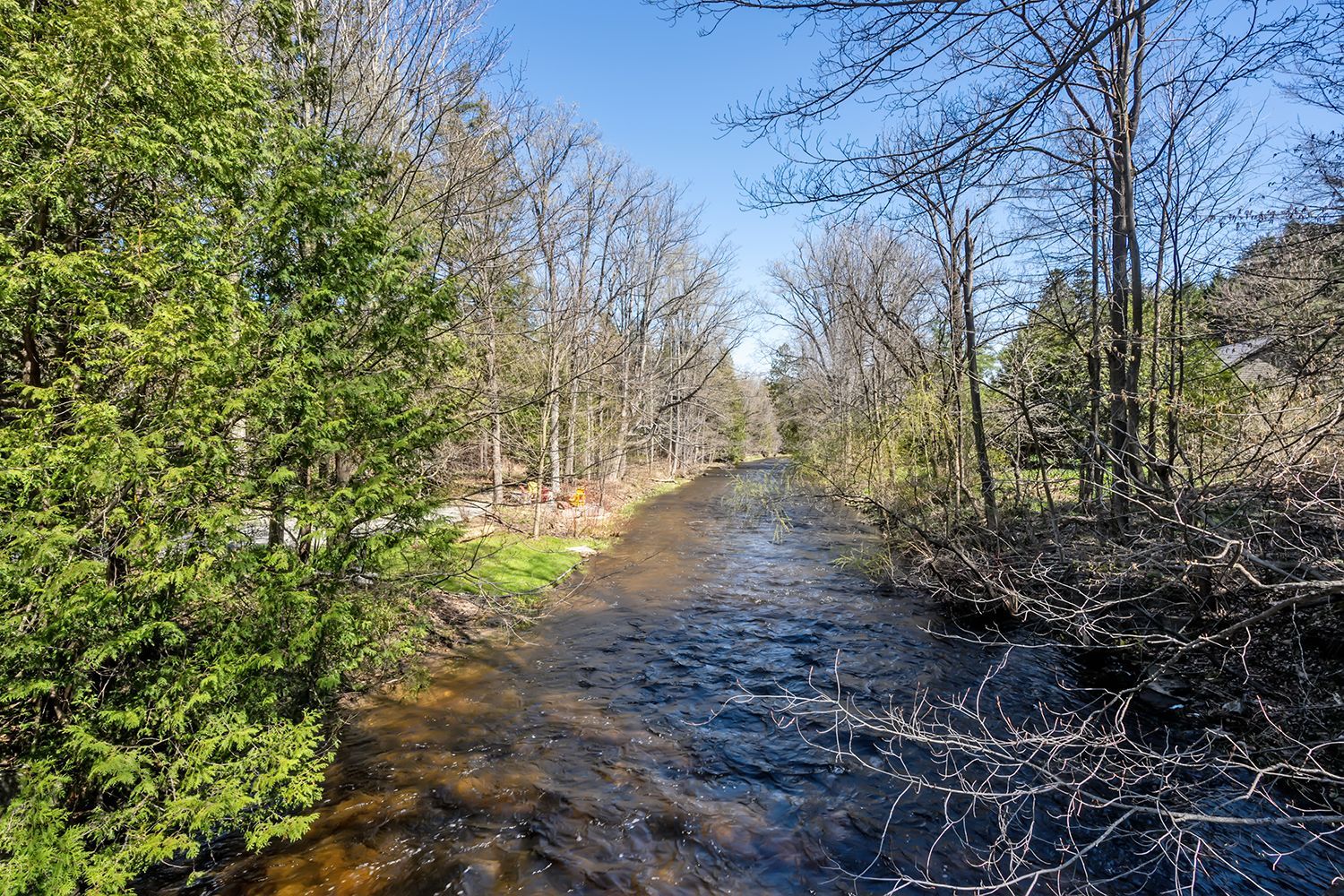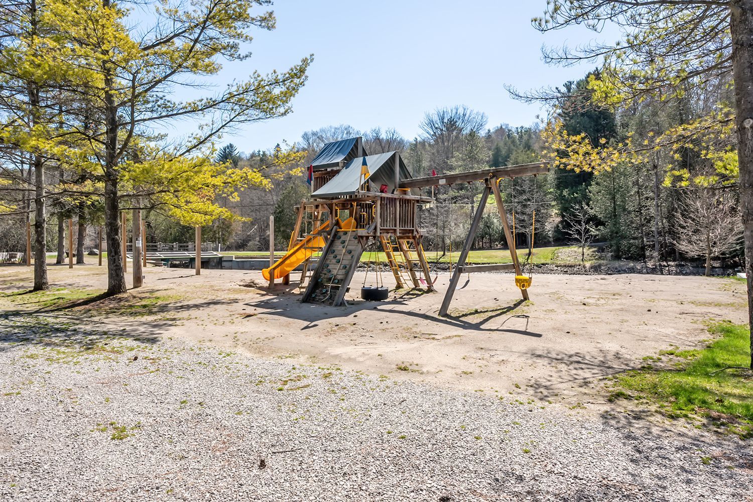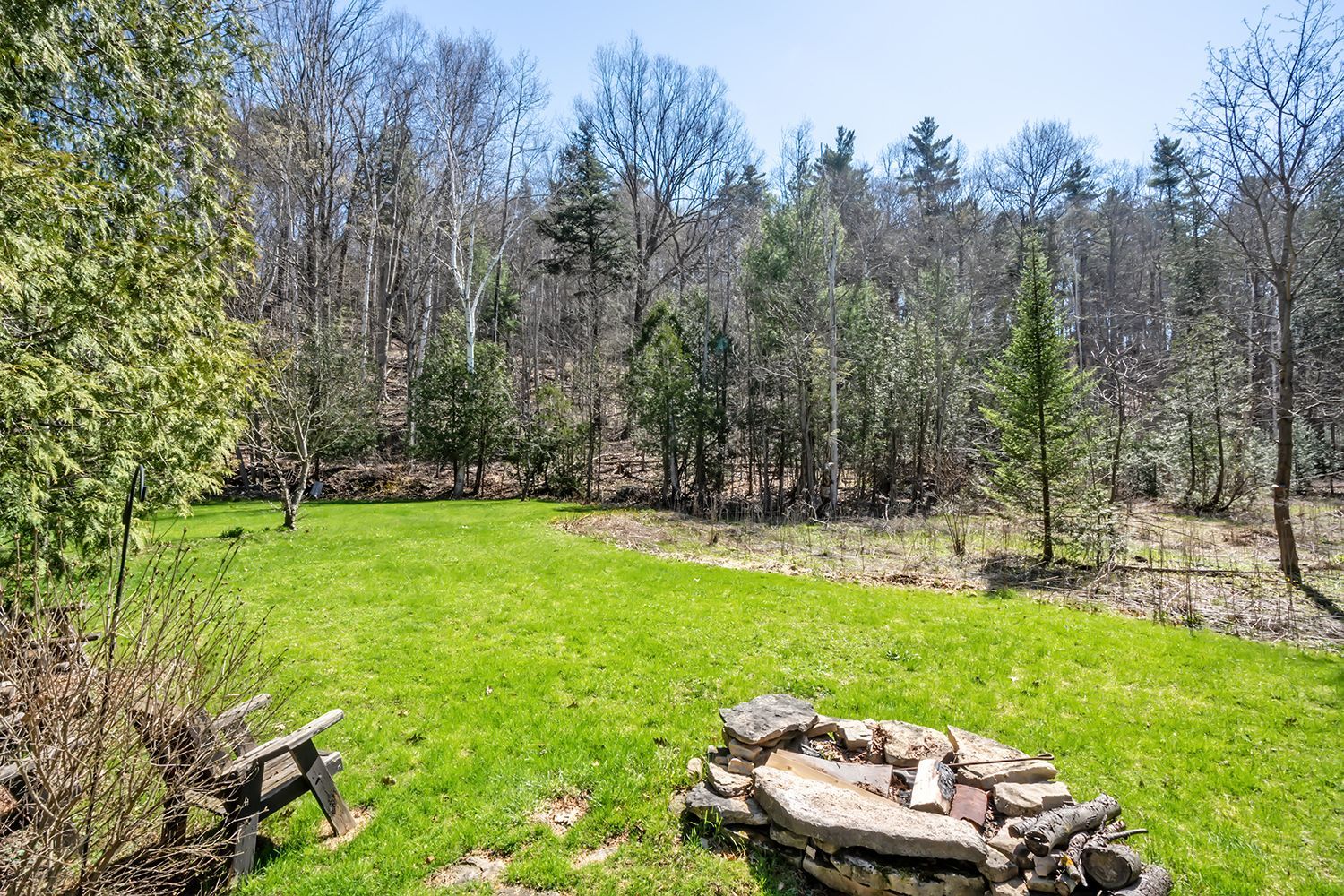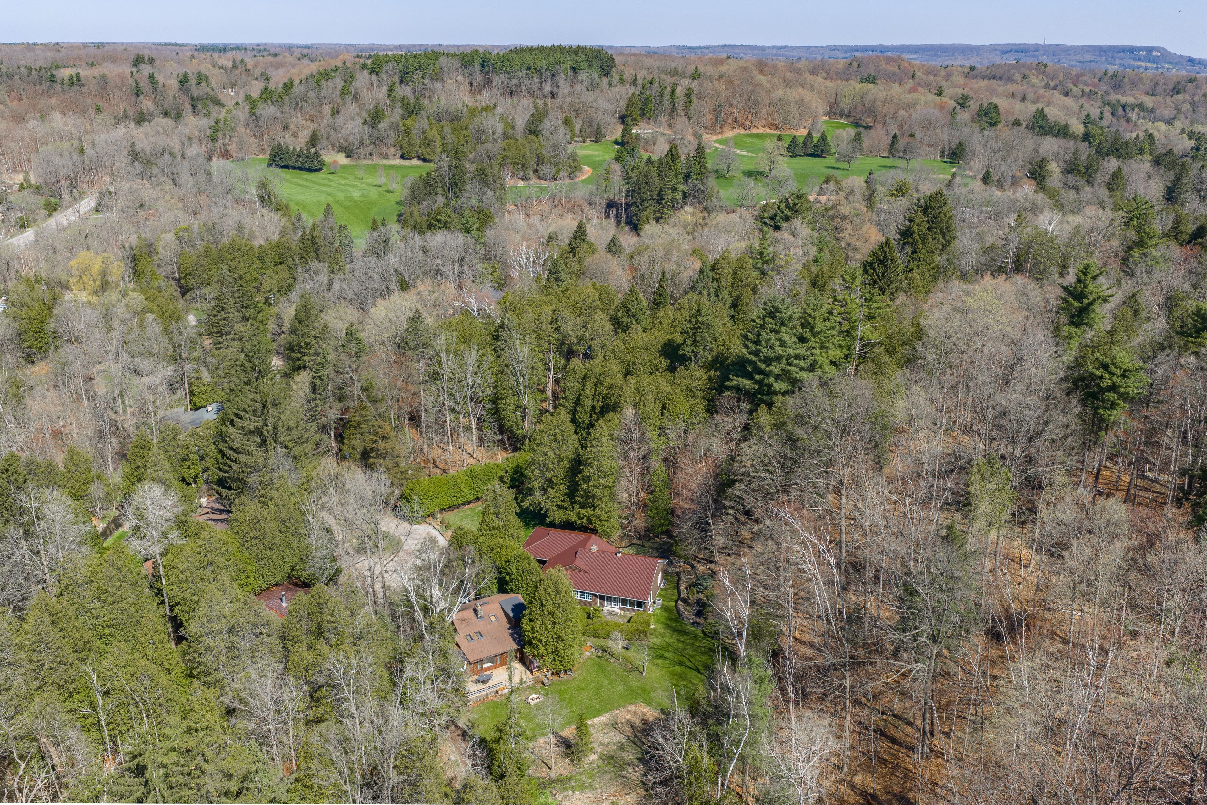 Nestled within the sought-after cedar springs community club, this charming 3 bedroom plus den, seasonal recreational rustic log cottage, offers the perfect blend of nature, comfort, and vibrant community living. Set on a beautifully treed lot at the end of a court with a peaceful creek backdrop, this seasonal retreat invites you to unwind and enjoy cottage life at its finest without the long drive and bumper to bumper traffic. A flagstone pathway leads to the inviting double wood entry, opening into a vaulted foyer with wide plank floors and classic log and wood finishes throughout. The open-concept living and dining area is centered around a stunning floor-to-ceiling stone wood-burning fireplace, creating a warm and welcoming space for gatherings. Skylights and vaulted ceilings enhance the bright, airy feel, while the updated kitchen features granite countertops, stainless steel appliances, and charming open shelving. Three + versatile bedrooms, including a loft-style retreat, provide plenty of space for family and guests. The updated bath blends rustic character with modern touches. Step outside to the expansive deck and take in serene views of the creek and surrounding nature, perfect for relaxing or entertaining. Enjoy a true resort like lifestyle with access to a private beach, a 9 hole golf course, pickleball court, red clay tennis court, sports field, playground, and a vibrant calendar of community events. With direct access to the bruce trail, outdoor enthusiasts will love the endless hiking opportunities and high-speed internet availability makes it easy to stay connected if needed. The shed offers excellent potential to be converted into a bunkie subject to approval. Skip muskoka, this is effortless summer living at its finest, right where convenience meets lifestyle.