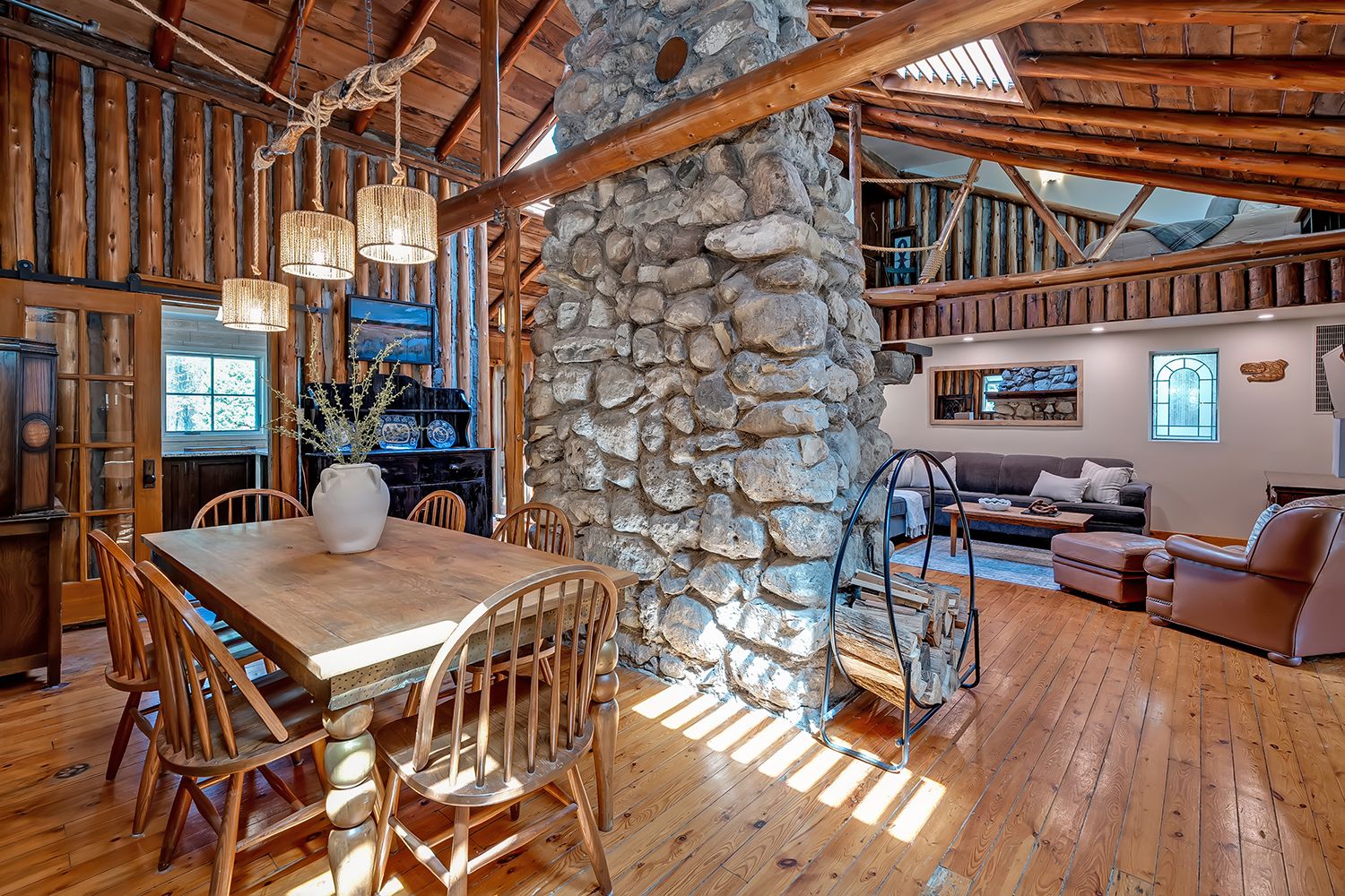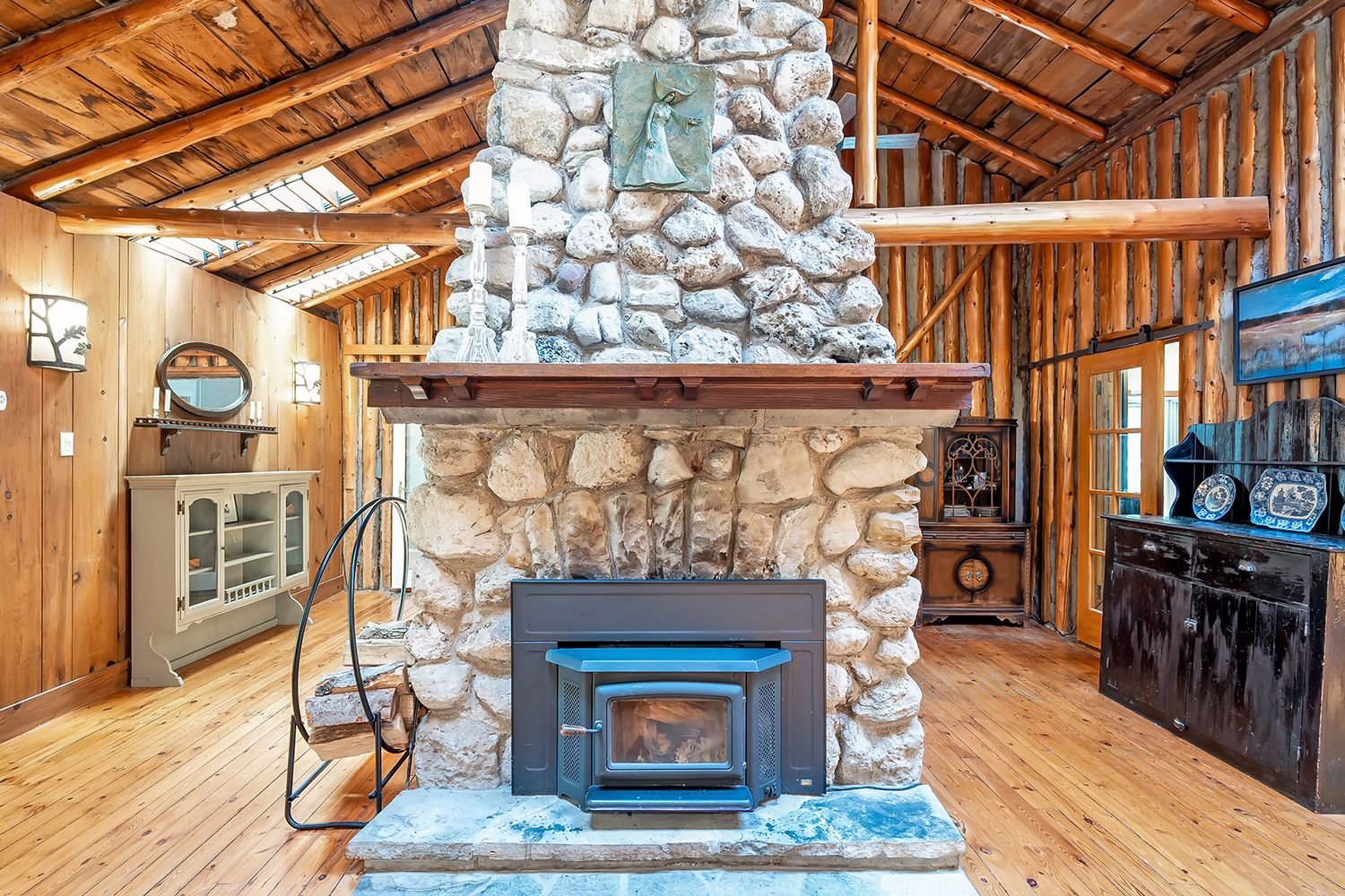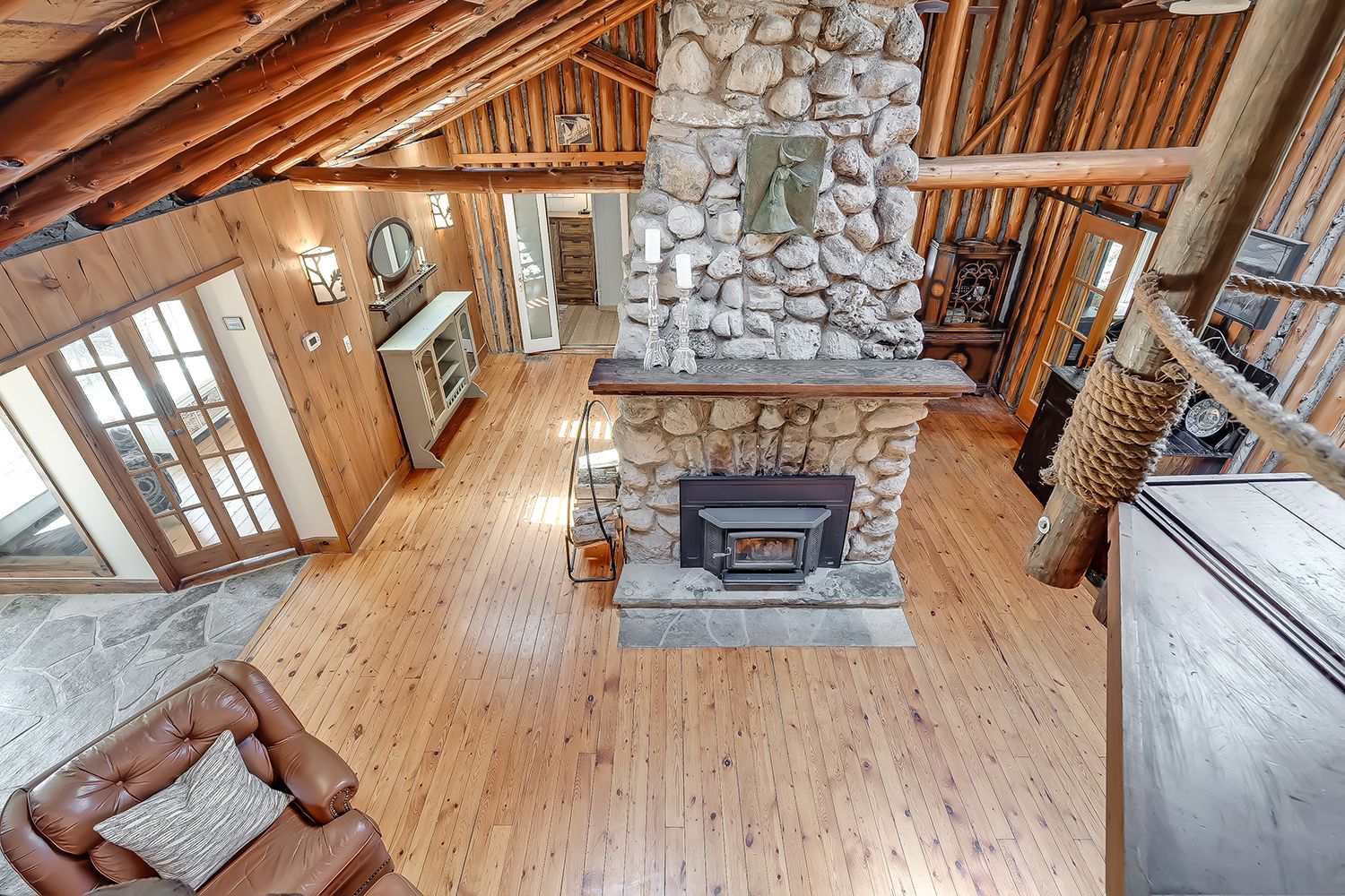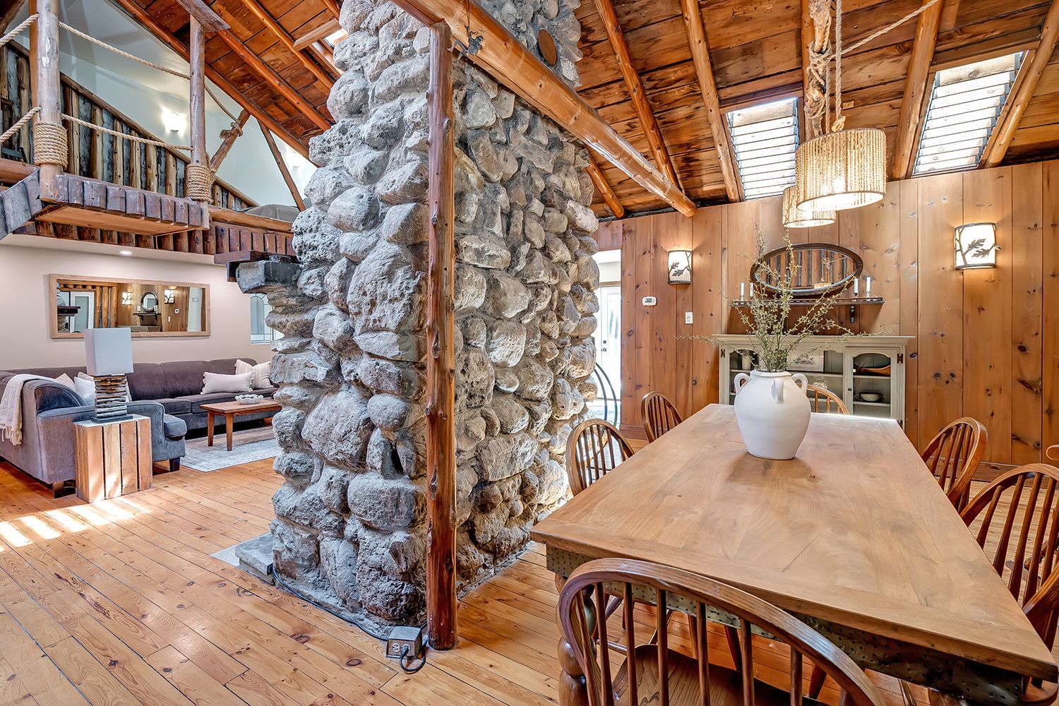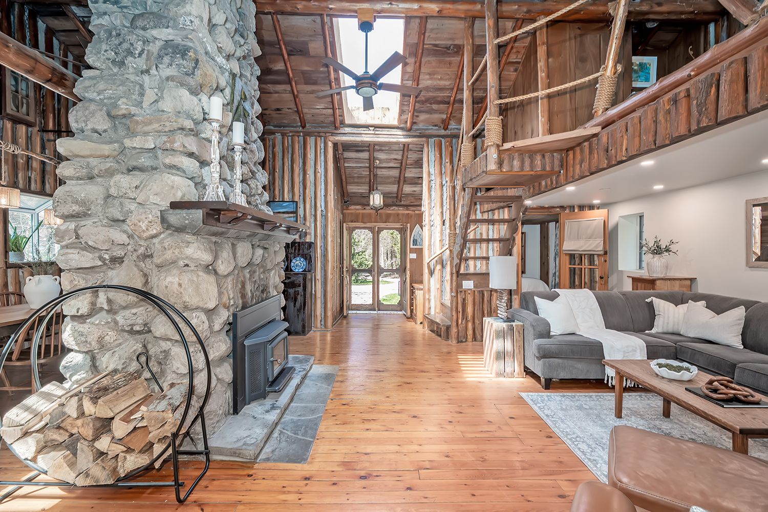 • Open-concept living area features a large stone fireplace for cozy gatherings.