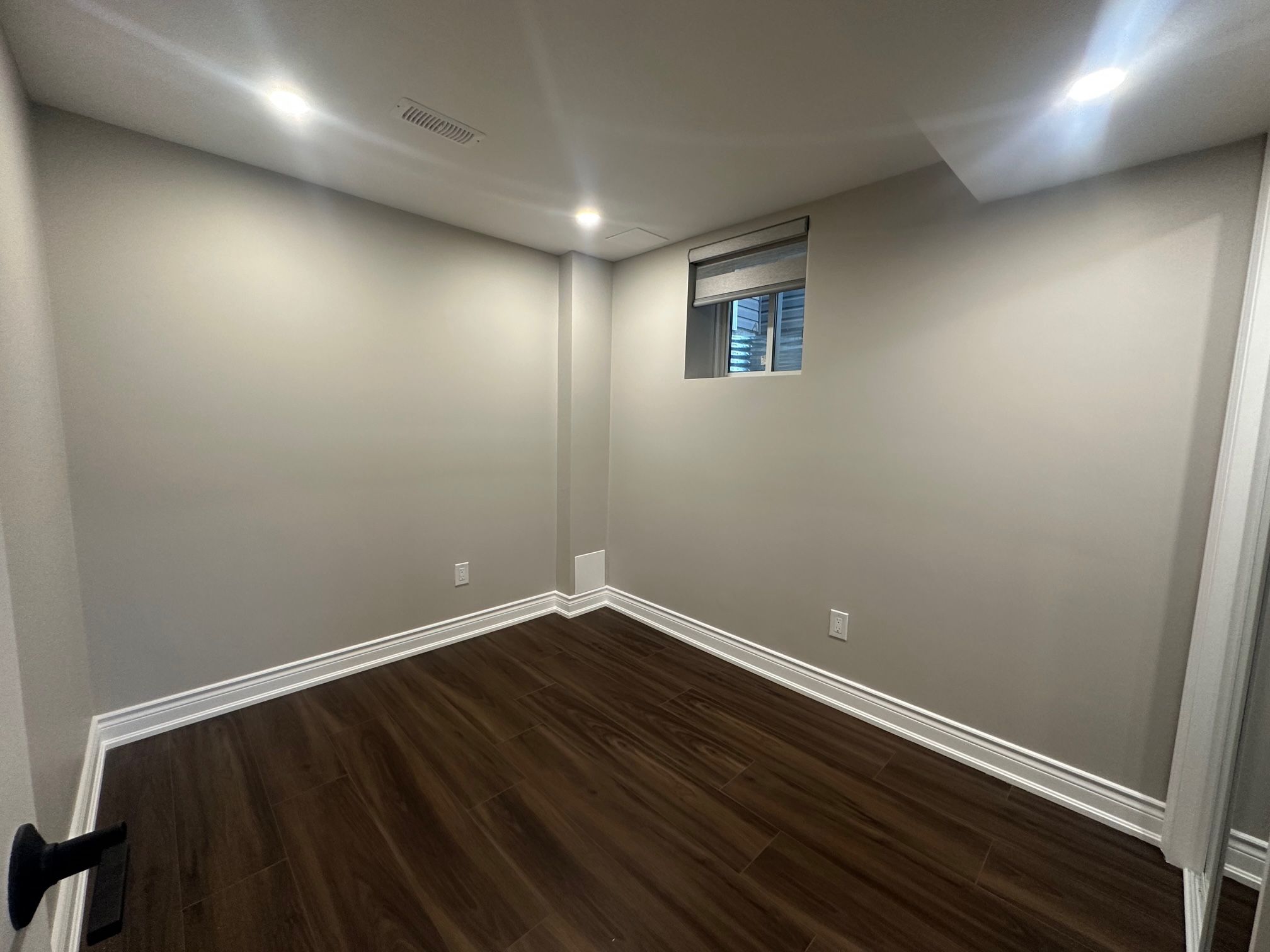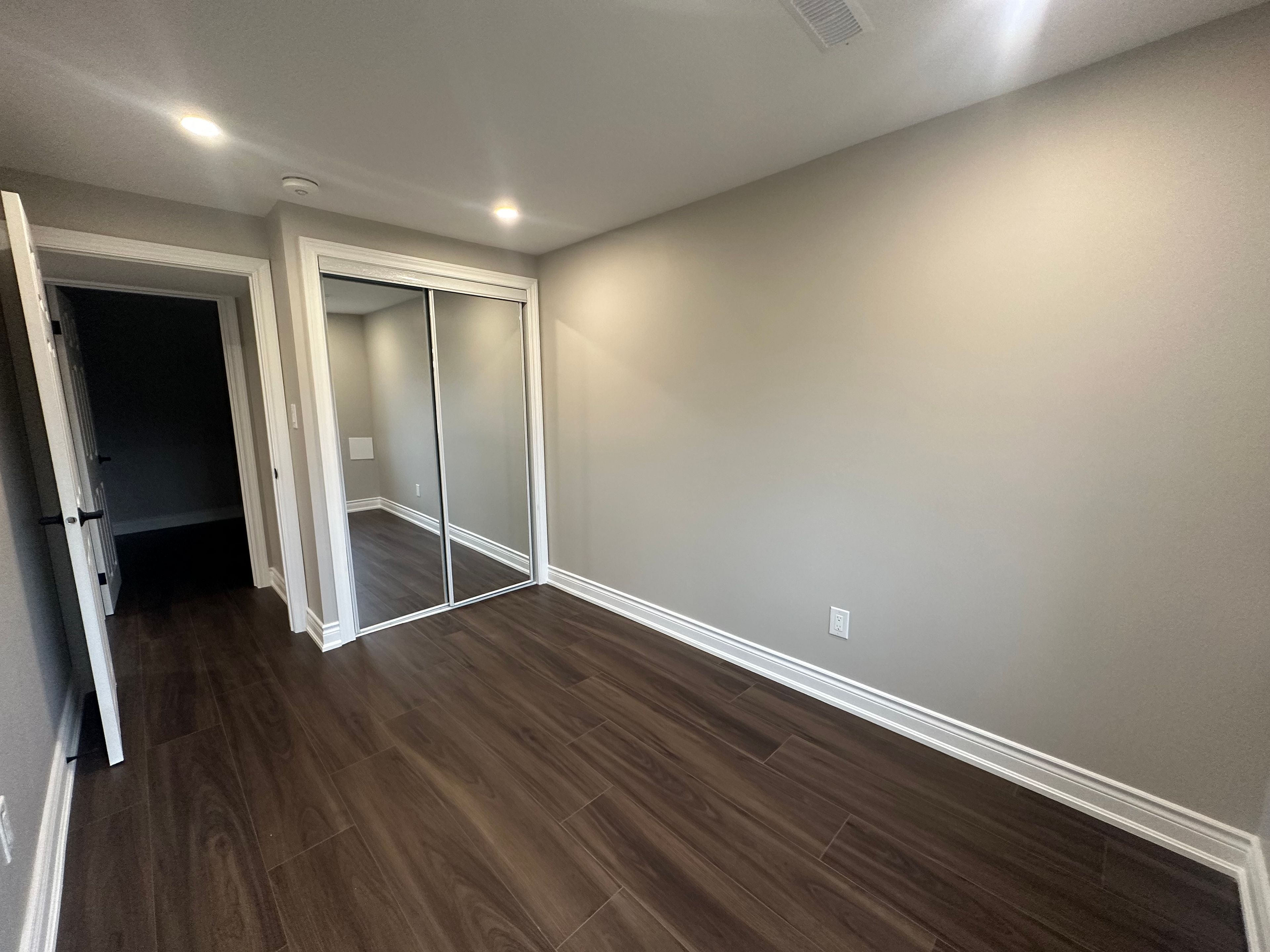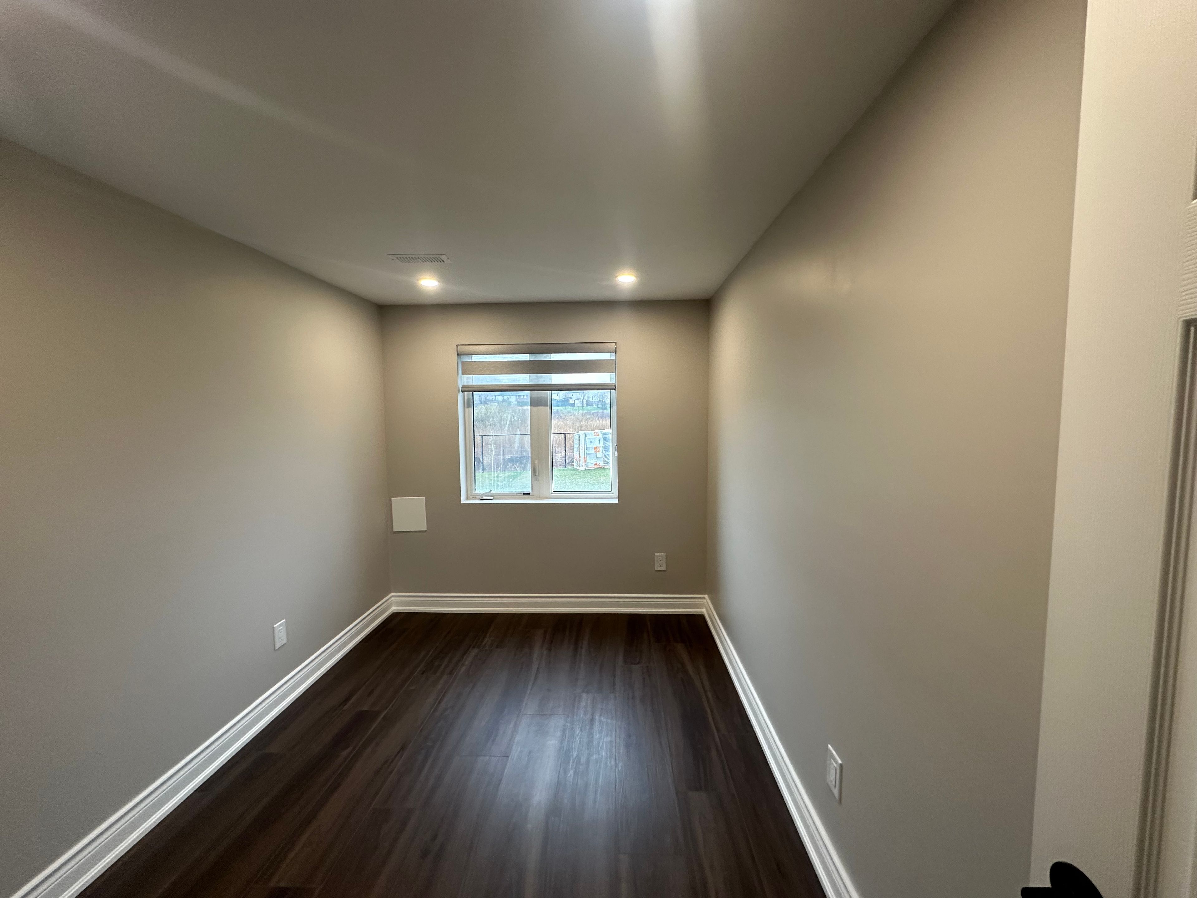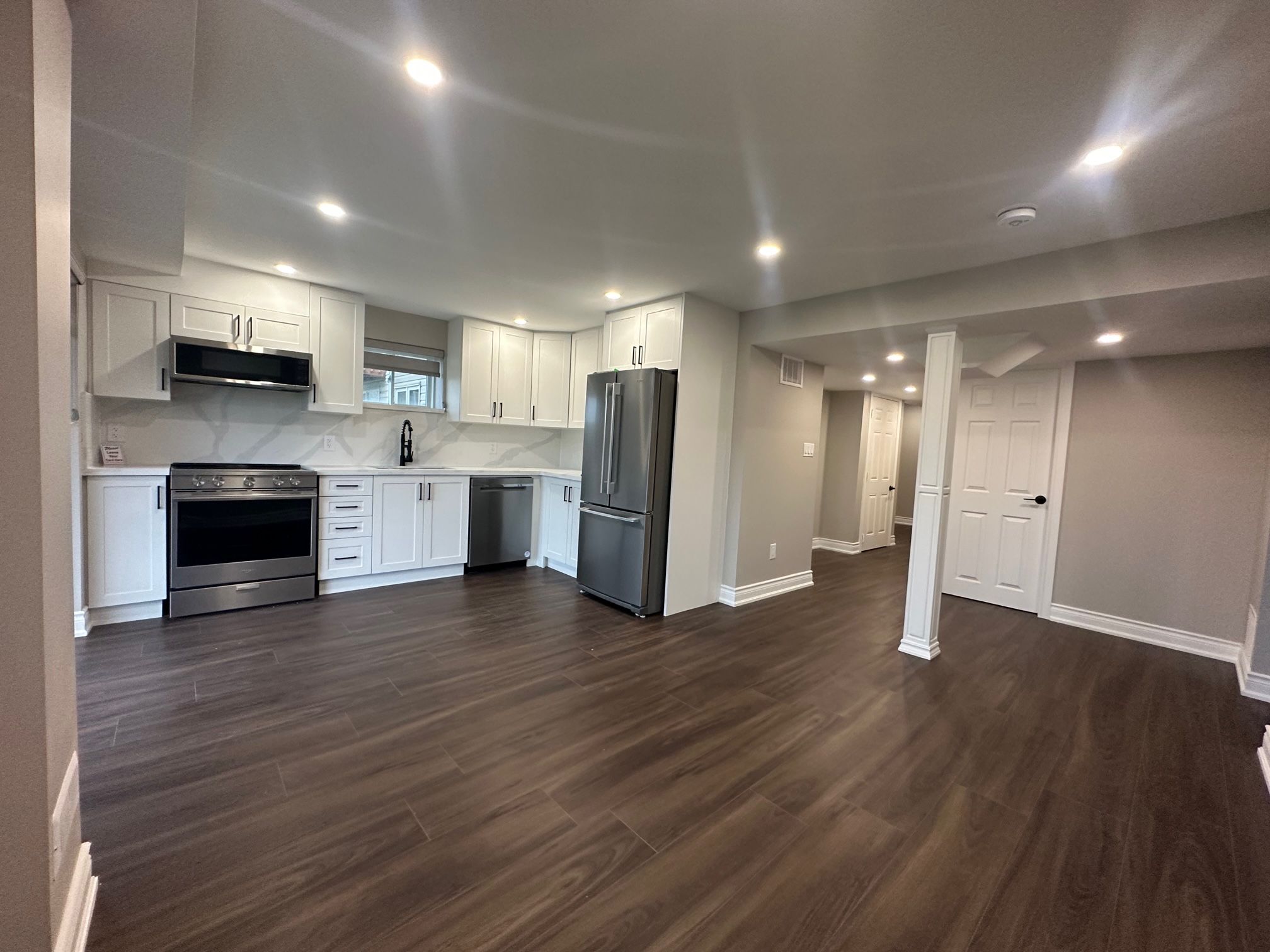 Fall in love w this charming legal walkout 2 bedrooms +den apartment. Practically 3 rooms. Sep side entrance. Five star finishing, very bright & warm 2 decent-sized bedrooms + an enclosed den w a window (can be used as a 3rd room). Carpet-free quality vinyl flooring. Open concept w high-end quality finishes: custom blinds, dimming led spotlights. Modern spacious white kitchen w plenty of cabinets & quartz countertop space, soft closing drawers and cabinets,quartz backsplash!! High-end ss appls (dd fridge, dishwasher, b/i microwave & electric stove). 3 pcs spa-like bath w spacious standing glass shower, heated mirror w b/i lead light. Private laundry w large capacity washer & dryer. 1 designated parking space + plenty of street parking. Bonuses: plenty of storage space under the stairs, rare private backyard on a ravine for morning coffee/ evening bbq. The apartment is perfectly located fronting a park with a splash pad, loads of play areas for kids & a basketball court. Close to all amenities, bus routes, schools, parks & shopping. Don't miss it. Backyard has a separating fence between upper and lower tenants. Can't get better!!! Book ur showing now !!