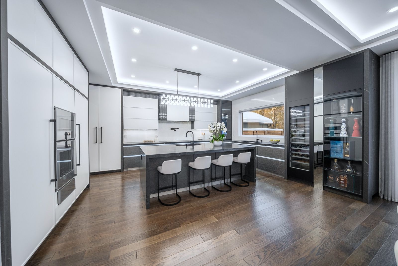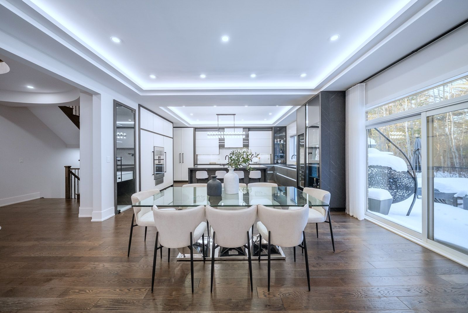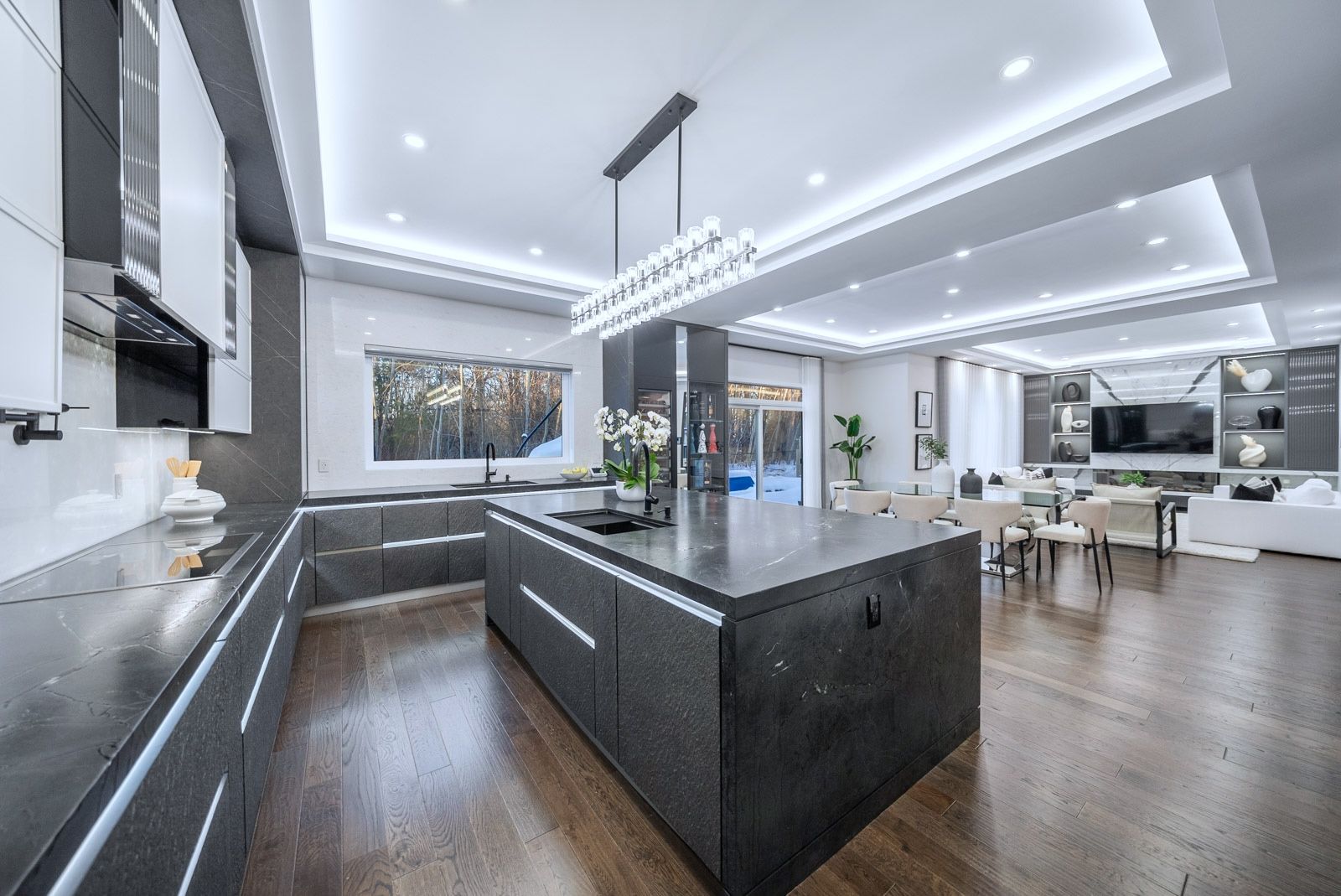 R-e-s-o-r-t-l-i-v-i-n-g-o-n-a-p-r-i-v-a-t-e-c-o-u-r-t-i-n-l-e-b-o-v-i-c-c-a-m-p-u-s! Situated on a quiet & exclusive court with a mature ravine-lined backdrop, this extraordinary residence offers refined luxury living complete with a saltwater pool, award-winning landscaping & a true 3-car garage. Featuring 4+3 bedrooms and 6 bathrooms, the home showcases impeccable craftsmanship throughout, including a custom german-made bau format kitchen with leathered stoned waterfall island, backlit stone backsplash, soaring 10-foot ceilings on the main floor & a dramatic open-to-above rotunda, dripping with natural light. Thoughtfully curated designer finishes, bespoke drapery & a main-floor office enhance both elegance & functionality. The primary retreat offers a spa-inspired ensuite, while a versatile library area provides the option to convert into a fifth bedroom. The fully finished lower level is designed for lifestyle and comfort, featuring a gym, kitchen, nanny quarters & a dedicated hockey room. A rare opportunity to own a statement home in one of vaughan's most prestigious and sought-after communities. **over $500k in upgrades**