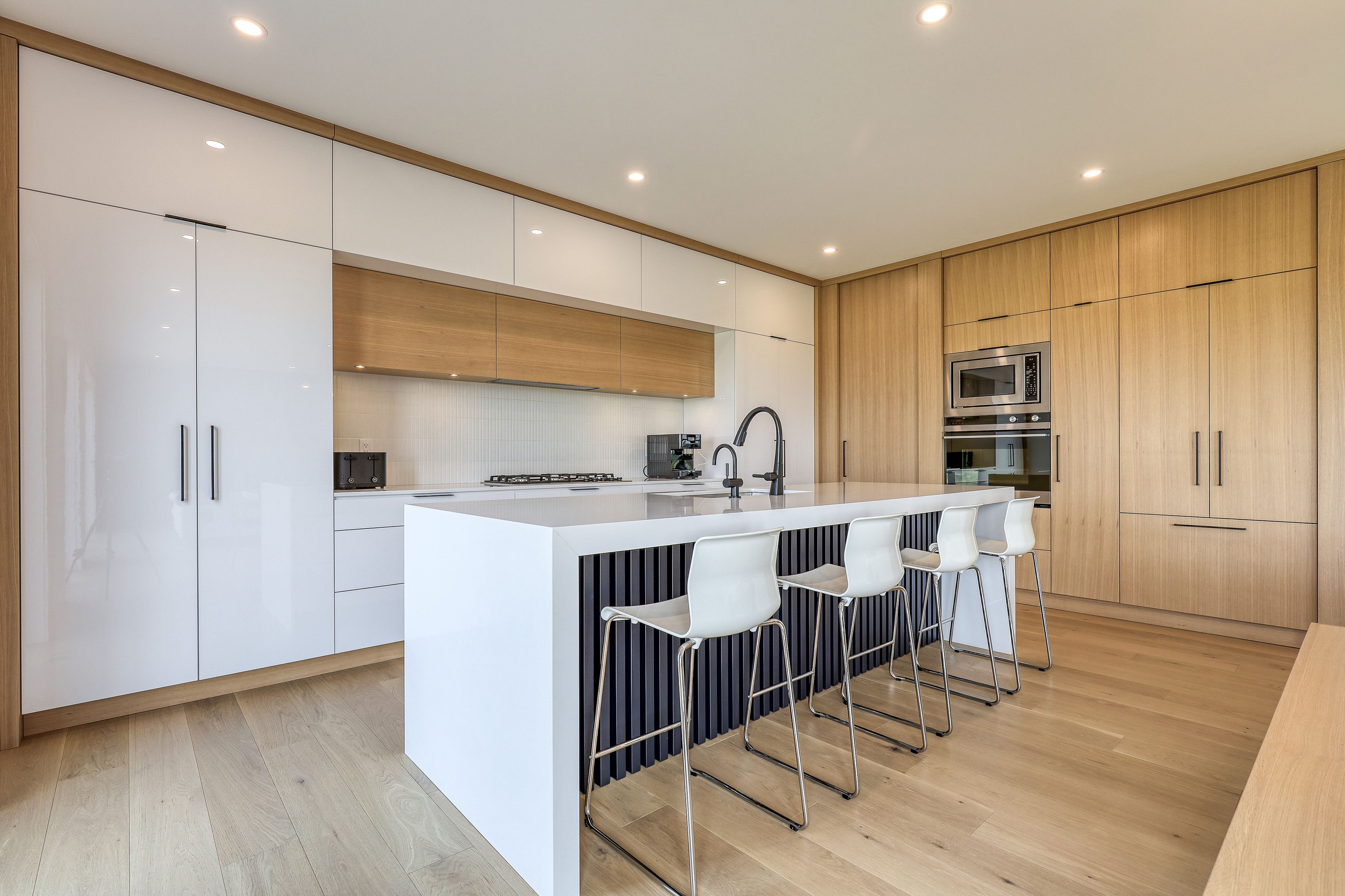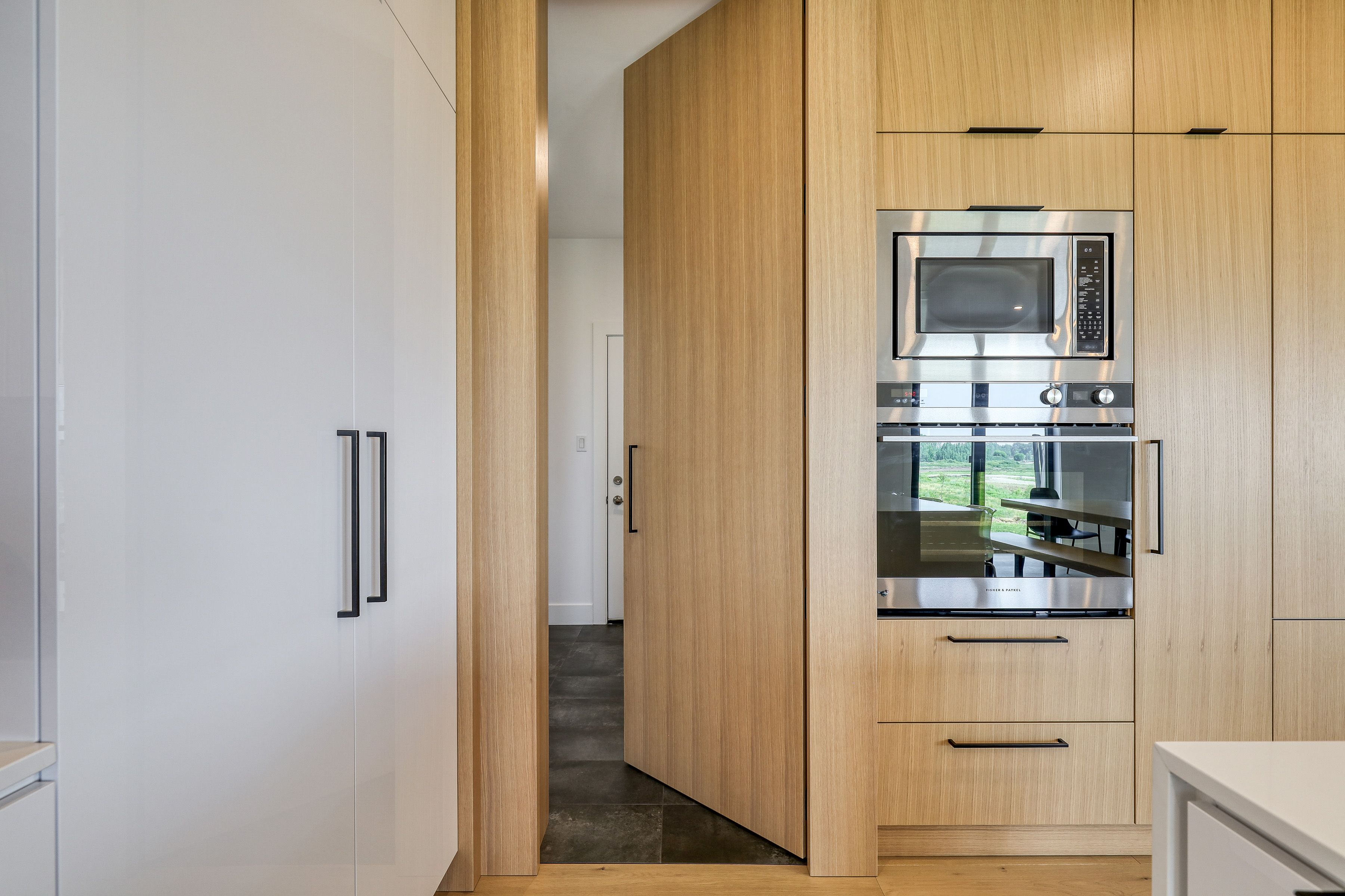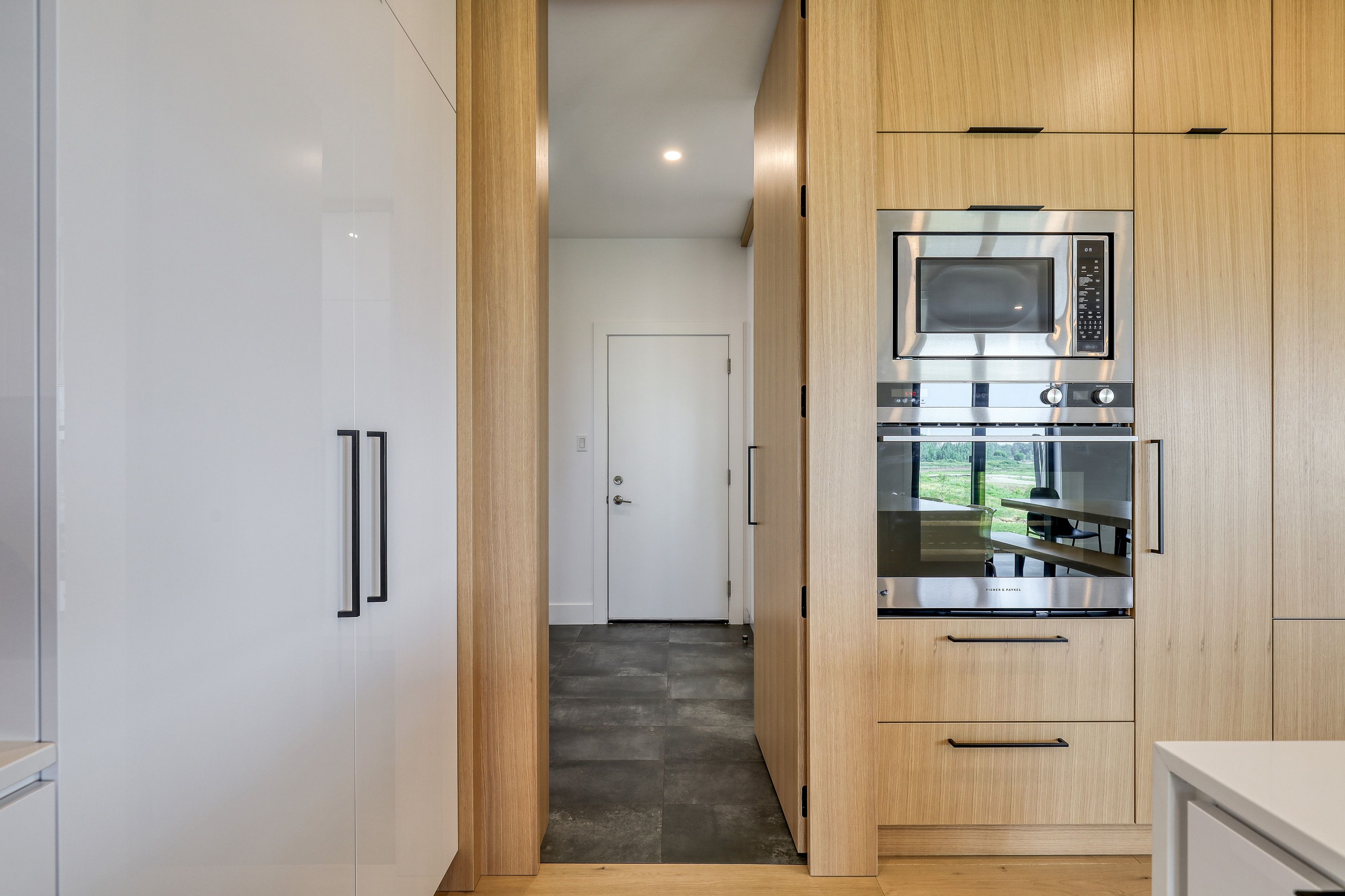 • Kitchen features custom cabinetry and high-end appliances for convenience.