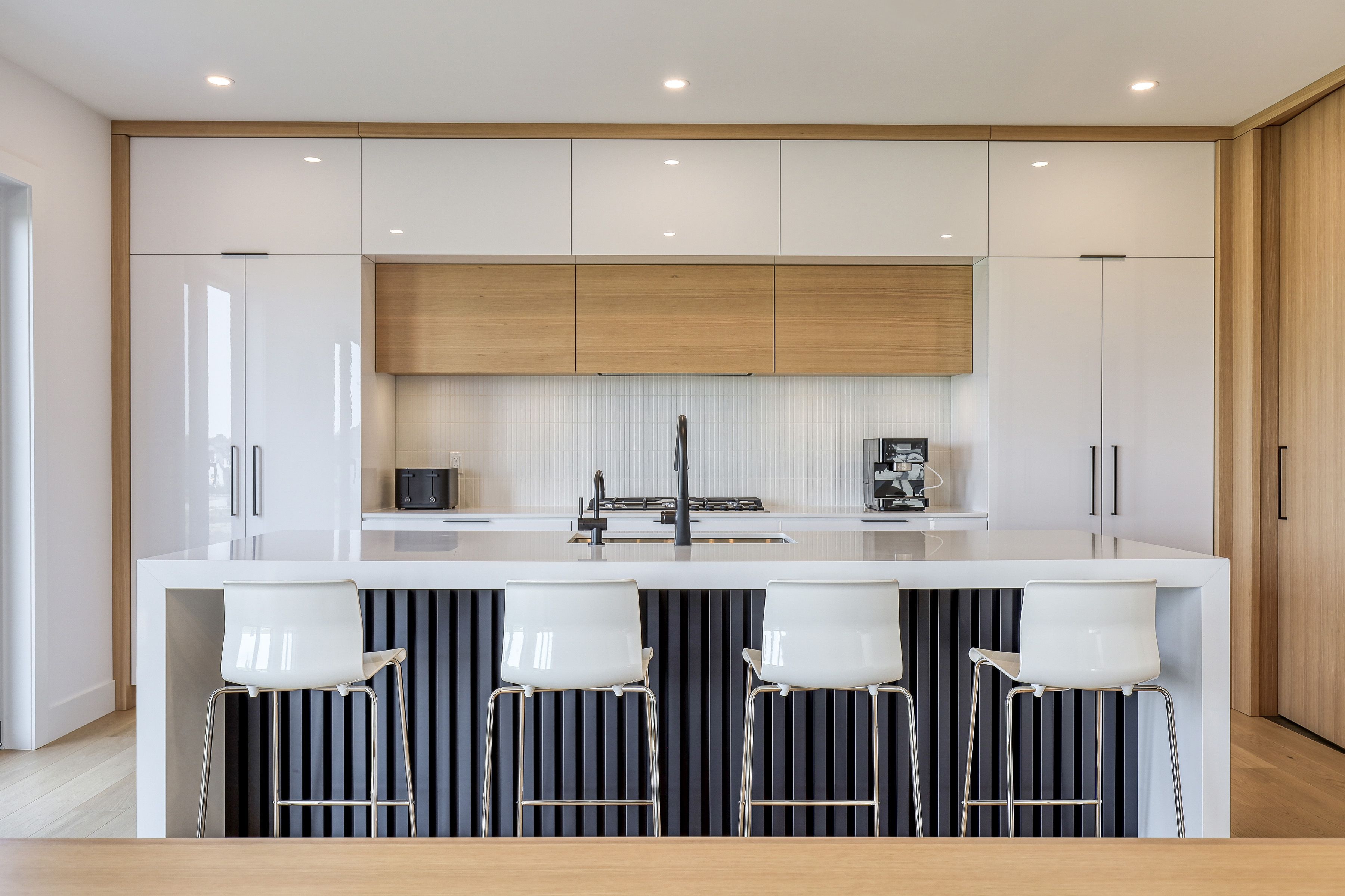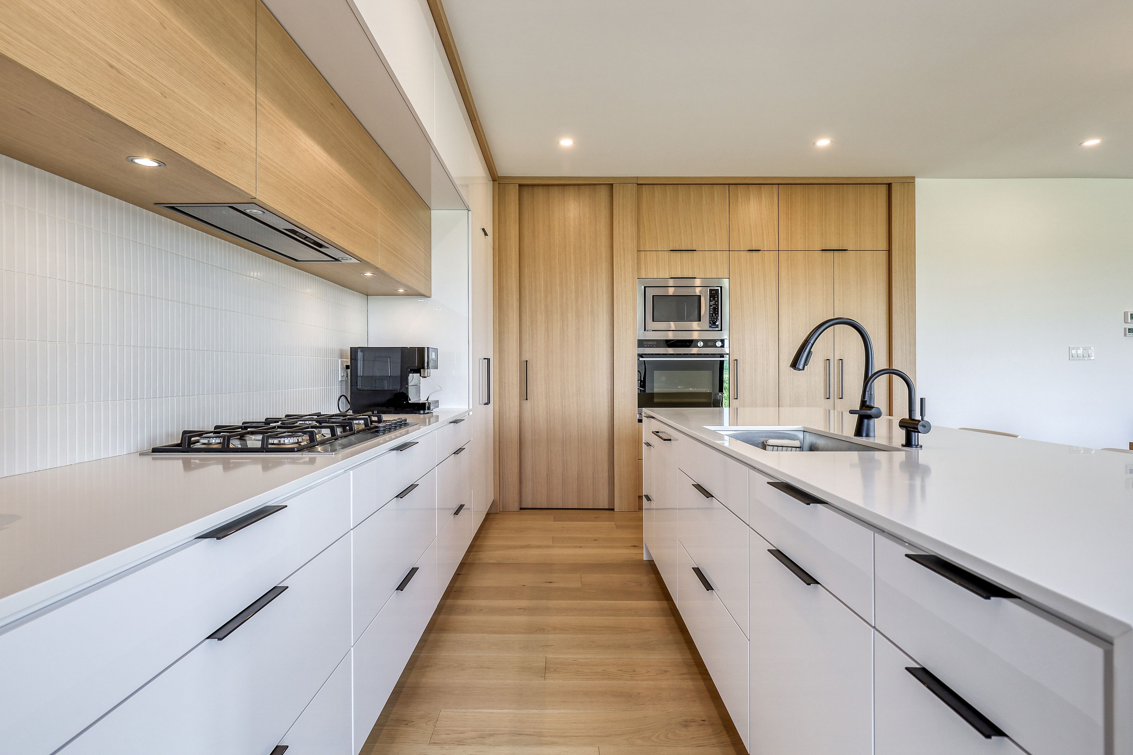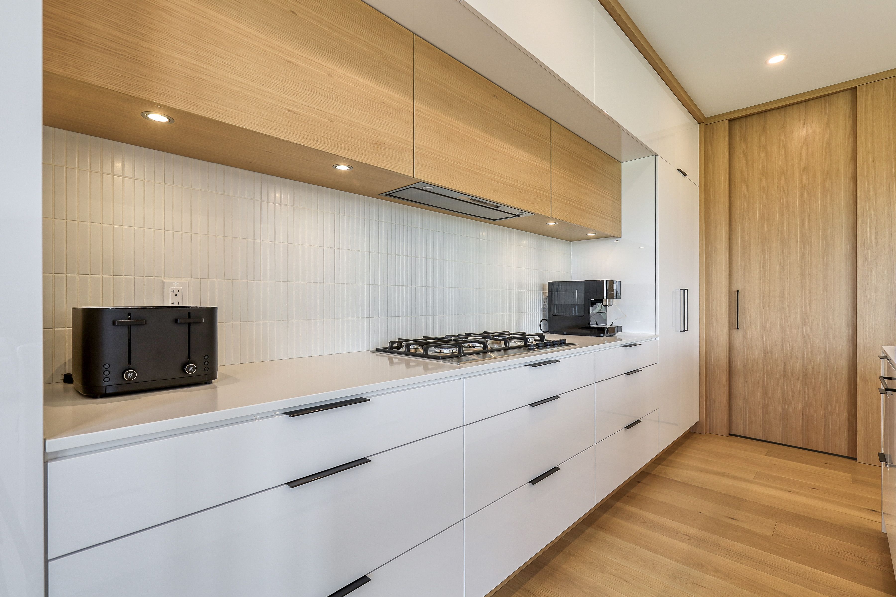 • Kitchen features custom cabinetry and high-end appliances for convenience.