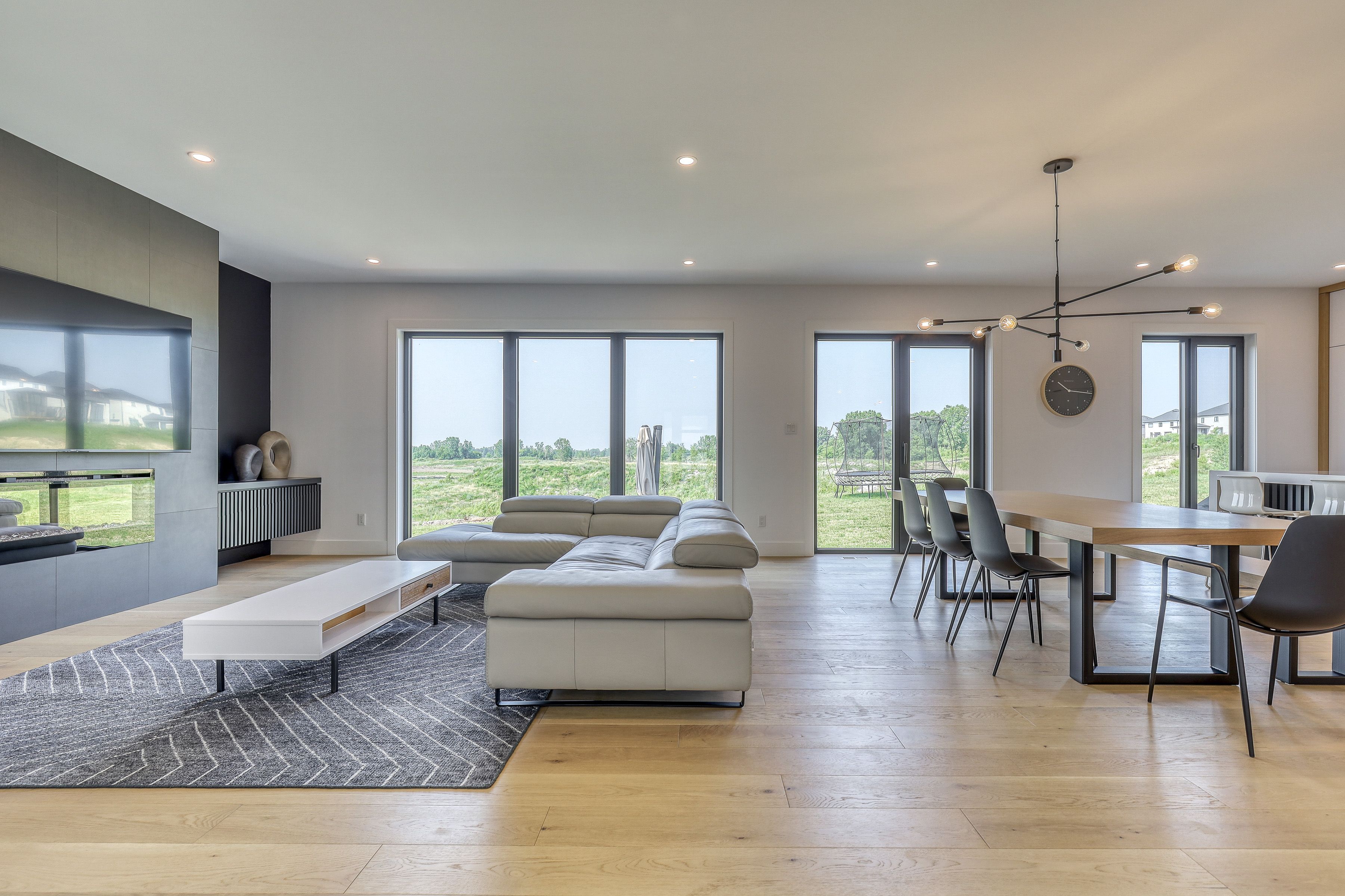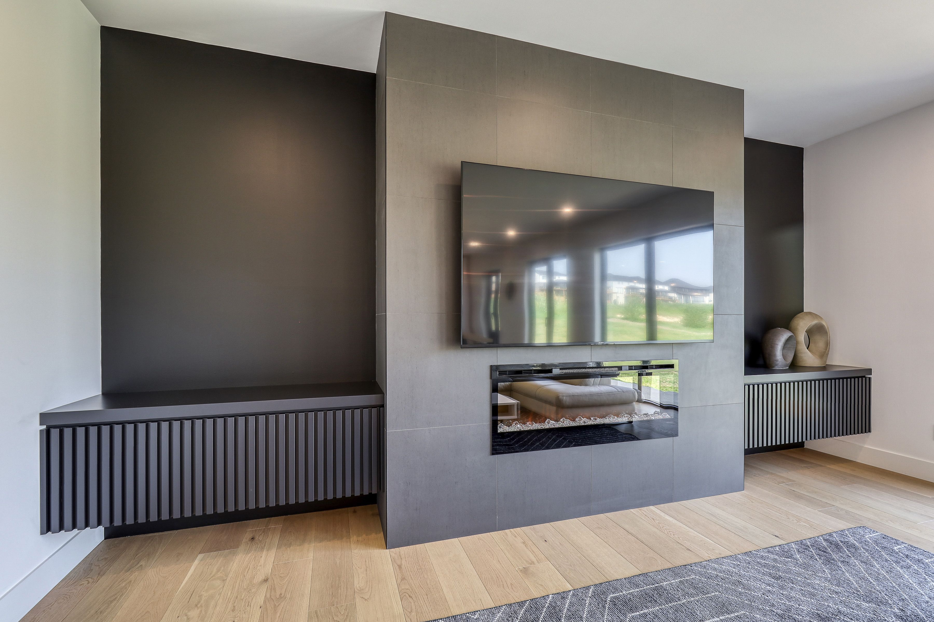 • Open concept living area with fireplace wall ideal for entertaining guests.