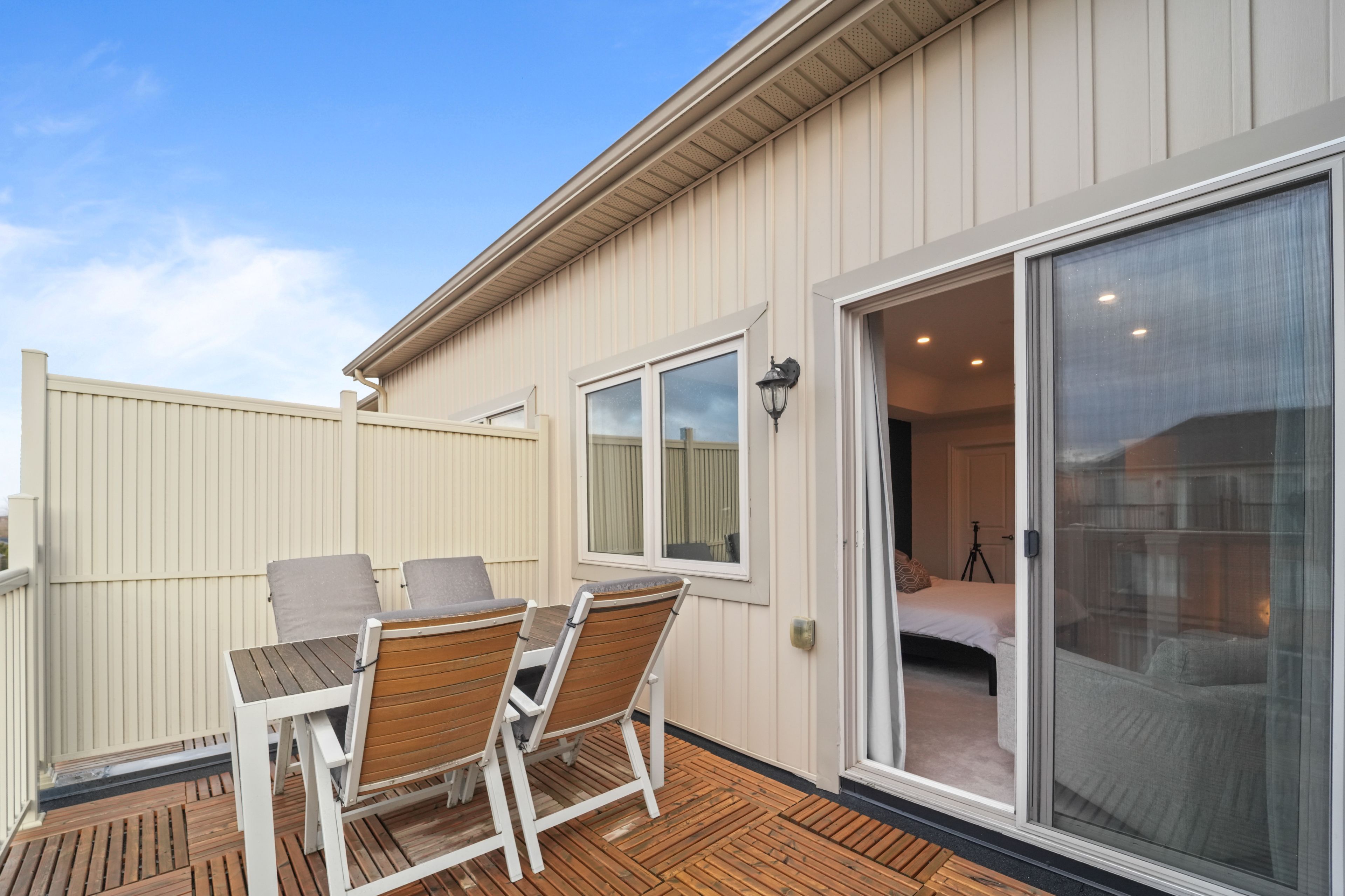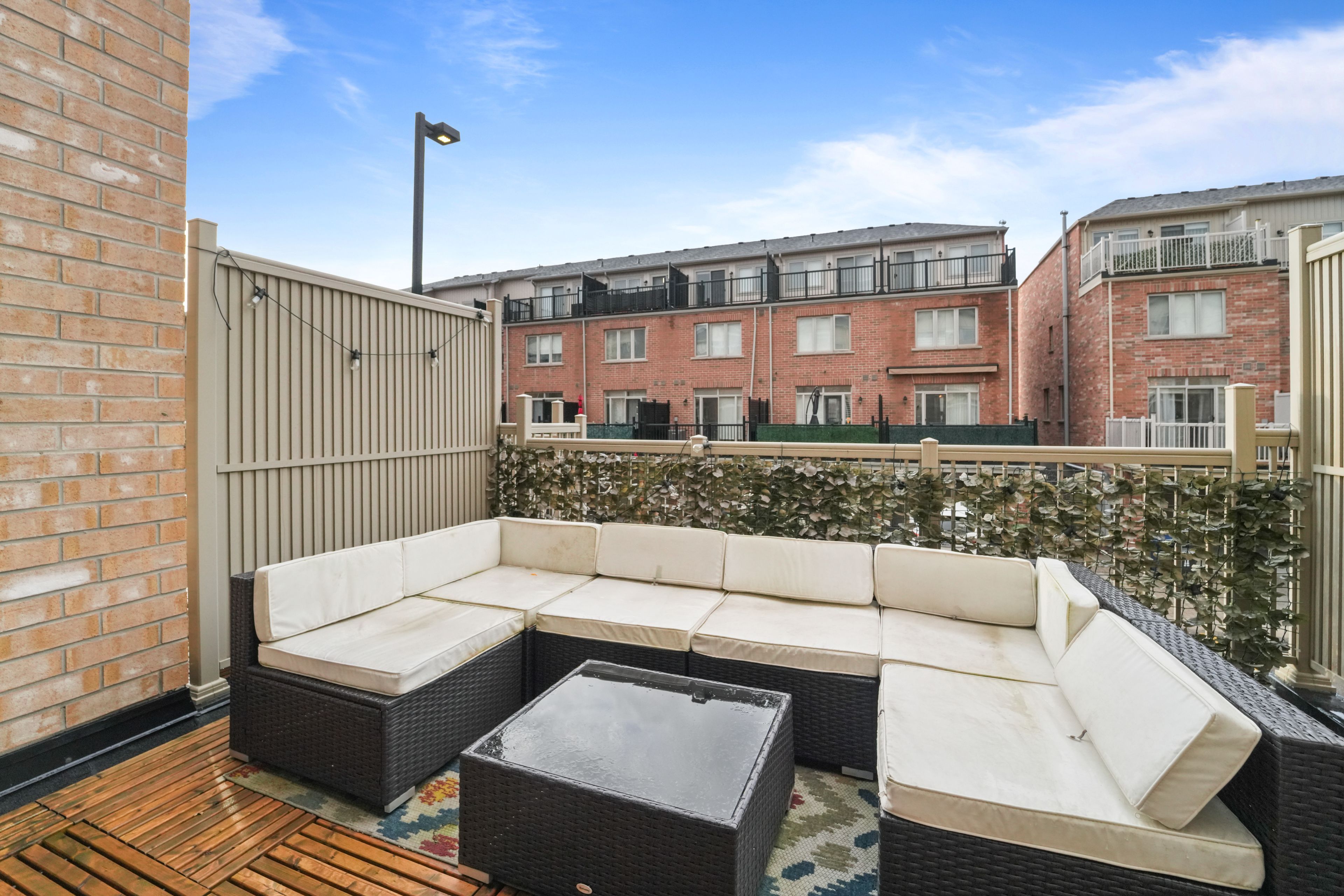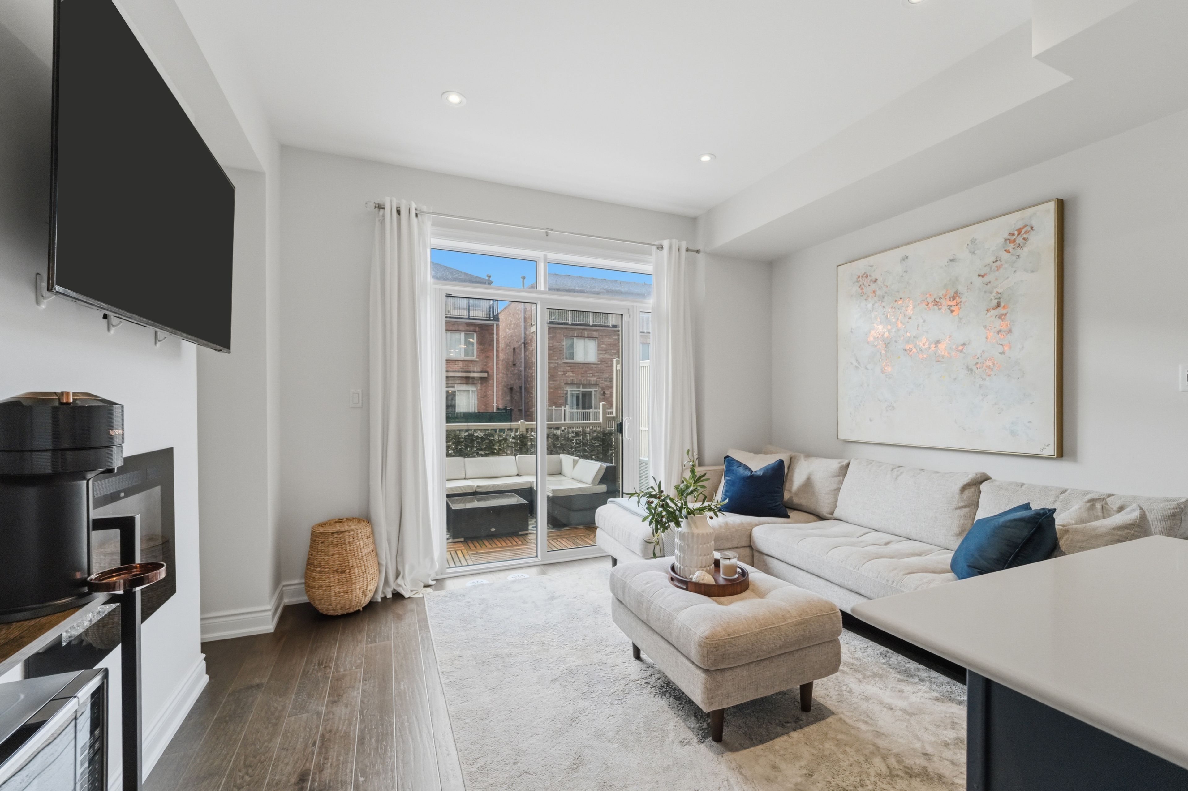 • Sleek electric fireplace and oversized patio deck for entertaining.