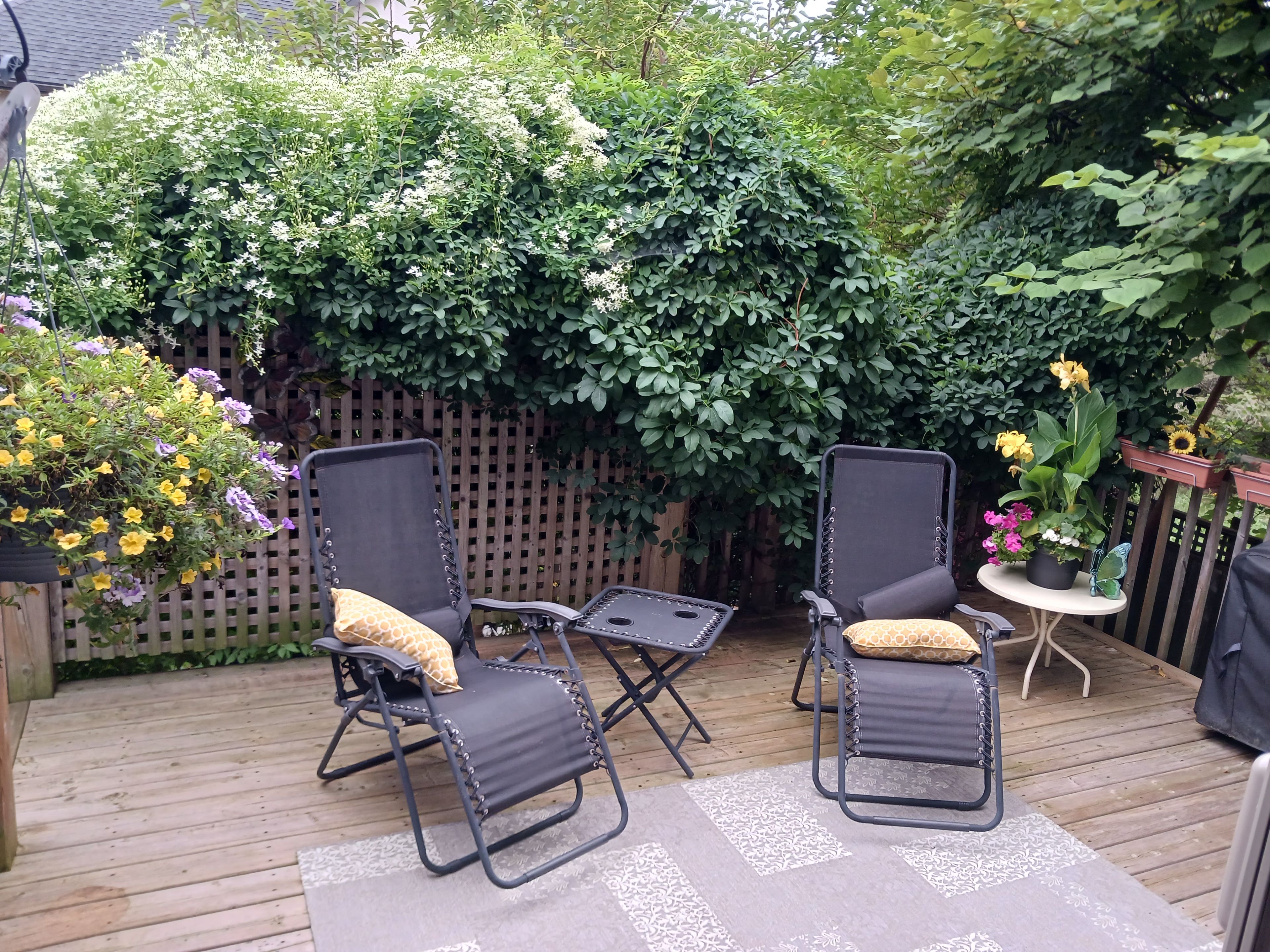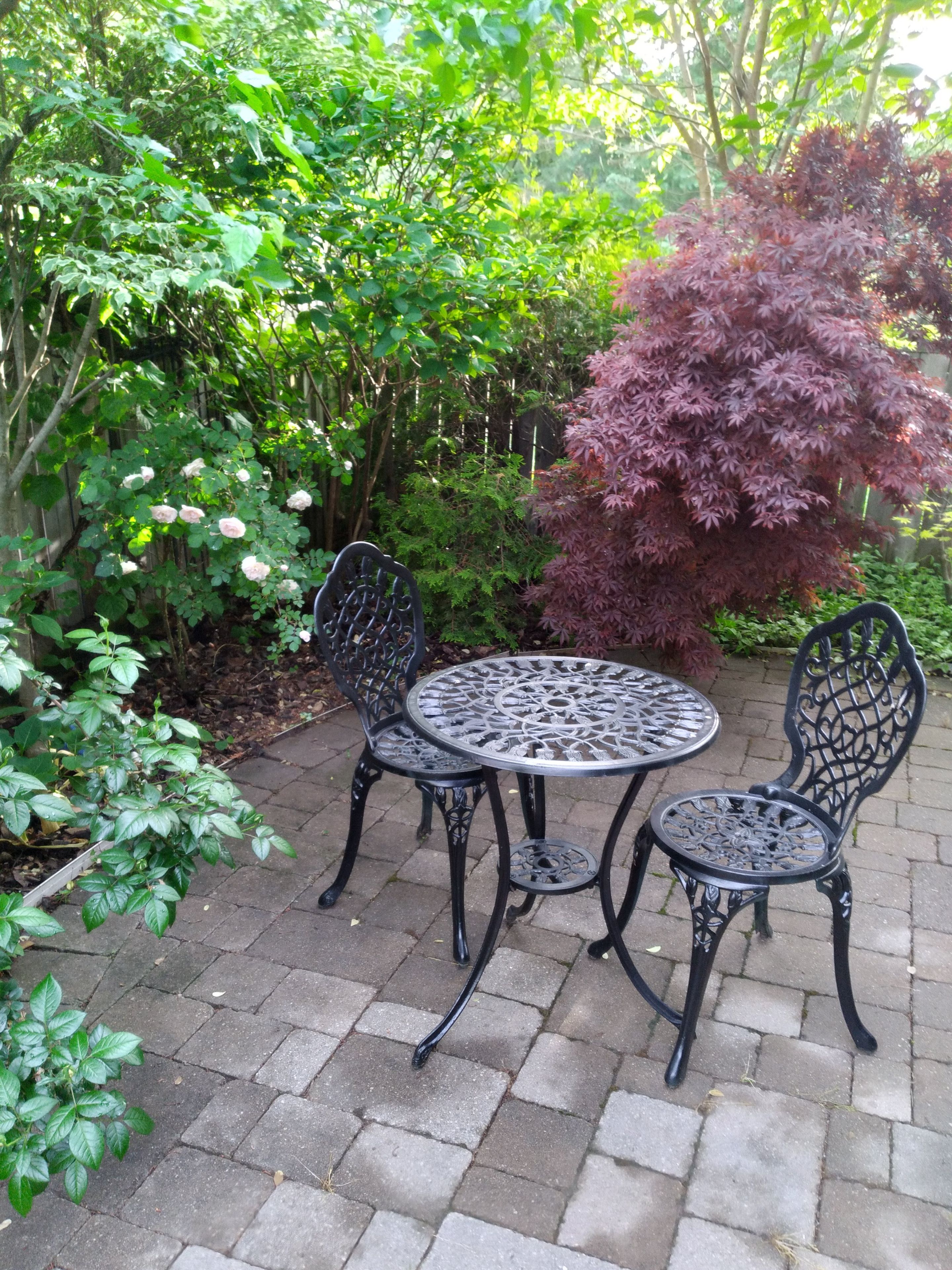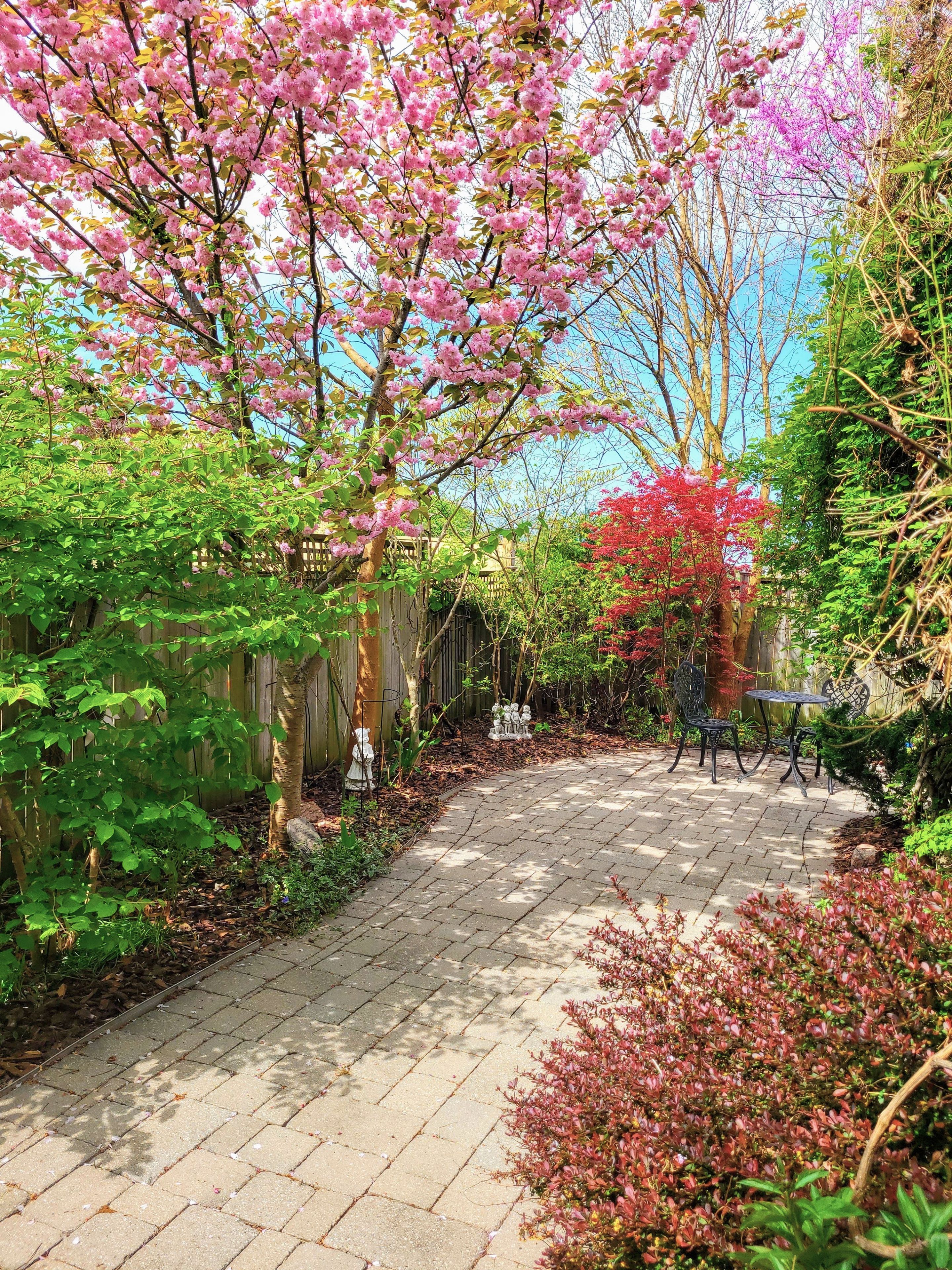 • Landscaped backyard oasis with shaded garden patio for outdoor relaxation.