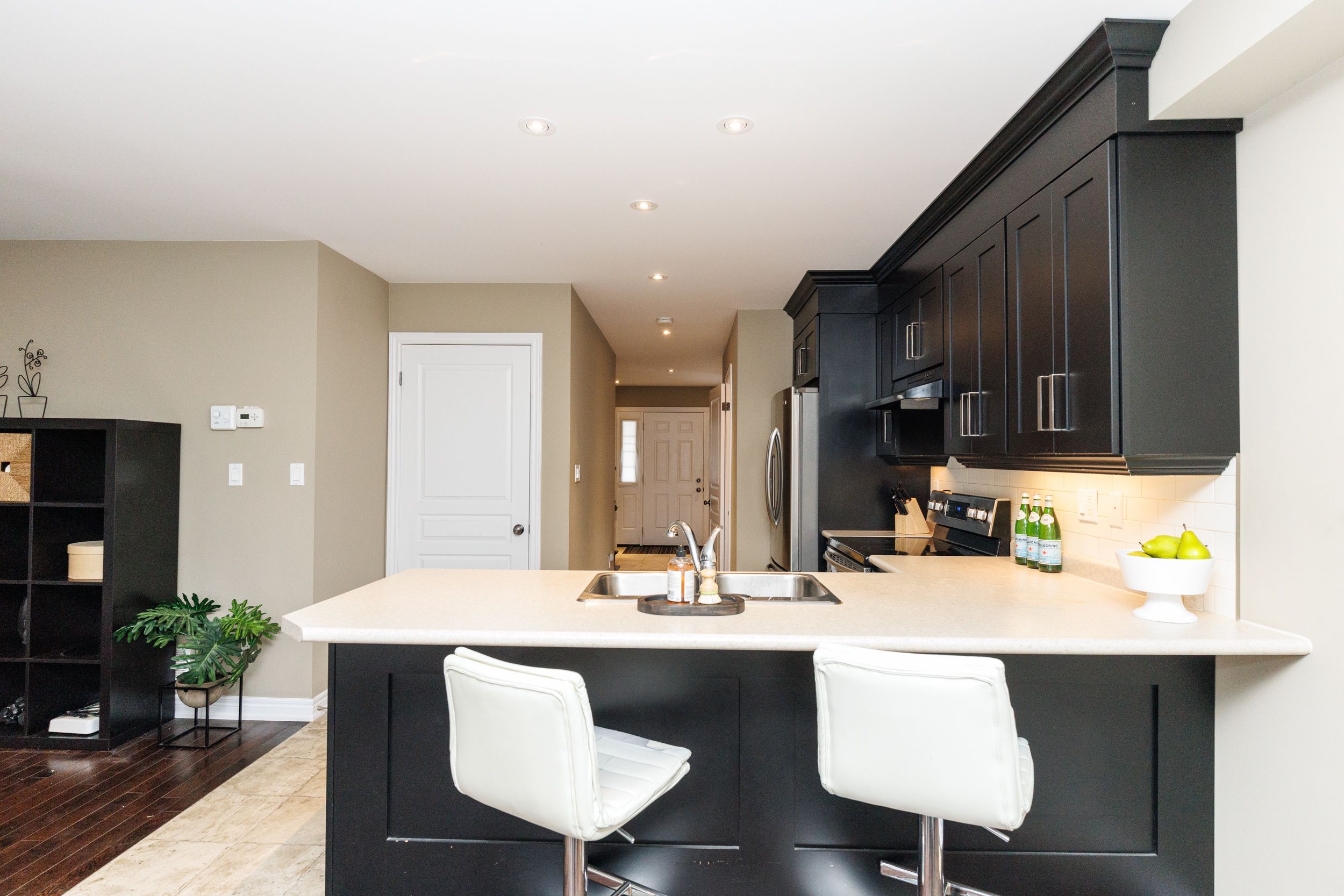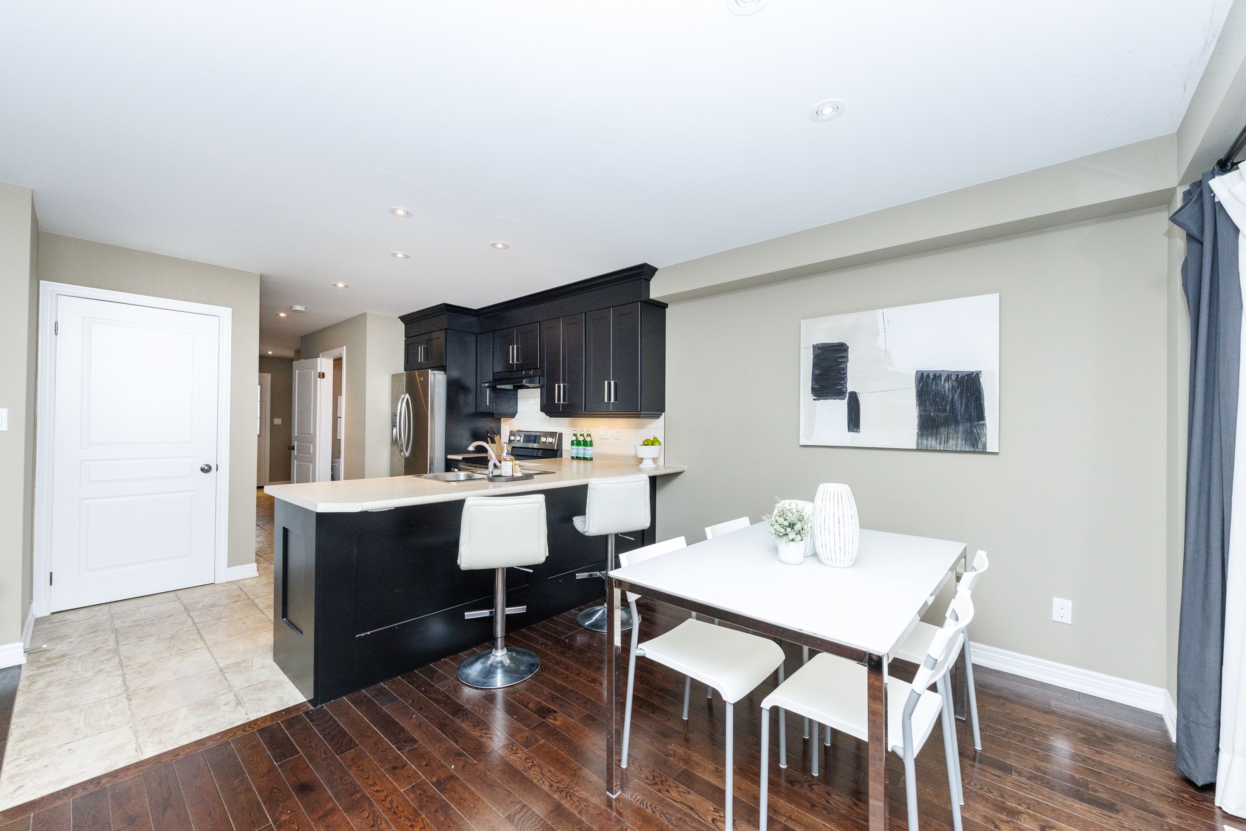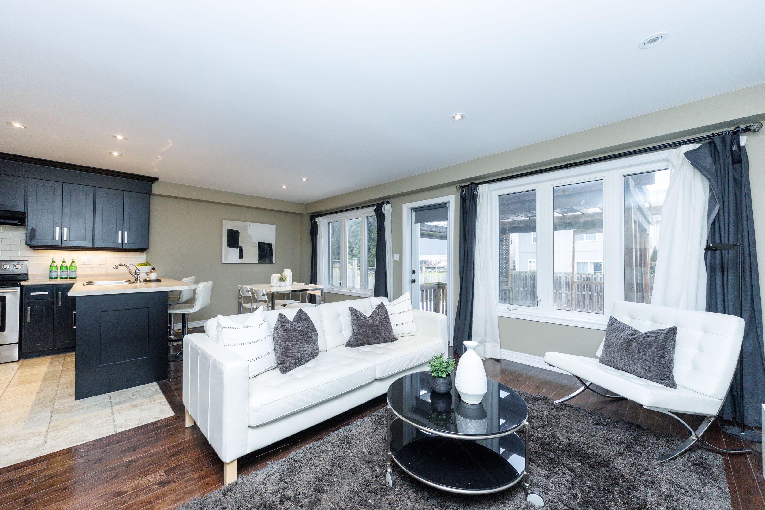 • Open concept kitchen, dining, and living areas with natural light.
