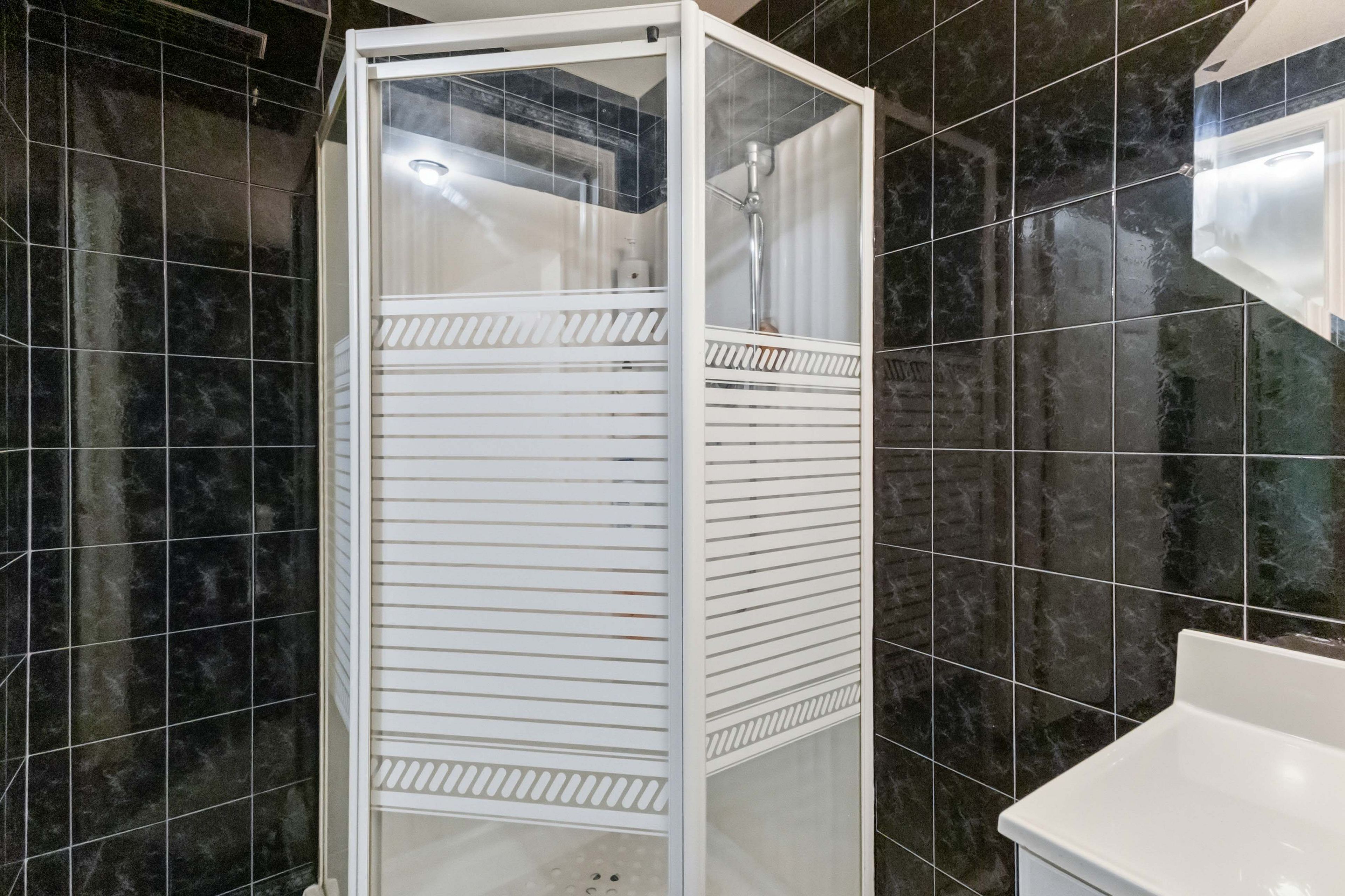 • Private covered deck and concrete driveway fitting four vehicles.