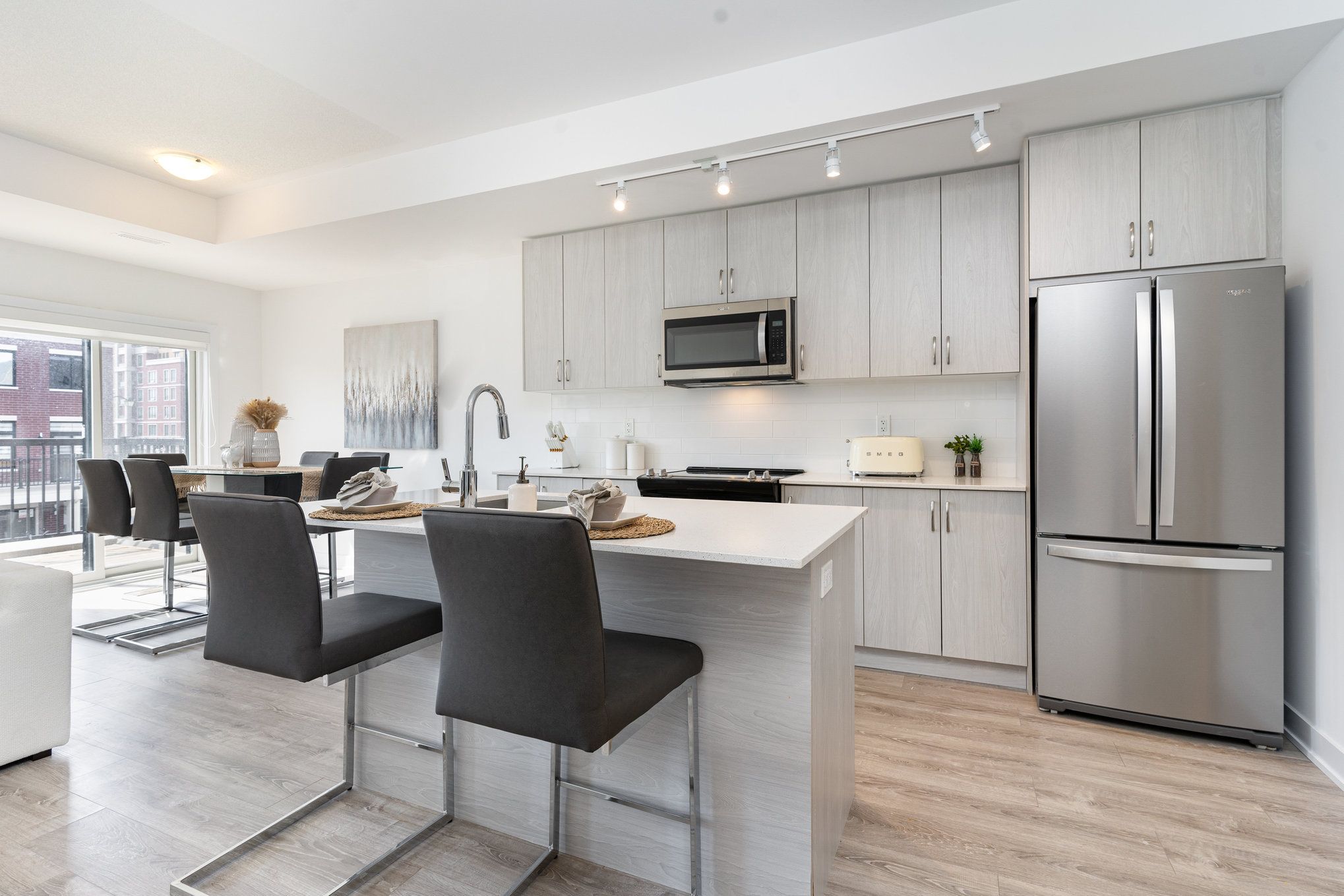 • Modern kitchen with stainless steel appliances and quartz countertops.