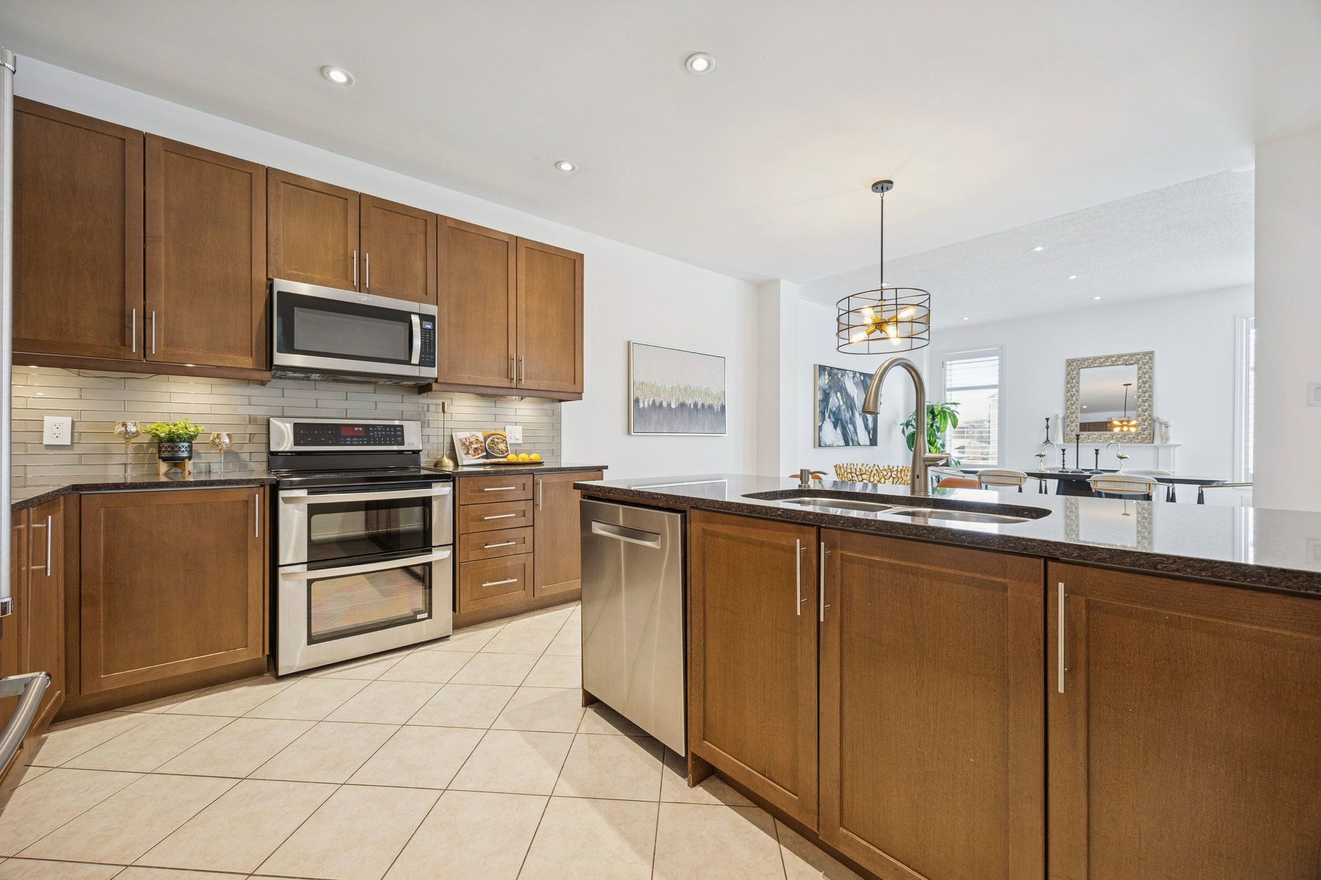 • Modern kitchen features granite countertops and stainless steel appliances.