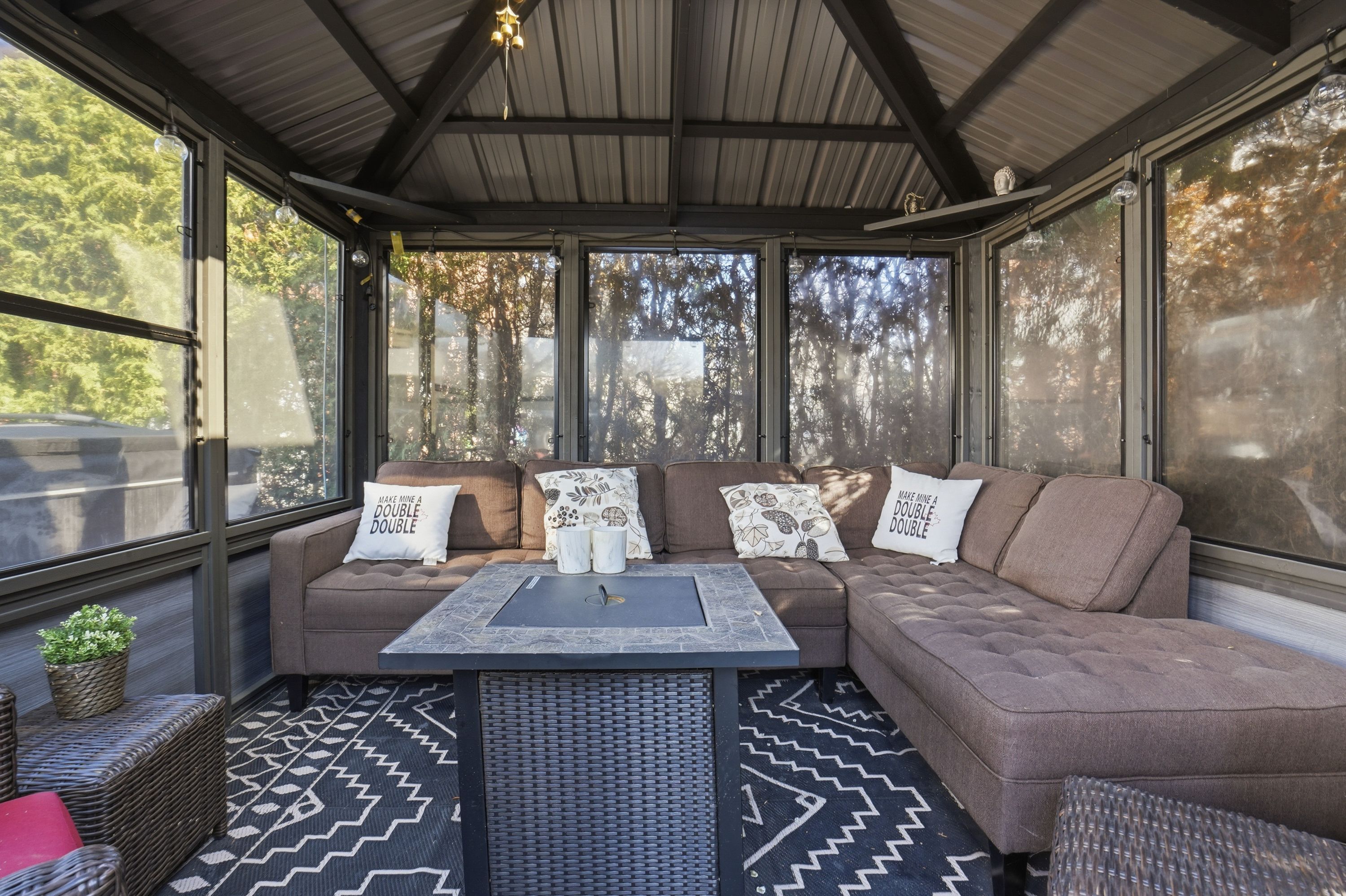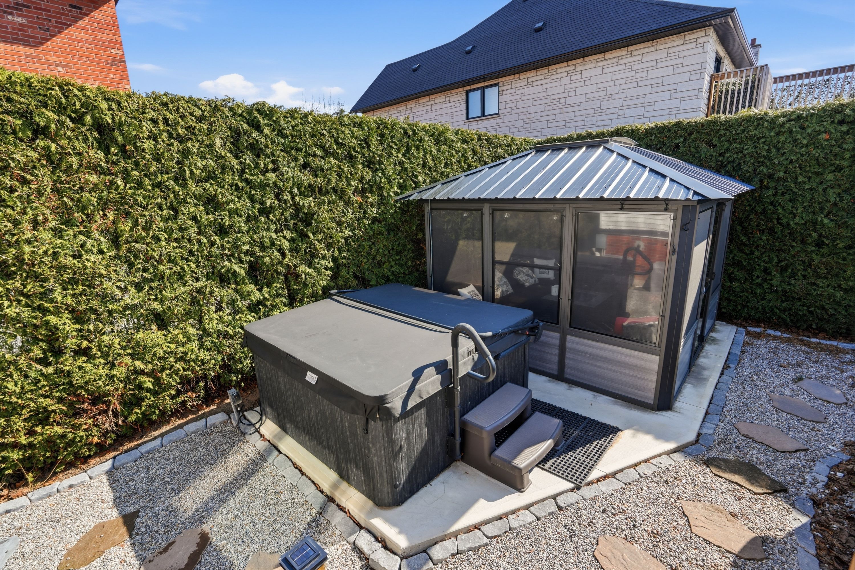• Private backyard oasis with a pool, hot tub, and gazebo.