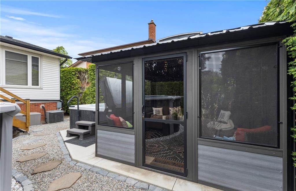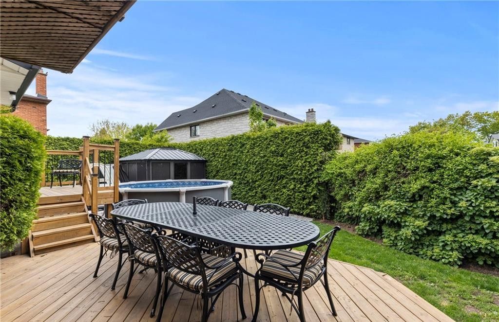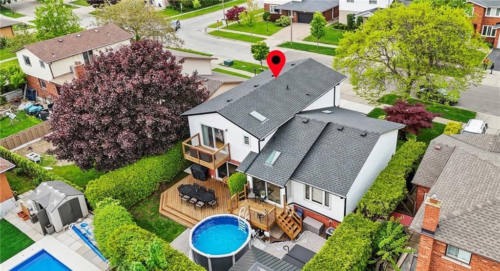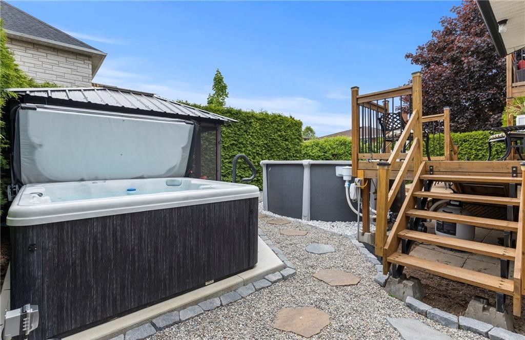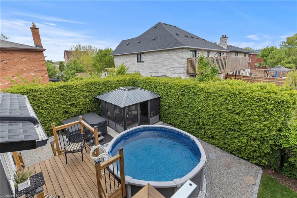 Beautifully maintained 4-bedroom, 4-bathroom side split located in one of stoney creek's most sought-after neighbourhoods. Offering over 2,000 sq ft of finished living space across multiple levels, this home provides a functional and versatile layout perfect for families and entertaining. The bright main level features two skylights, an updated kitchen with sliding doors to the backyard, and a welcoming family room with an cozy fireplace. The primary bedroom boasts its own private deck-an ideal retreat to relax and unwind. The fully finished lower level adds valuable living space, complete with a cozy gas fireplace and an impressive bar, perfect for hosting or enjoying quiet evenings at home. Step outside to your private backyard oasis, featuring a two-tiered deck, saltwater above-ground pool, hot tub, and a gazebo with removable windows for extended seasonal enjoyment. Additional highlights include a double garage, ample driveway parking, and a convenient location close to schools, parks, and major routes. A true move-in ready home offering comfort, space, and lifestyle.