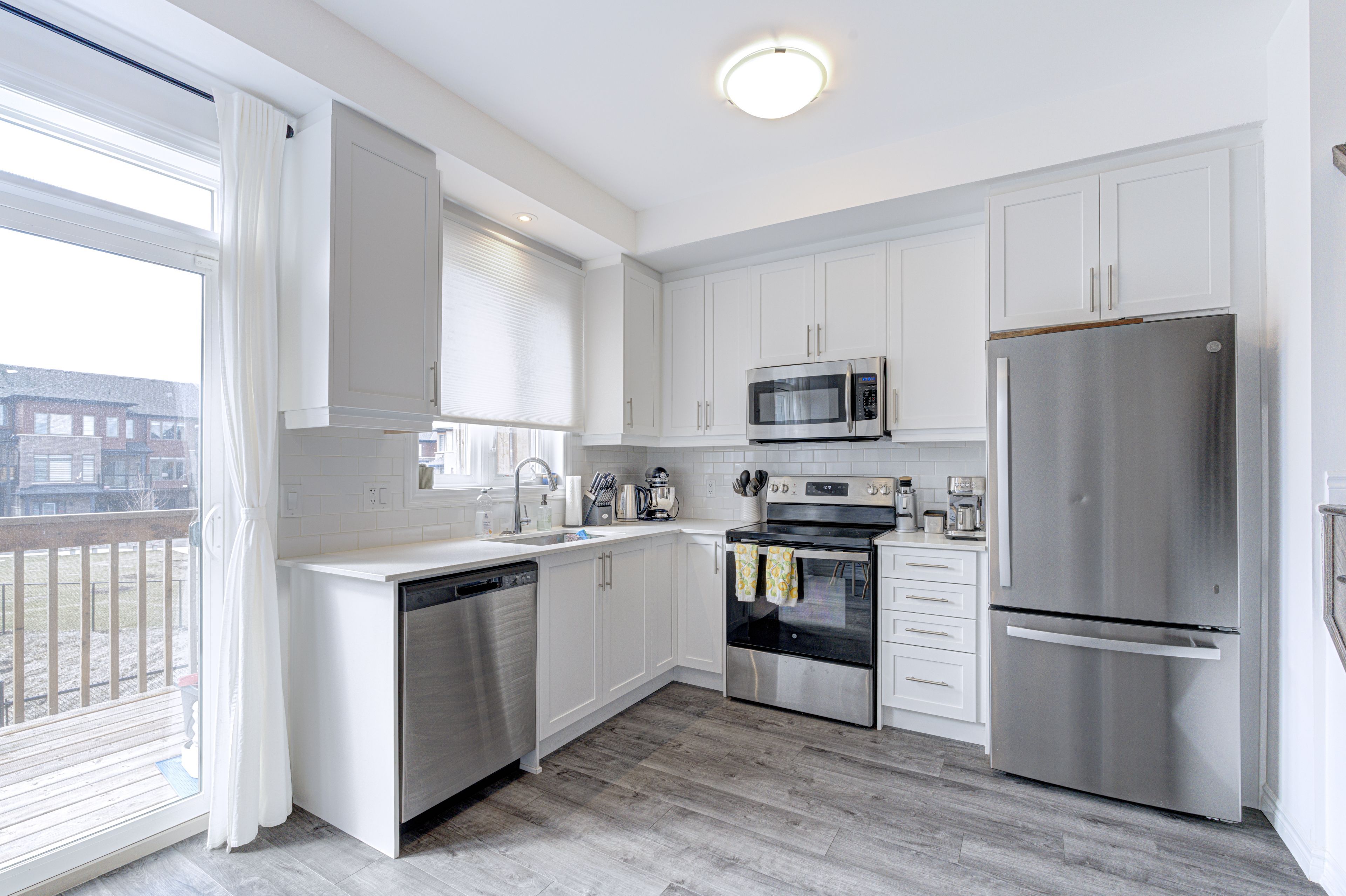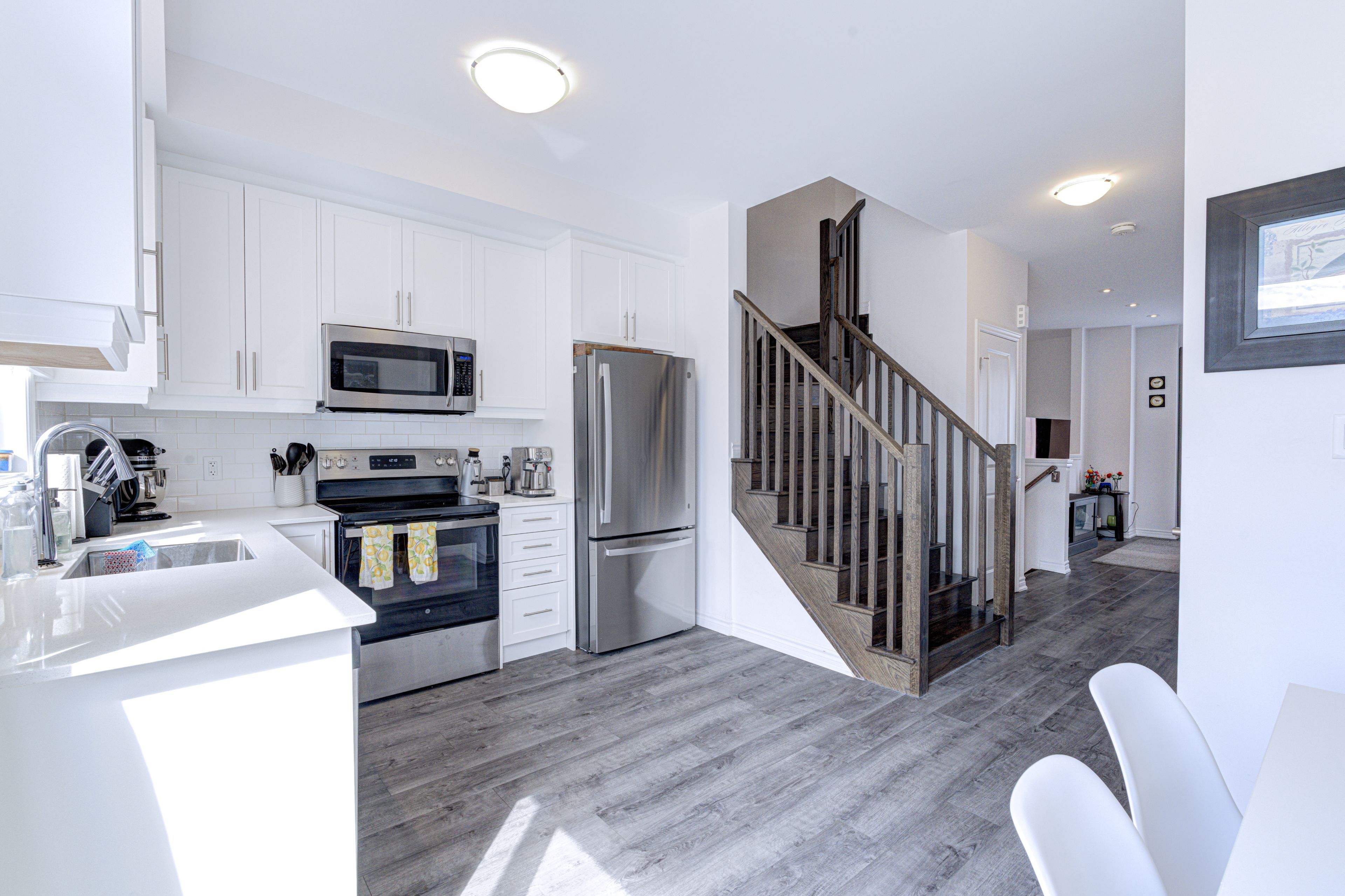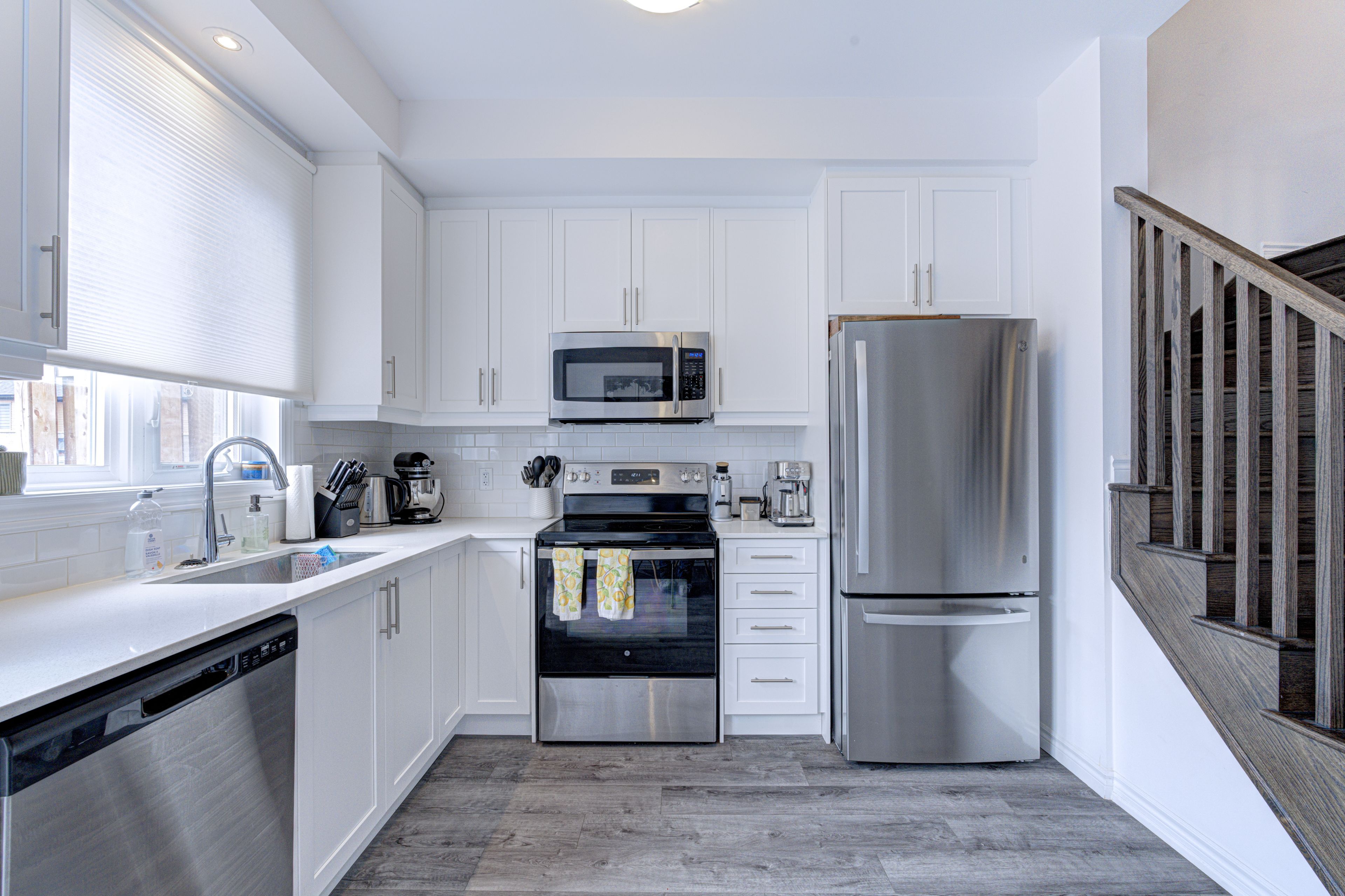 • Modern kitchen features stainless steel appliances and quartz countertops.