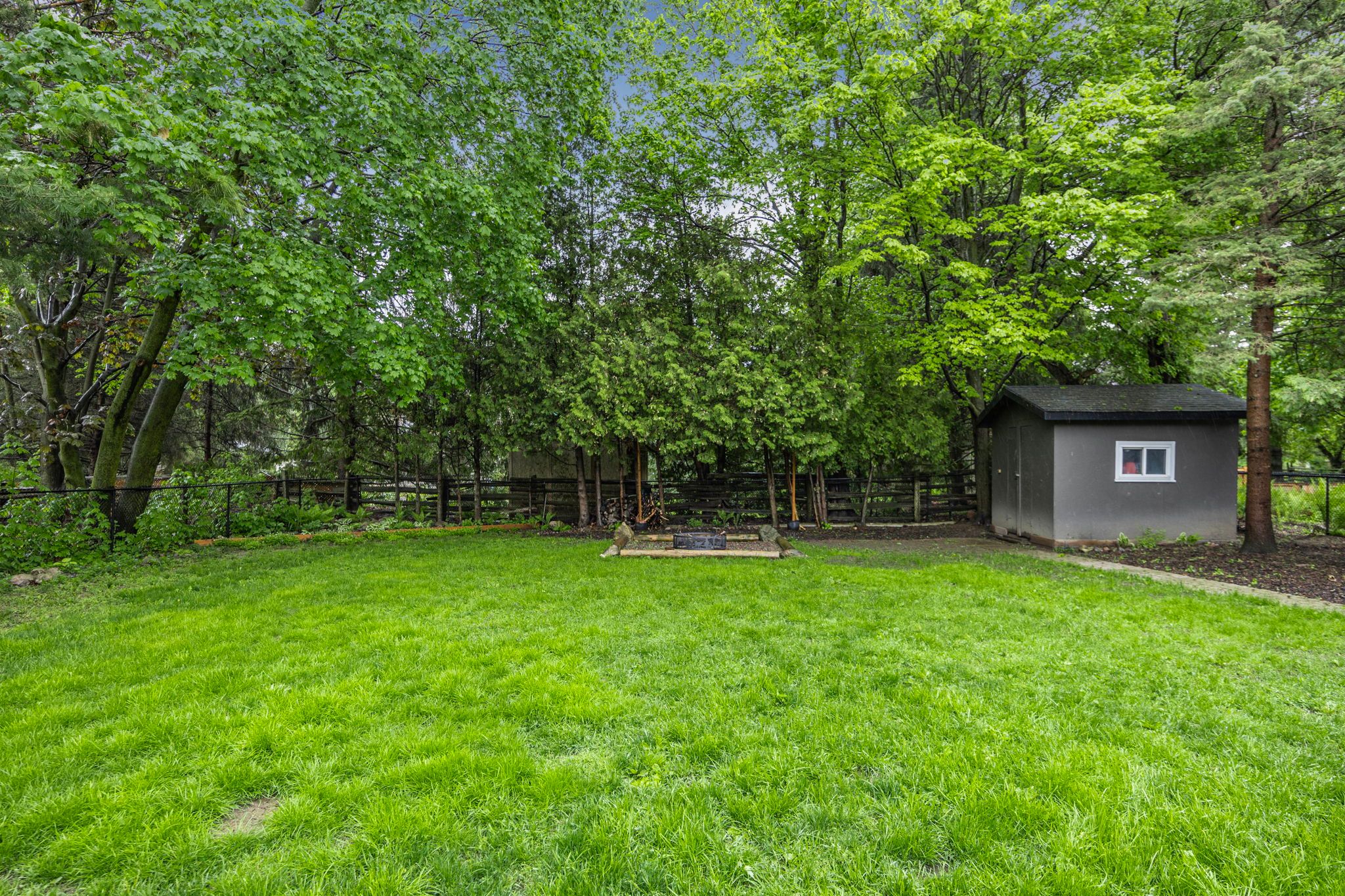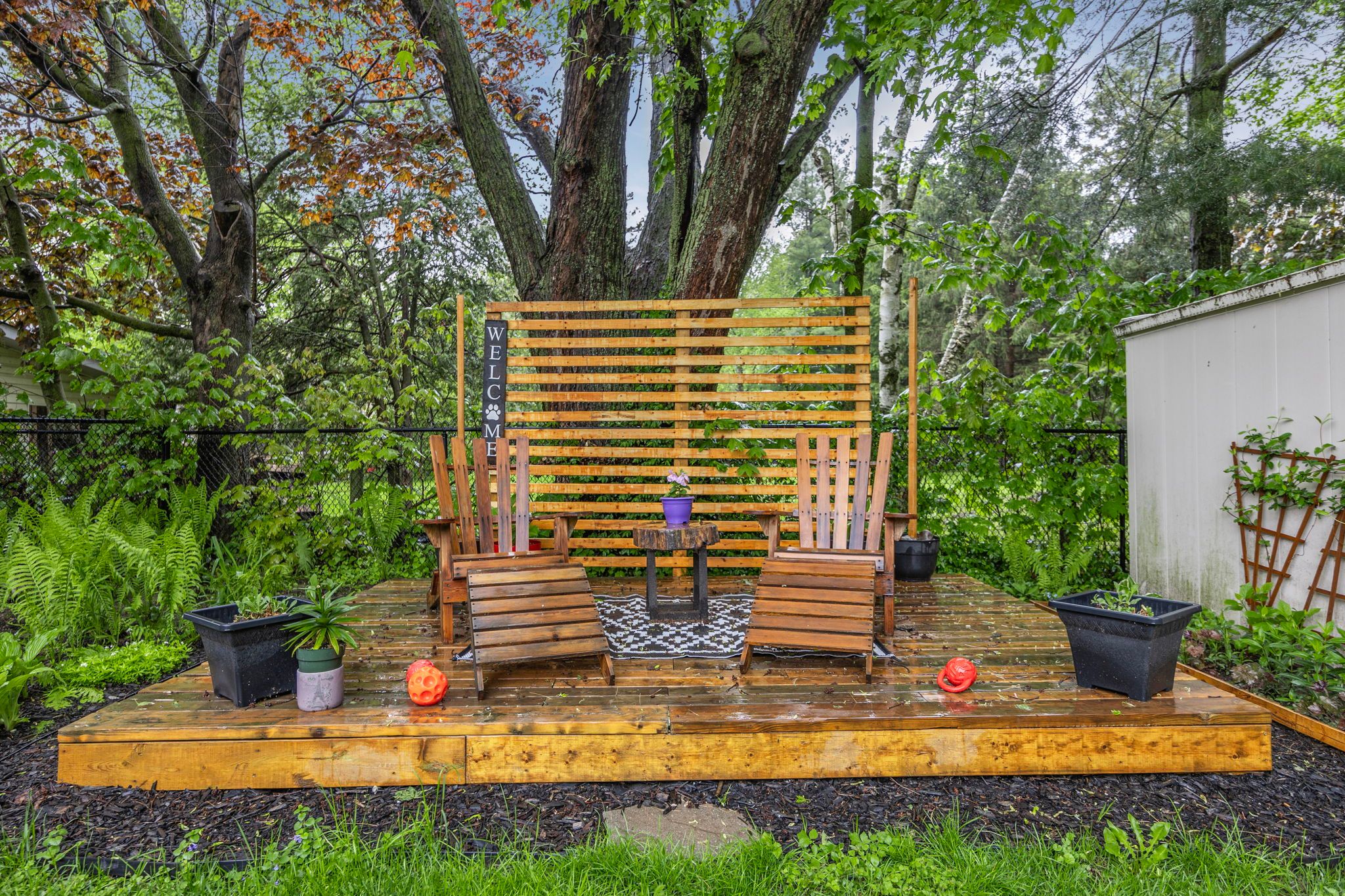 • Backyard features a deck, hot tub, and fire pit.