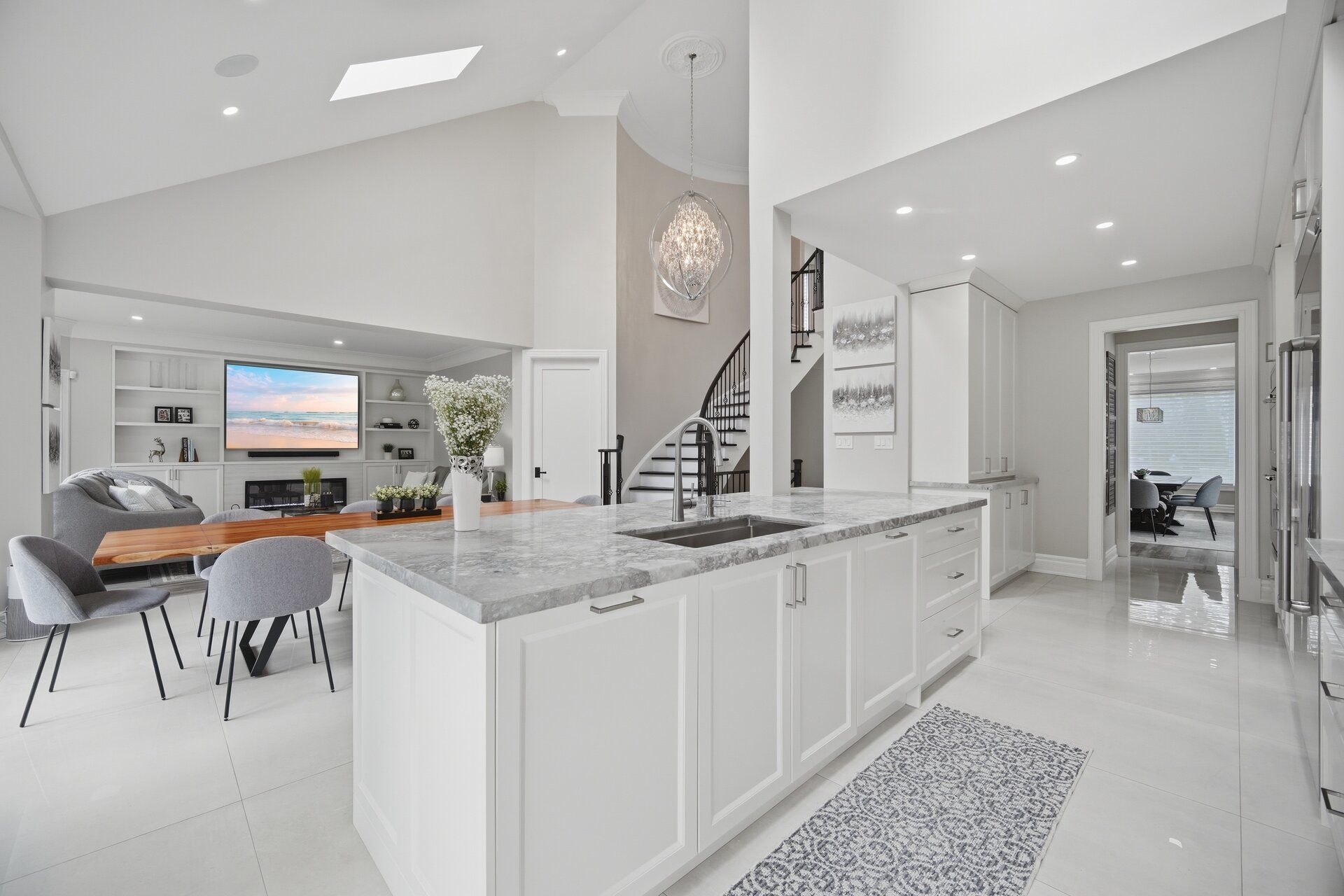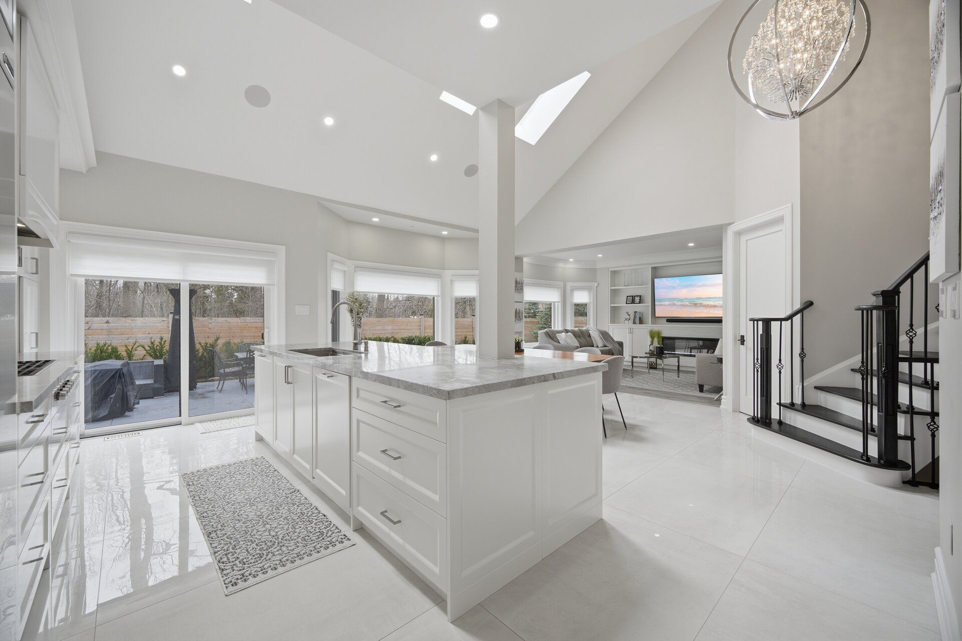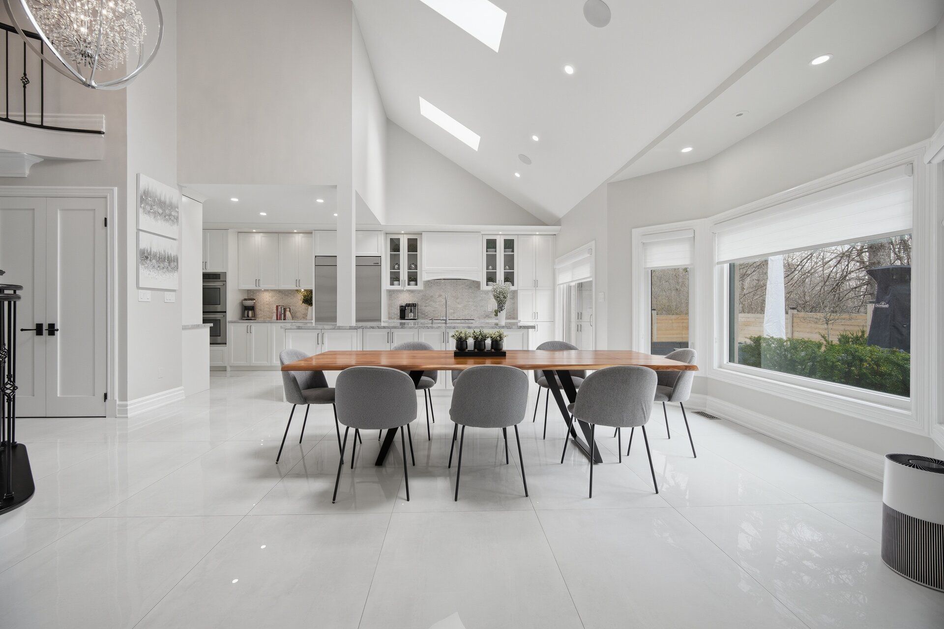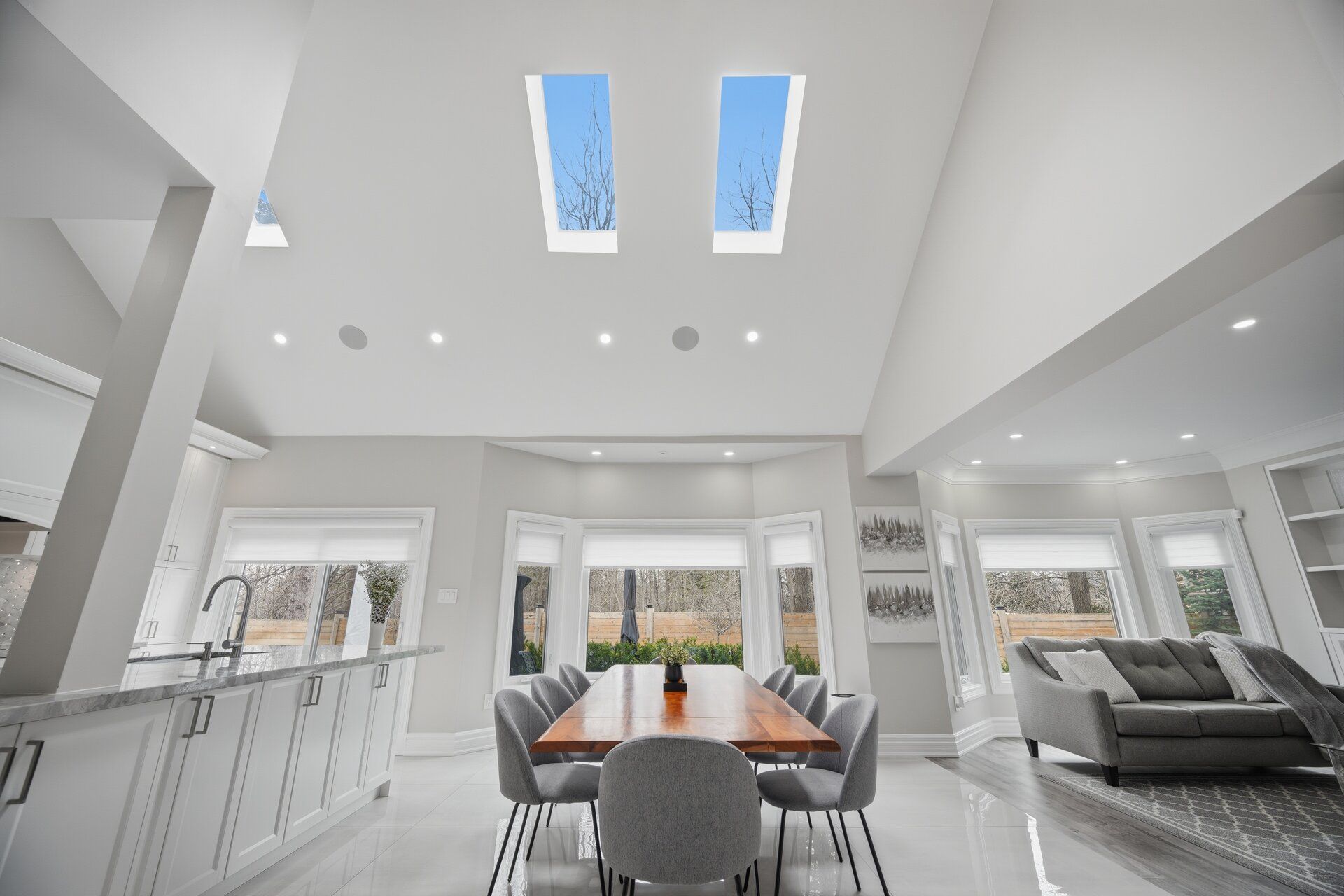 • Open-concept layout filled with natural light from skylights and high ceilings.
