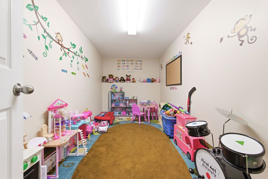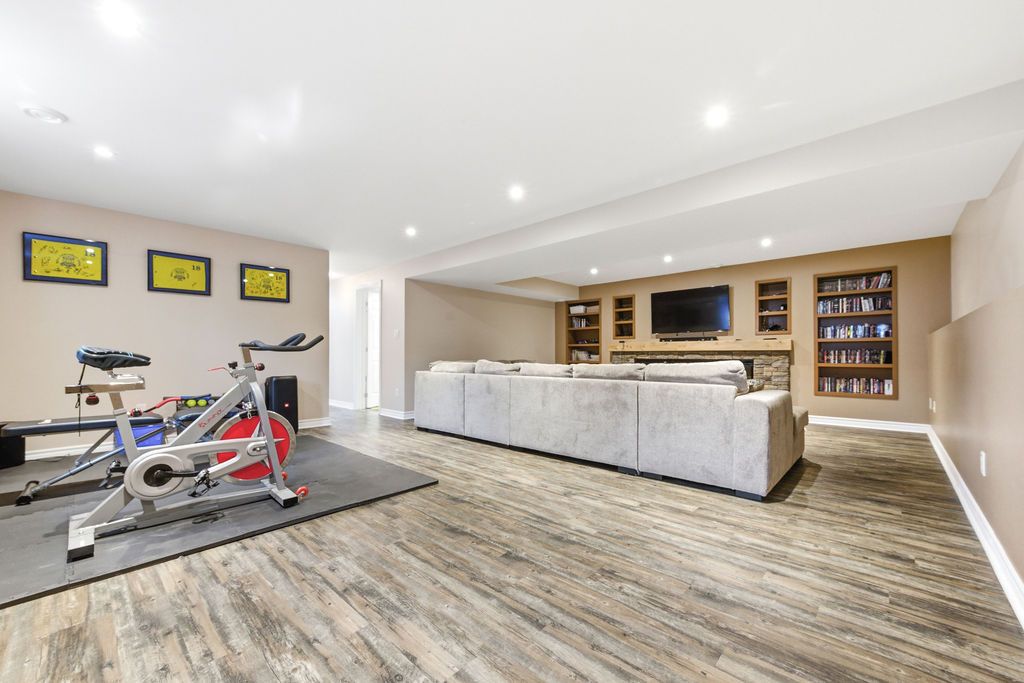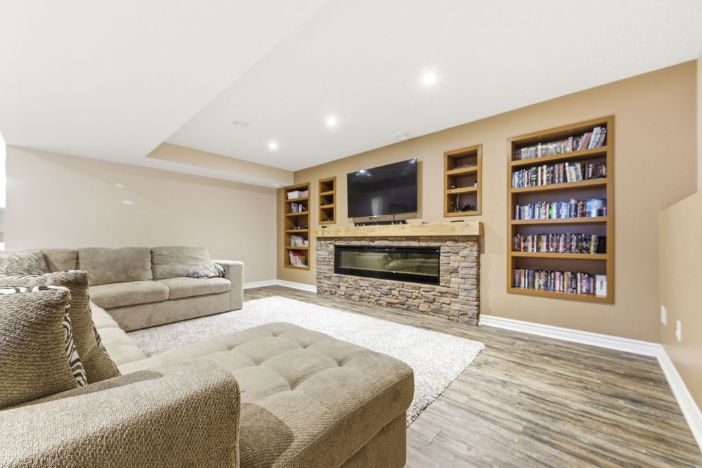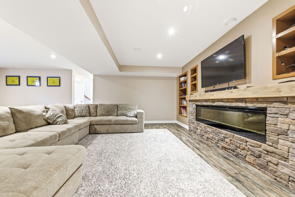 • Spacious rec room featuring an electric fireplace and shelving.