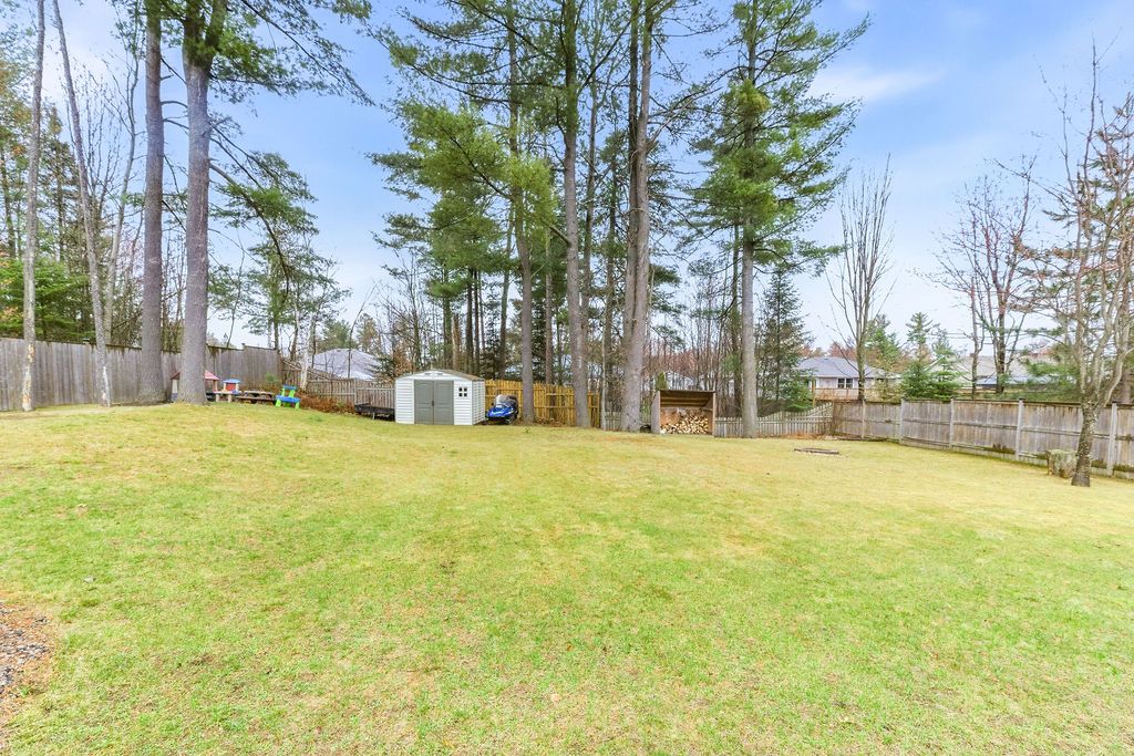 • Private fenced yard with mature trees, a shed, and a fire pit.