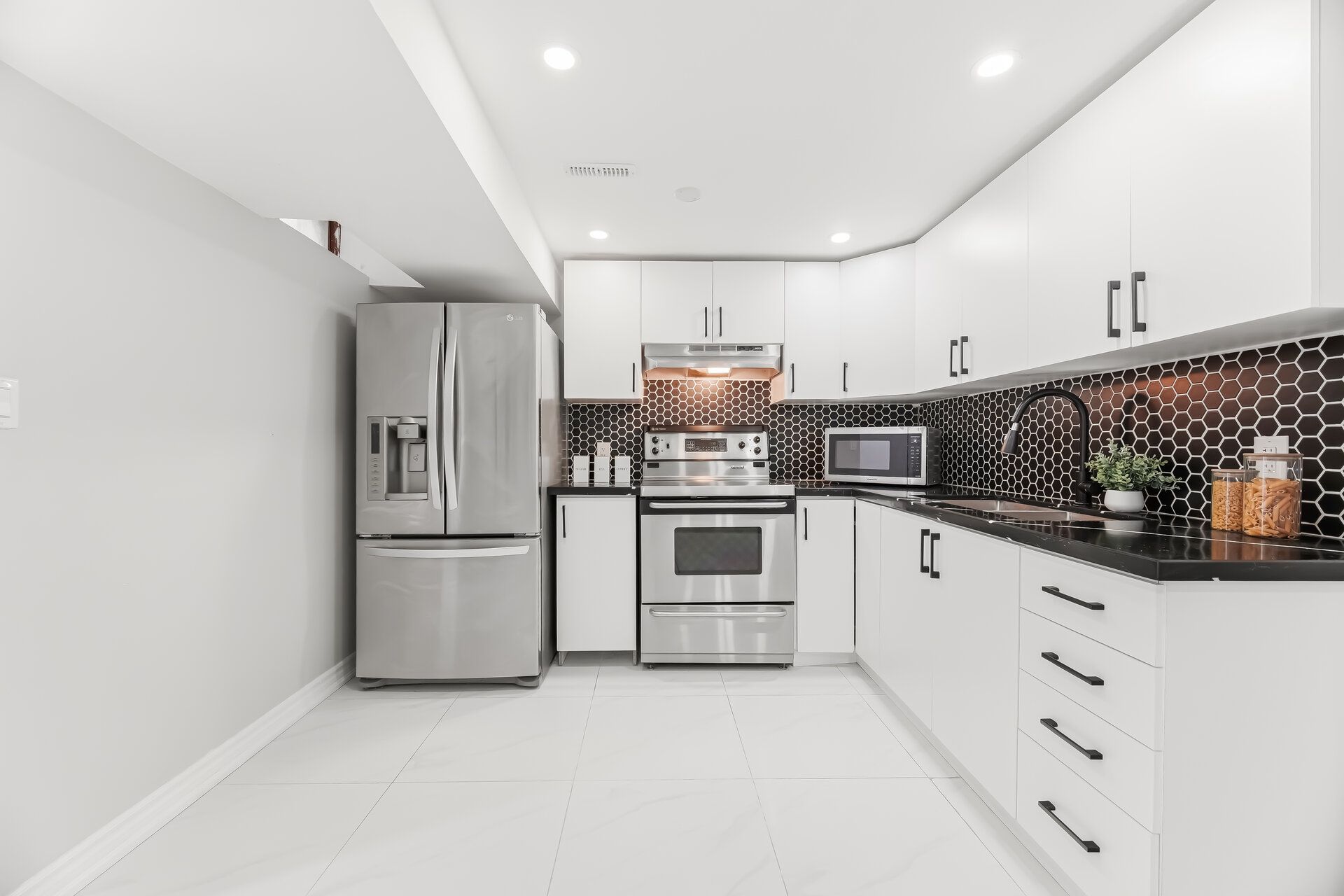 • Chef's kitchen with quartz counters and brand-new stainless steel appliances.