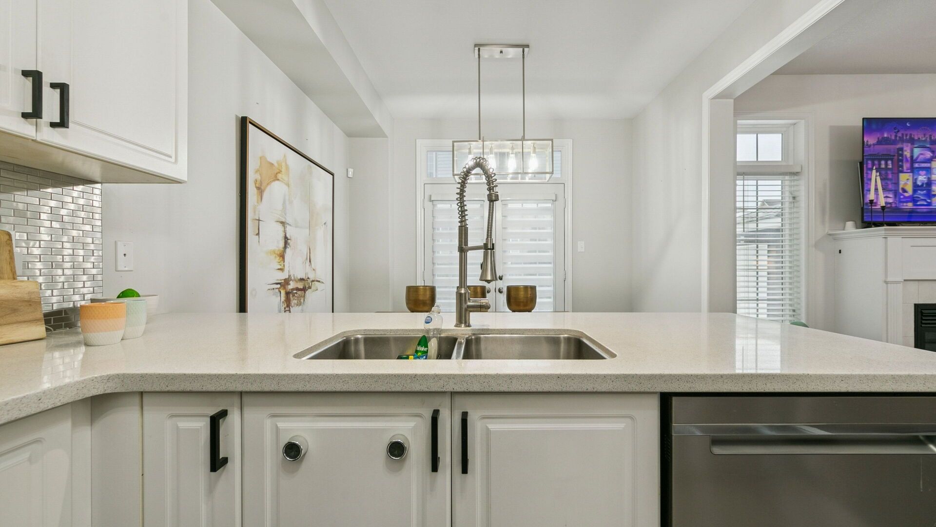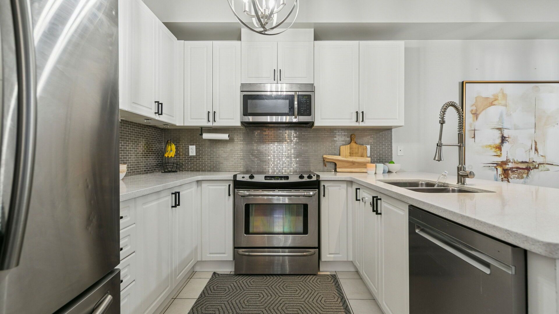 • Modern kitchen with stainless steel appliances and quartz countertops.