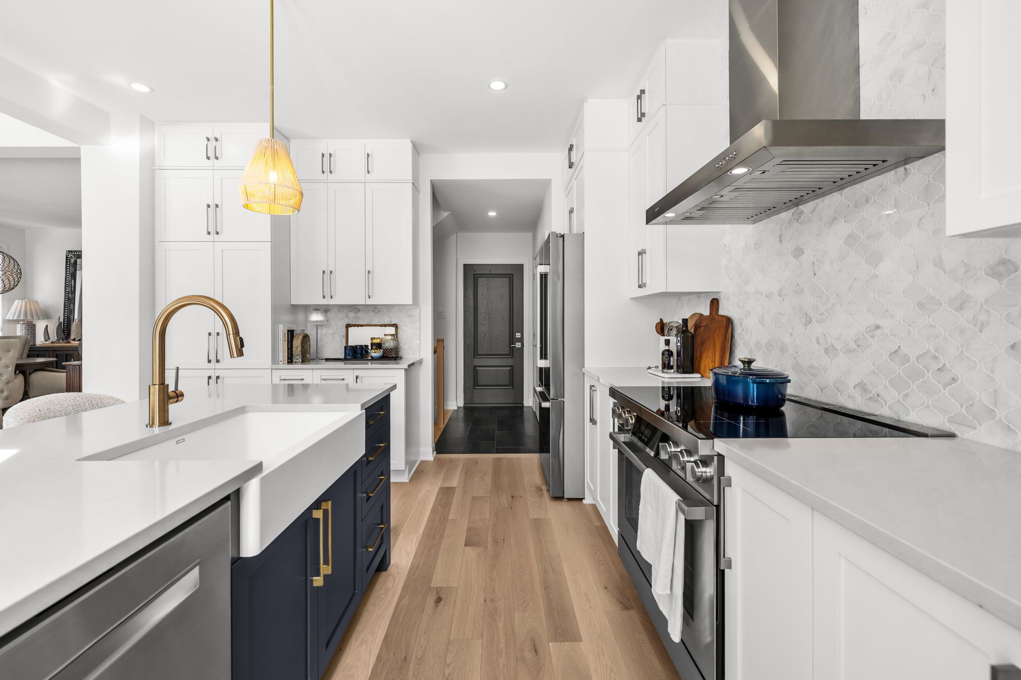 • Gourmet kitchen features custom cabinetry and a beautiful Moroccan mosaic backsplash.