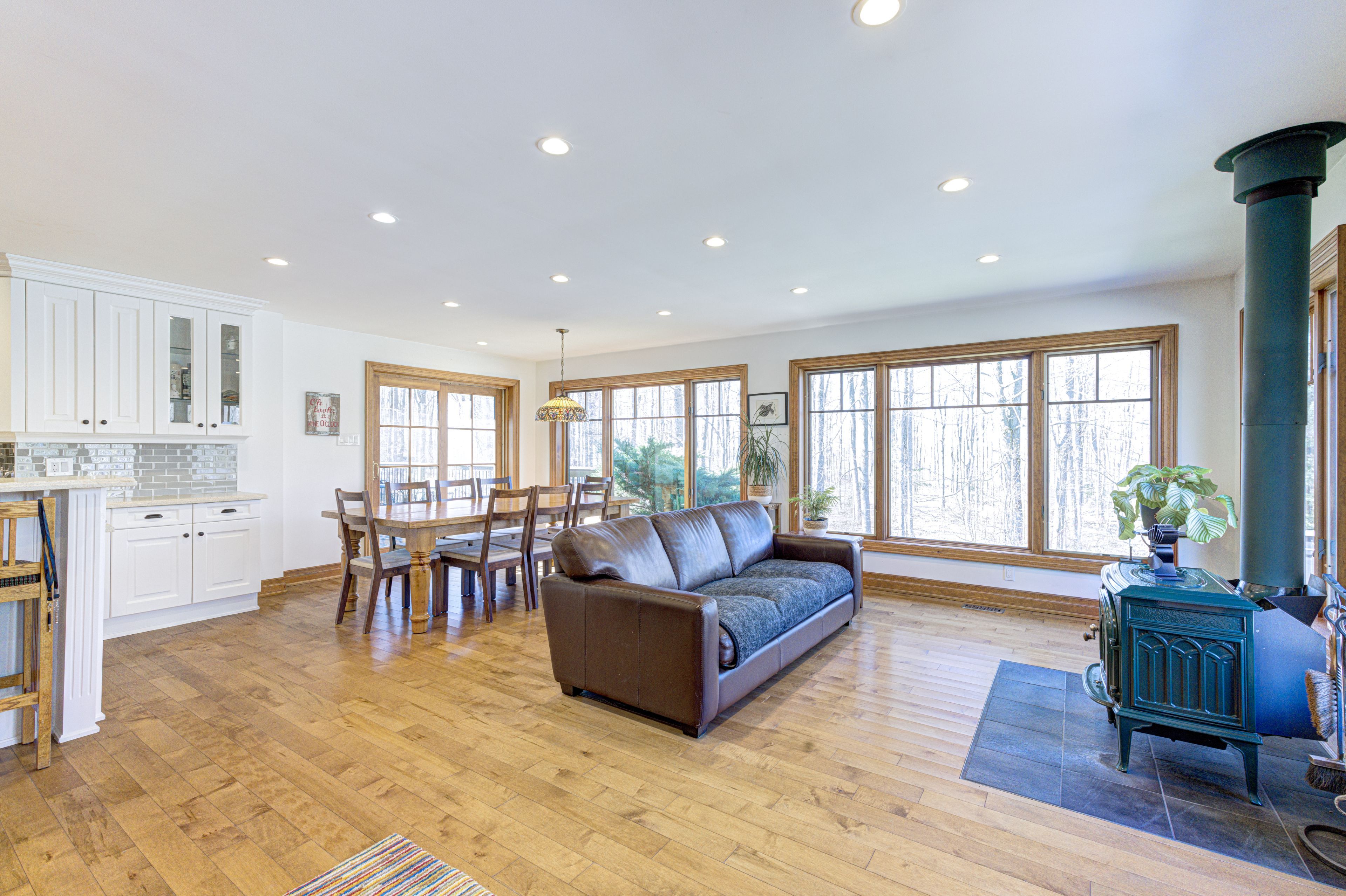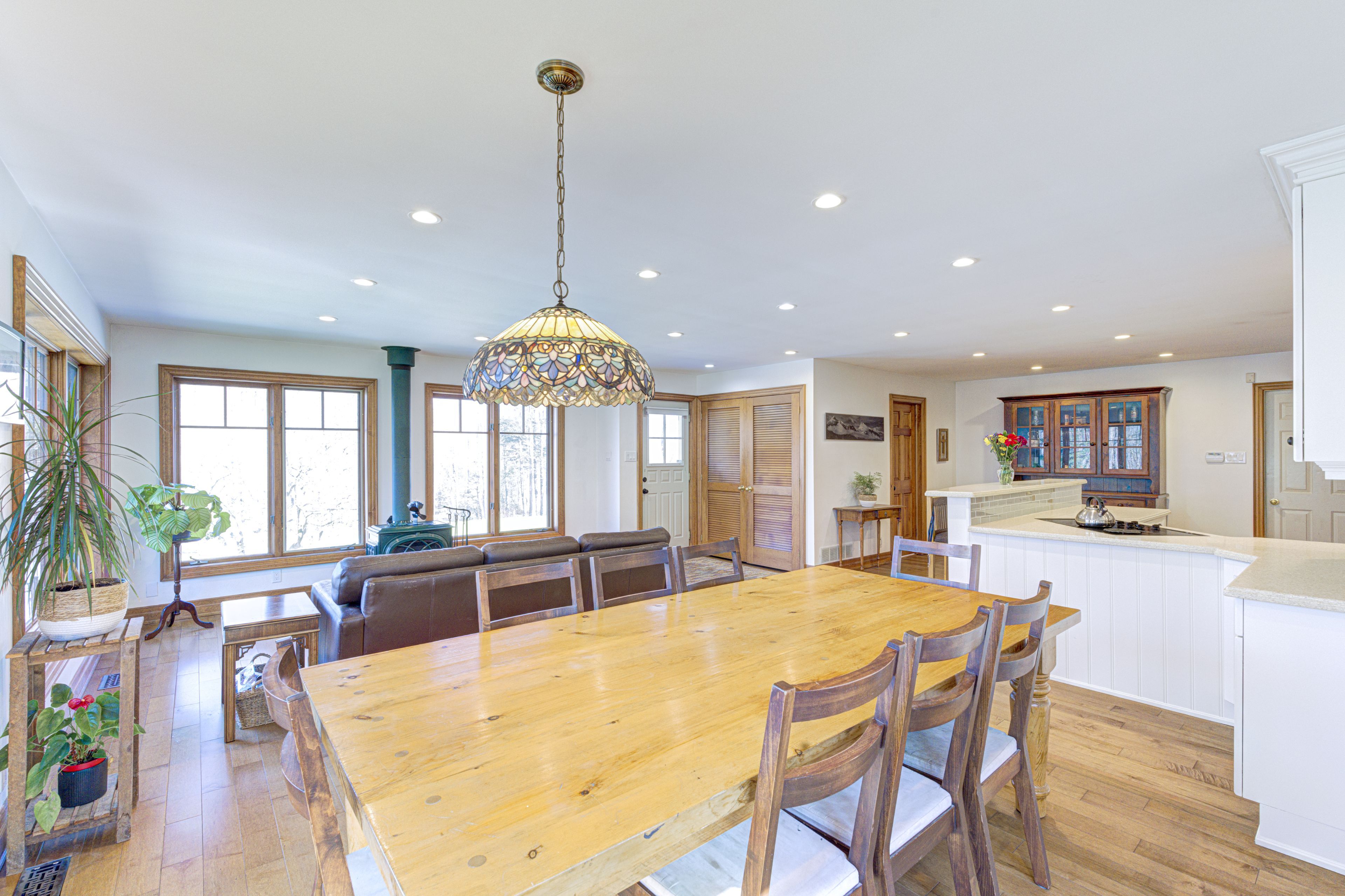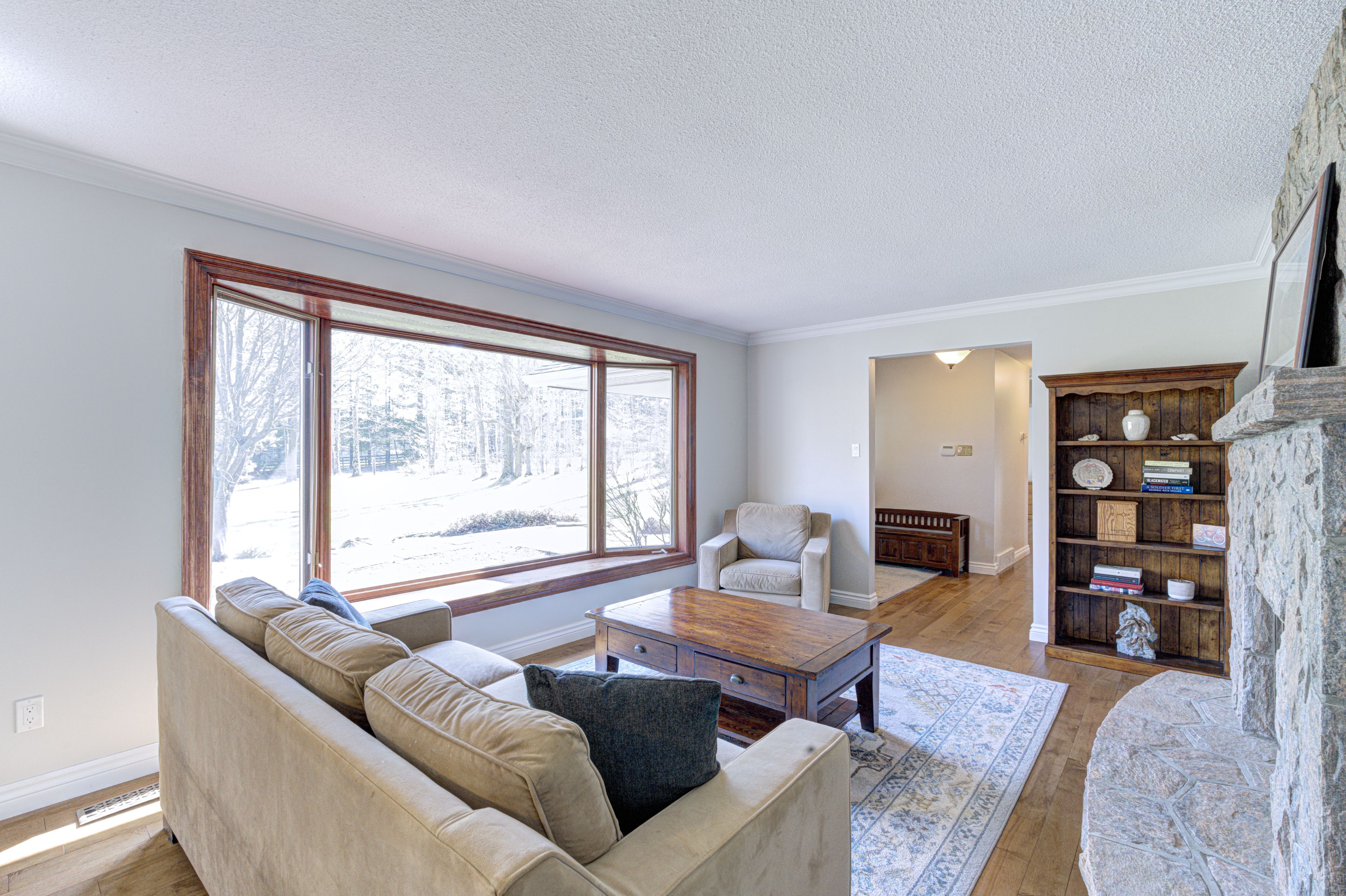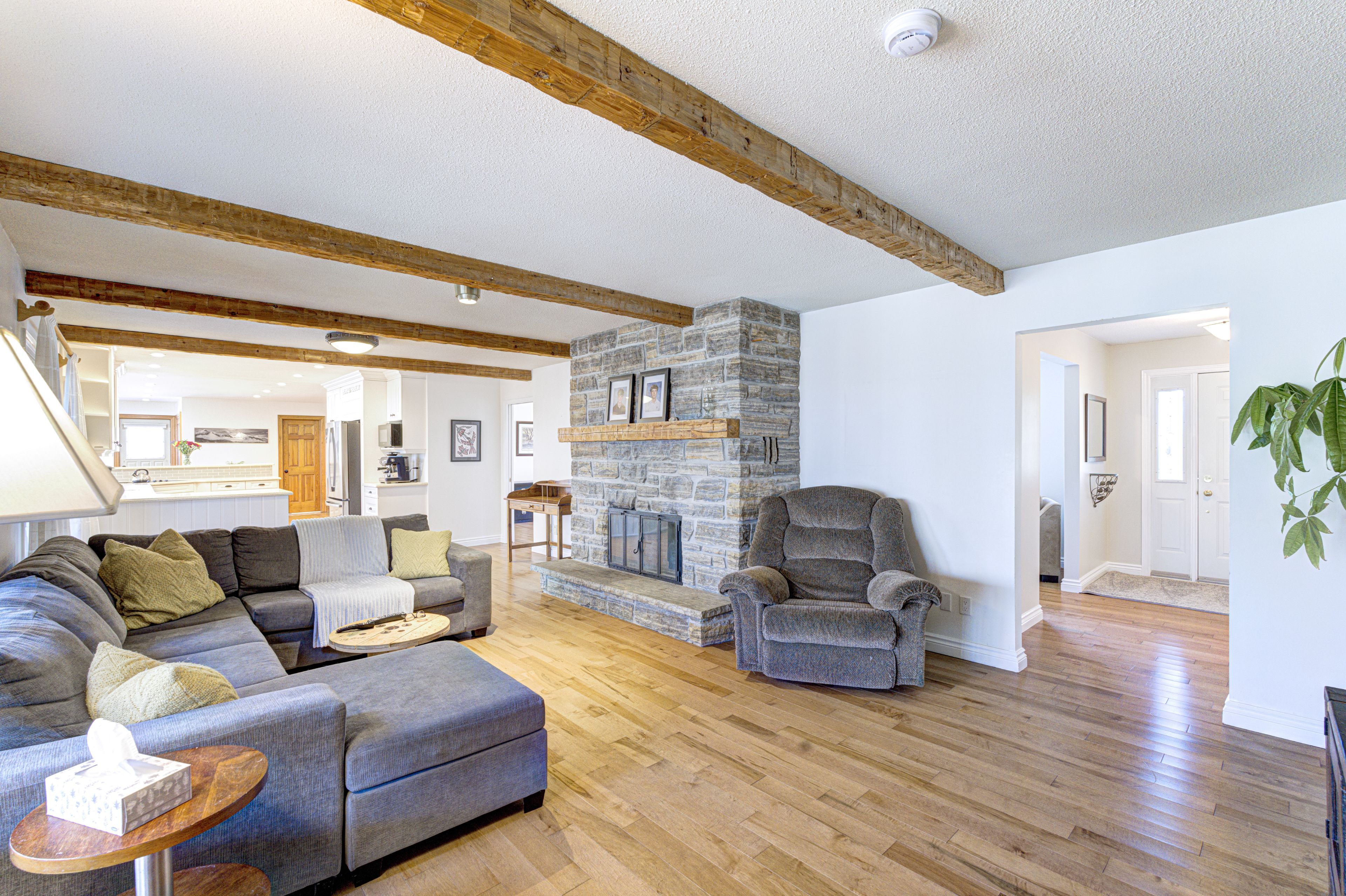 Spacious and well-maintained 4-bedroom bungalow with an attractive stone façade, set on an expansive ~5-acre property with approximately 500 feet of frontage. This open-concept home features a large kitchen with built-in appliances and a breakfast bar, flowing seamlessly into the dining area, sitting room with fireplace, and a generous family room with a double-sided fireplace and walkout to the sunroom. The bright sunroom offers three walkouts to the deck and hot tub, creating an ideal space for entertaining or relaxing. A formal dining room and living room with hardwood flooring add to the home's versatility and charm. The primary bedroom includes a 3-piece ensuite and a walk-in closet. Key updates and features include: pool (2023), generator (2023), hot tub (2019), roof (approx. 5 years old), propane furnace (2025), owned hot water tank, and two 200-amp electrical panels-providing ample power capacity for modern living. The in ground pool is fully prepared and ready to be enjoyed for the upcoming summer season.
