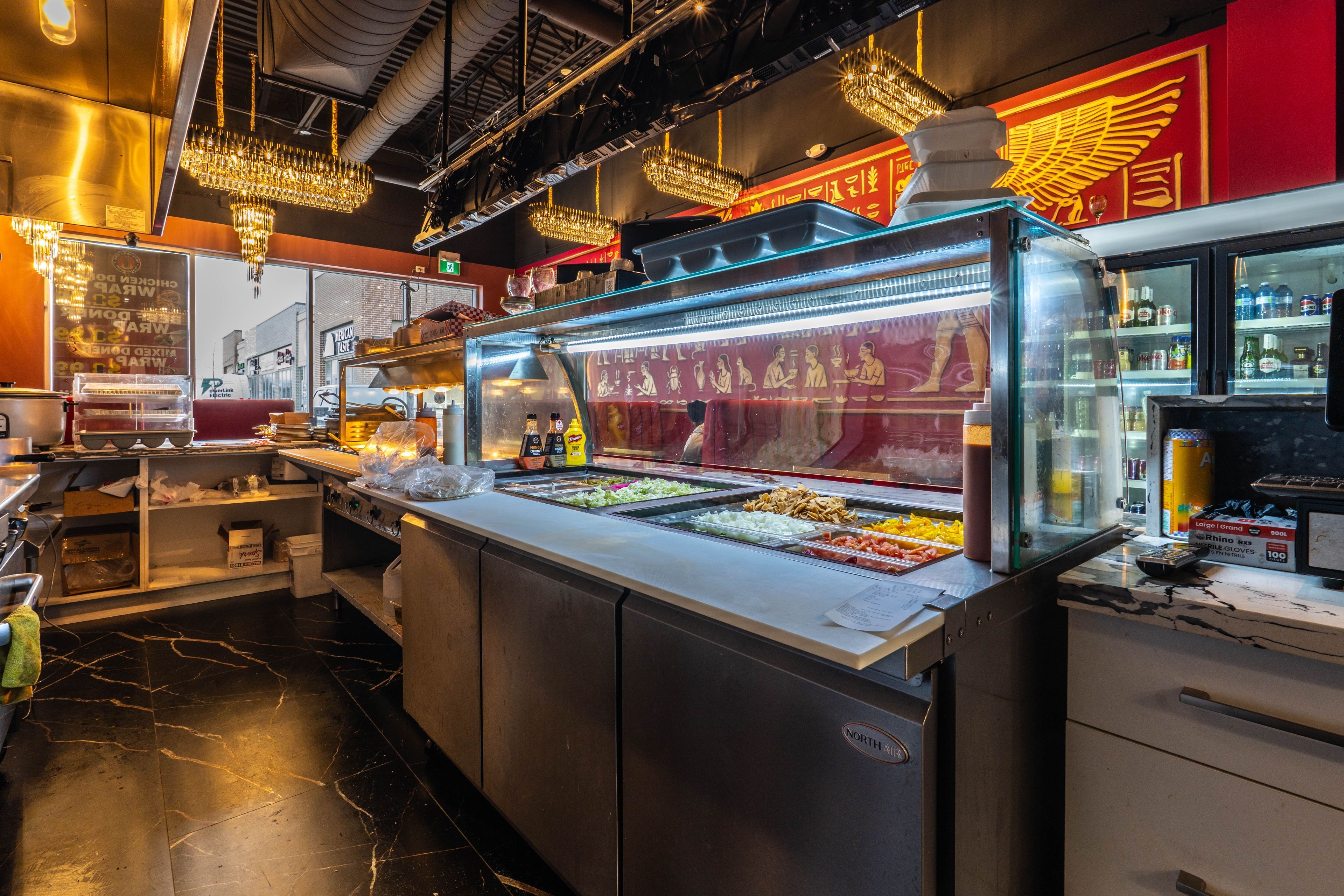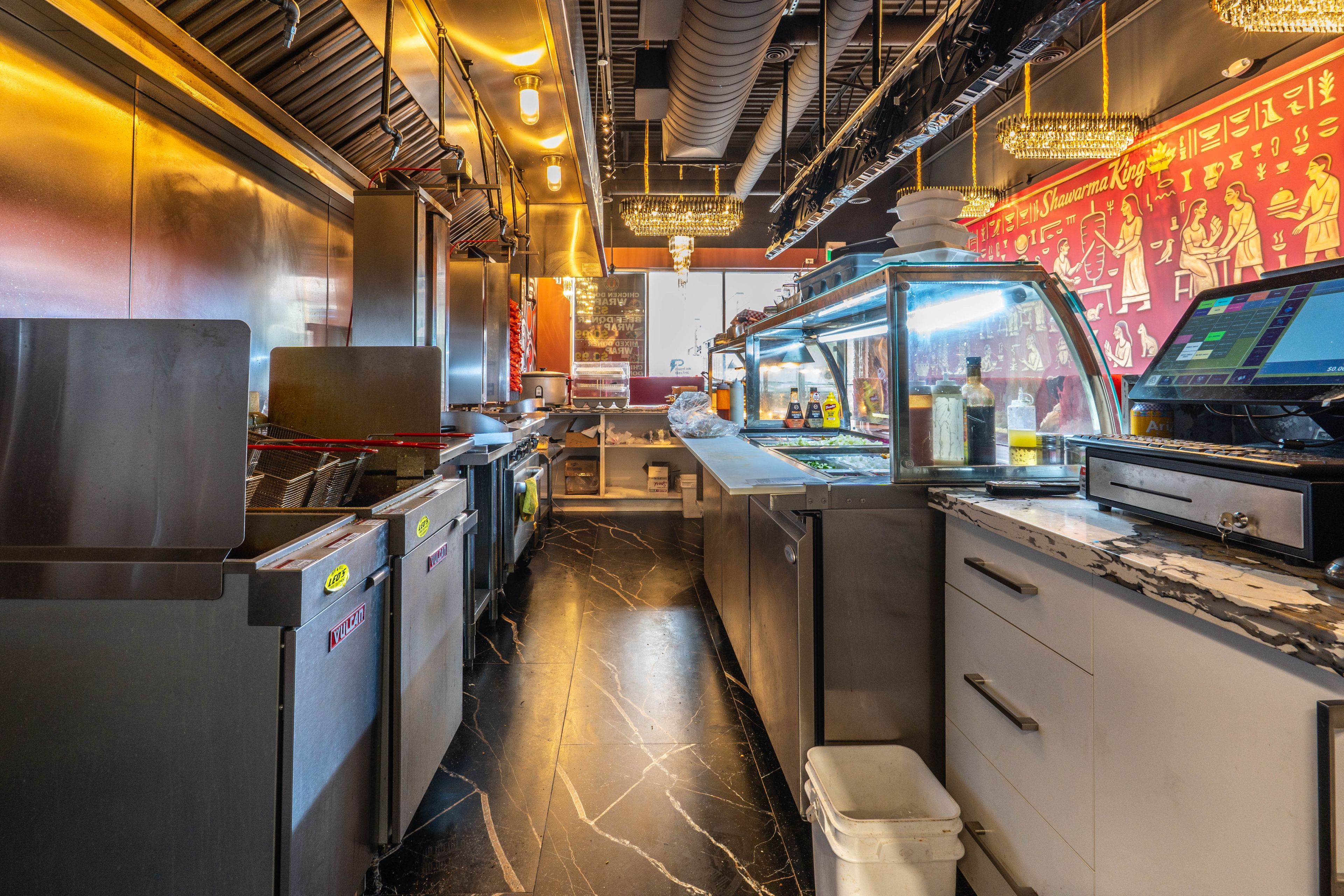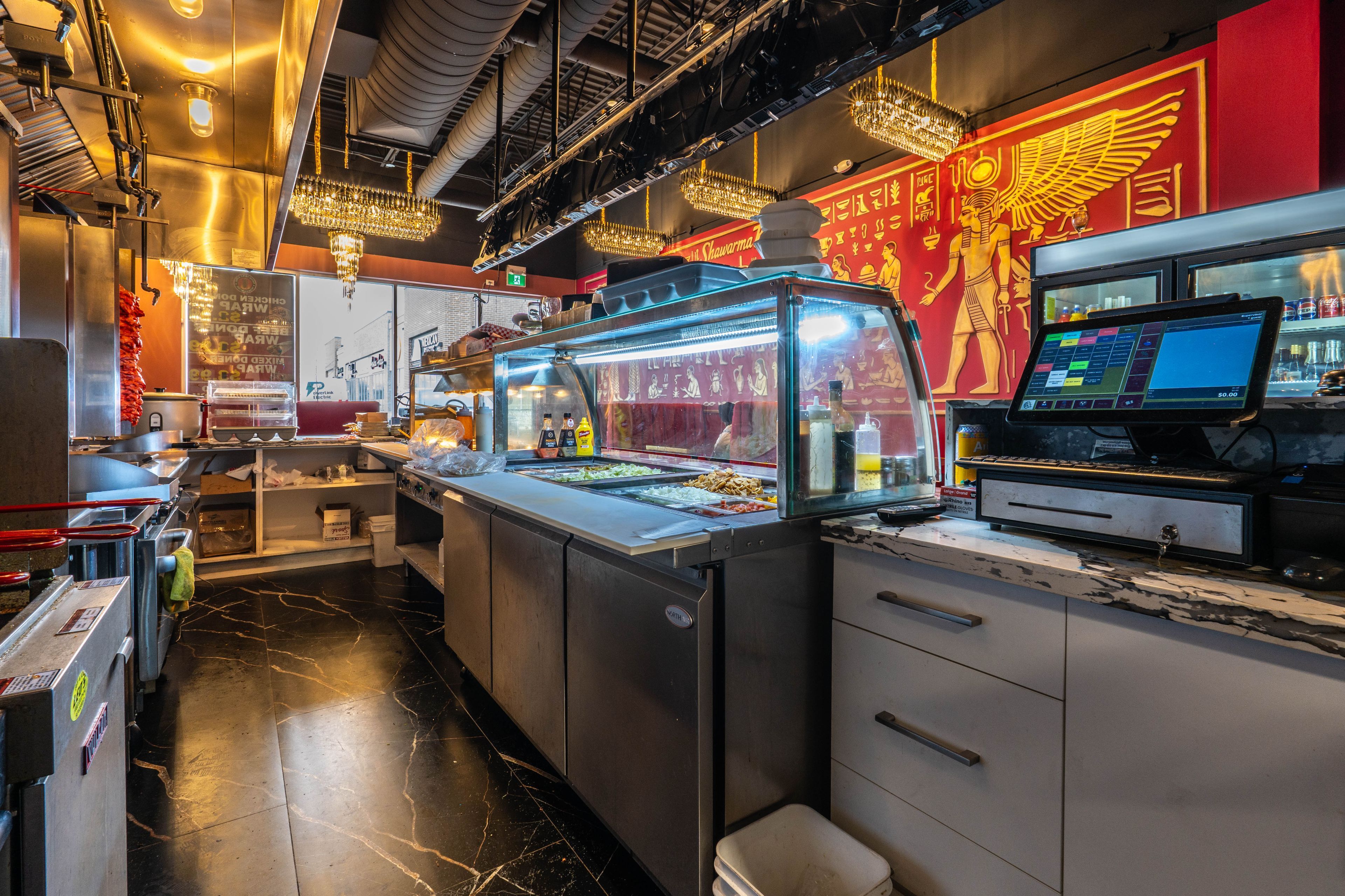 Opportunity to start your own food and restaurant non franchise business in the new build shawarma king with high end impressing finishing, sale include all the new chattels and equipment, decent space 40 to 50 seats, rare to find 2 luxe finishing washrooms gross rent $6700 include tmi., lcbo licence, high sales with the known famous middle east cuisine, a lot of parking in the booming plaza.