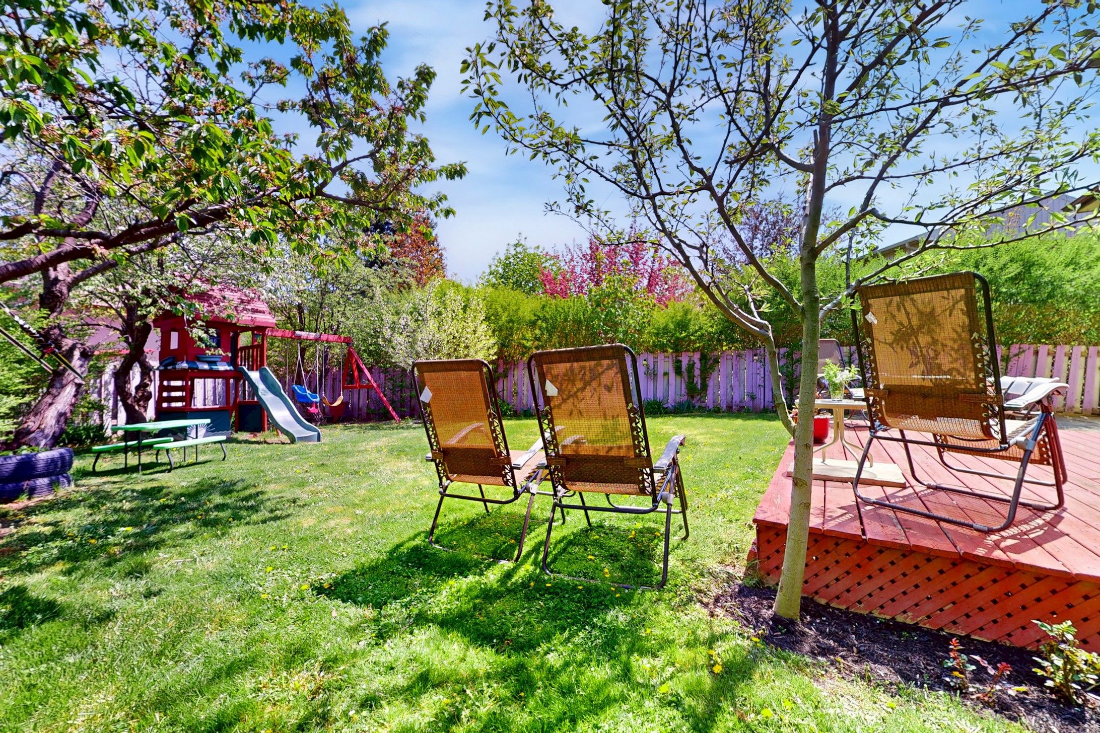 • Backyard features an orchard with mature fruit trees and easy maintenance.