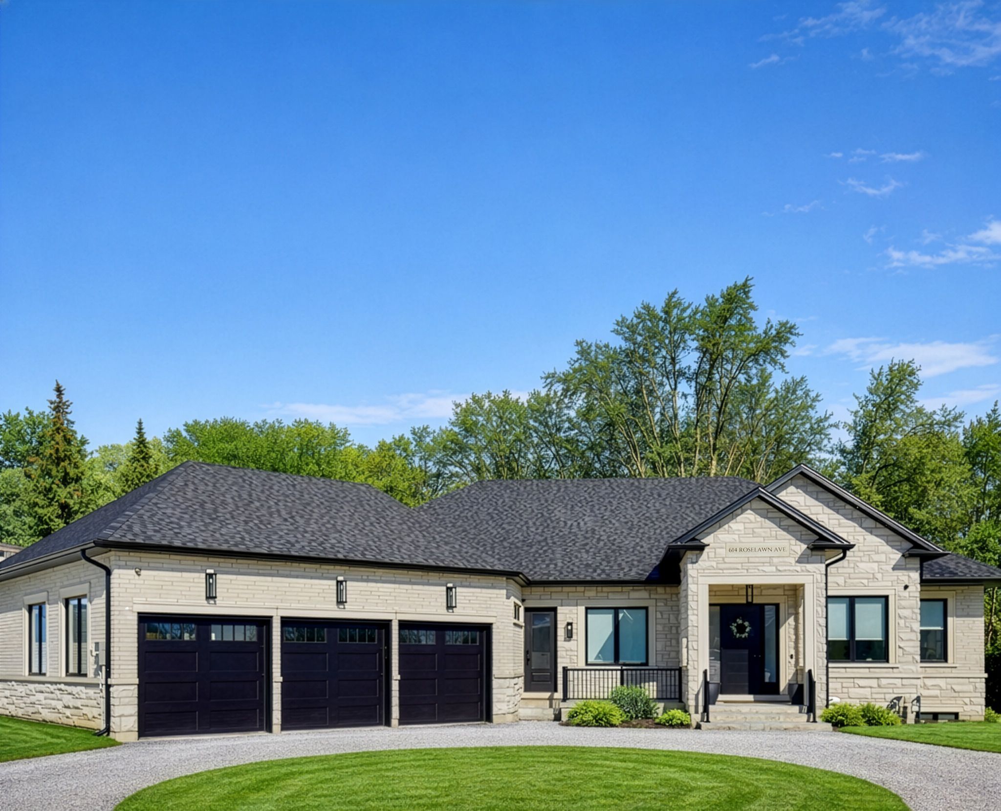 Luxurious & stunning 2024 custom-built 3 + 2 executive bungalow in the prestigious northwood community, just minutes from the charm of brooklin. Offering over 7700 sq ft of finished living space, this exceptional home showcases soaring ceilings from 10 to 18 feet, oversized windows, over 300 pot lights, exquisite millwork, and elegant hardwood and polished porcelain floors throughout. The spectacular chef's kitchen is designed for both entertaining and everyday living, featuring a massive island, stone countertops and backsplash, panelled side-by-side sub-zero fridge and freezer, wolf double ovens, and a professional gas range. A fully equipped prep/spice kitchen with its own sink and dishwasher adds remarkable convenience. You can't help but notice the custom wine cabinet with light feature. The main level offers three spacious bedrooms, each with walk-in closets, including a luxurious primary suite with a spa-inspired ensuite and heated floors. The fully finished lower level features 9-foot ceilings, two additional bedrooms, two baths, a complete kitchen rough-in, two large cold cellars, two interior staircases, and a separate walk-up entrance-ideal for multi-generational living. A heated three-bay garage with 4th rear access garage door, powered blinds in family room and master bedroom windows, dual furnaces, dual a/c systems, and uv water filtration with softening ensure comfort and efficiency throughout. Stretching across the back of the home, the partially covered concrete loggia overlooks a picturesque ravine lot-an exceptional setting for relaxing or entertaining outdoors. Minutes to amenities, highway 407, excellent schools, and ontario tech university, this extraordinary home offers luxury, scale, and lifestyle in one stunning package.