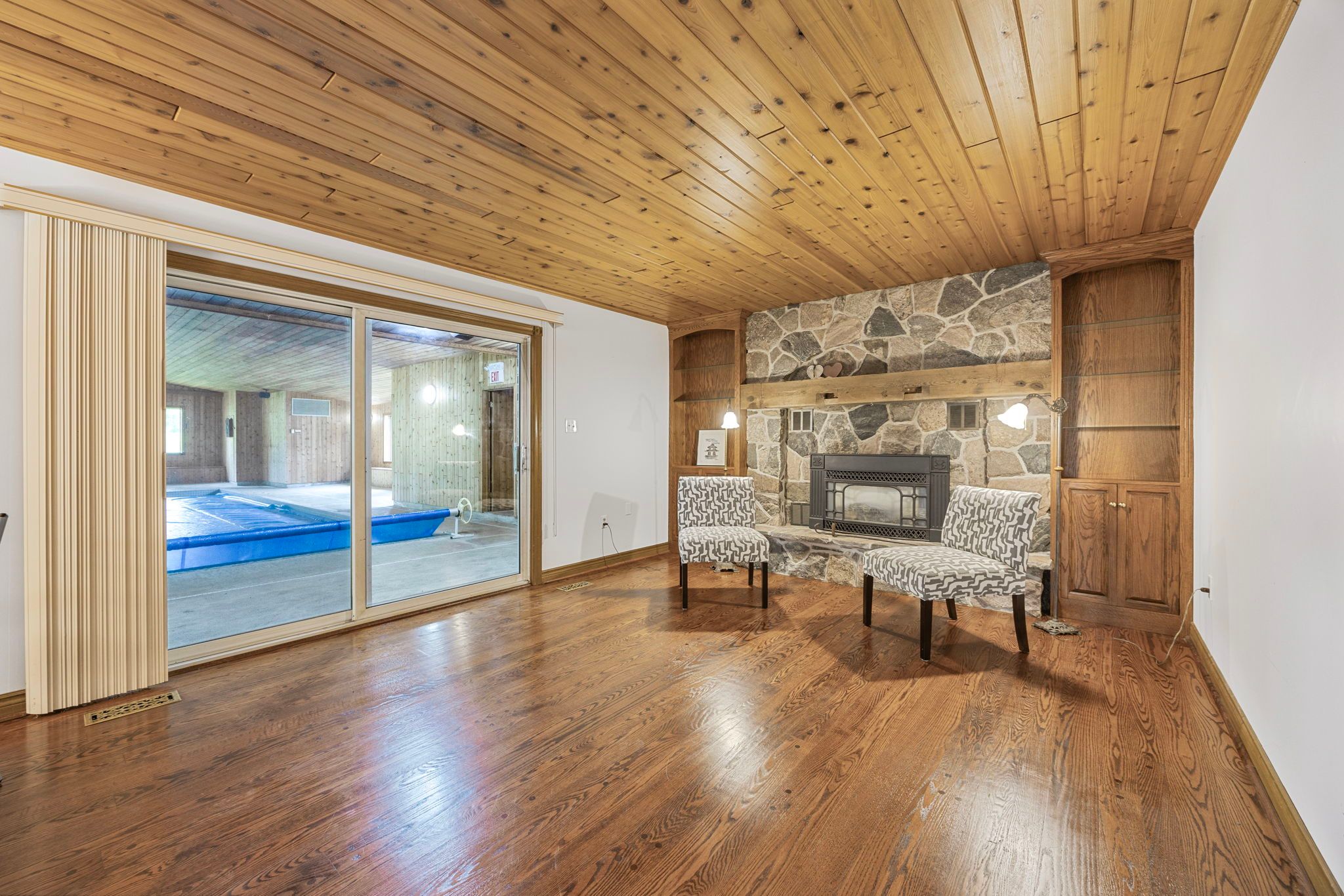 • Cozy glassed-in den with a natural gas stone fireplace.