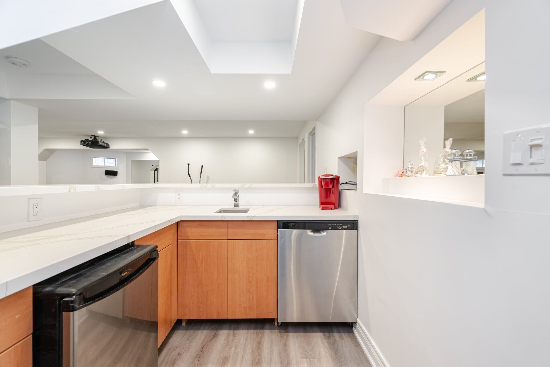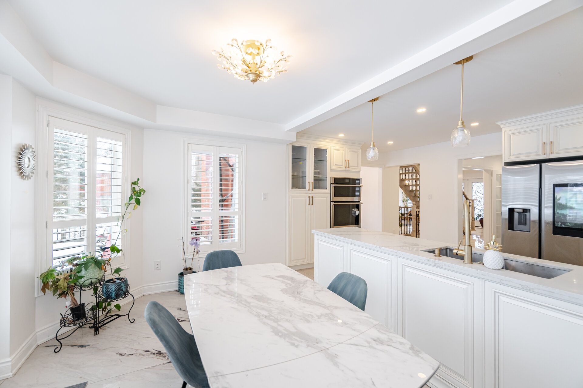 • Spacious kitchen with quartz countertops and stainless steel appliances.