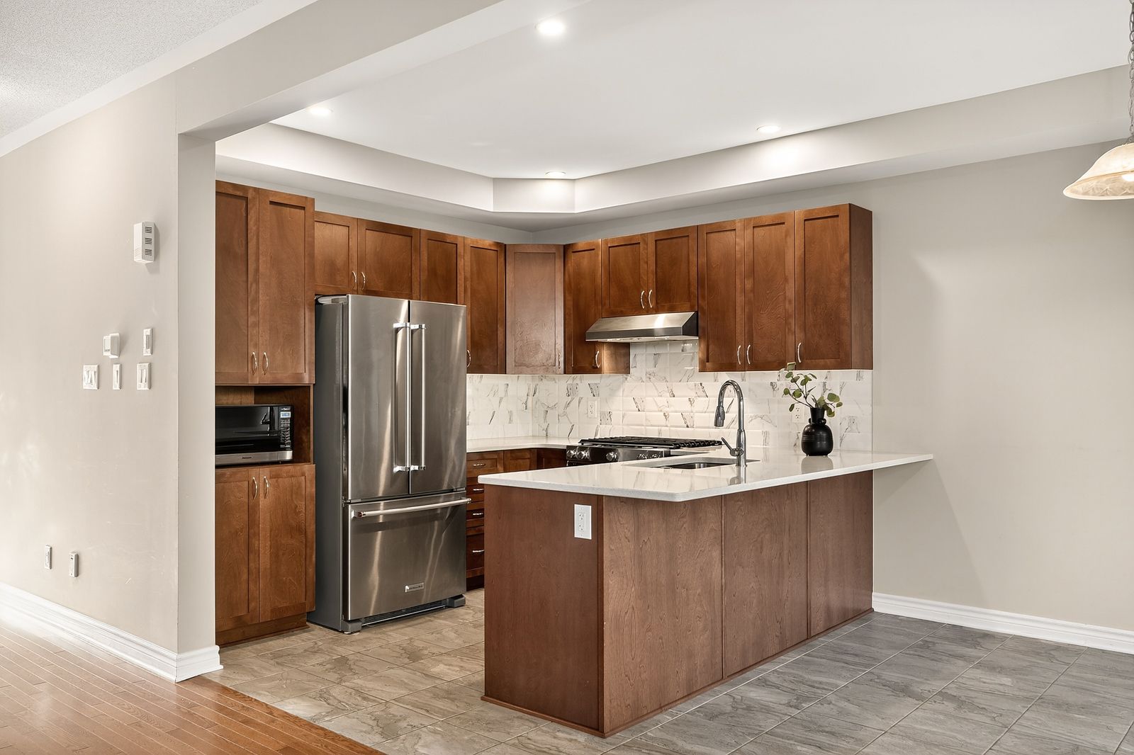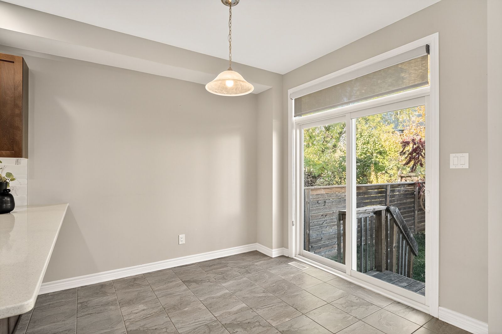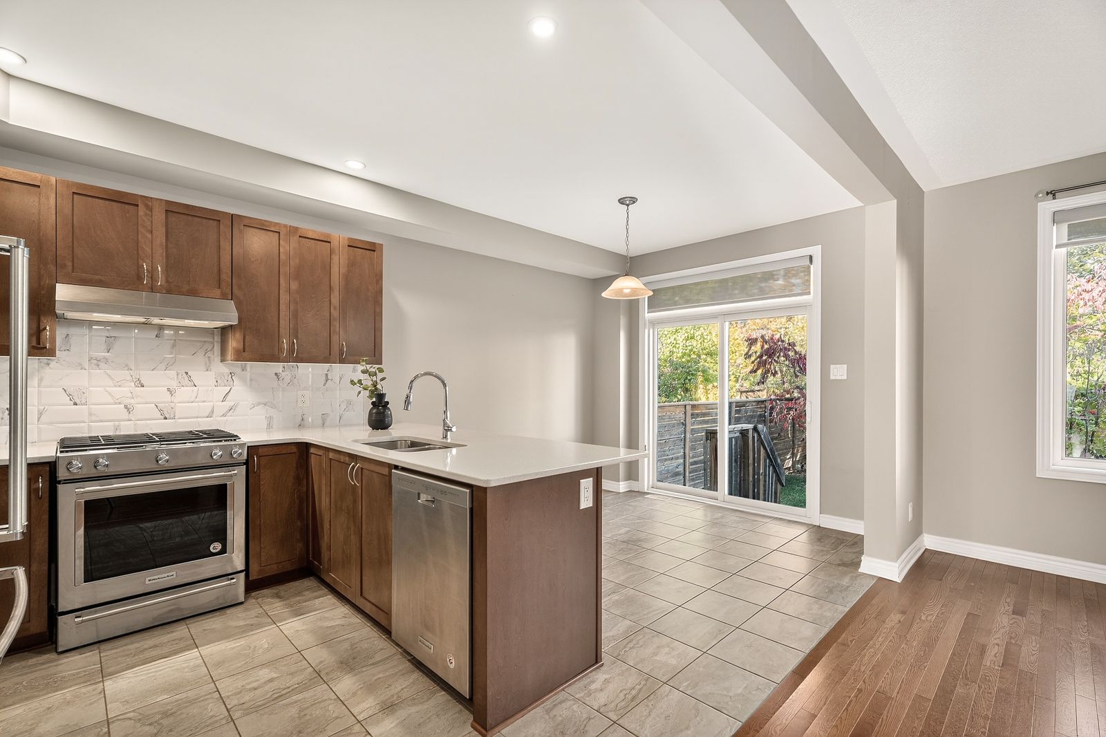 • Open-concept kitchen with stainless steel appliances and access to backyard.