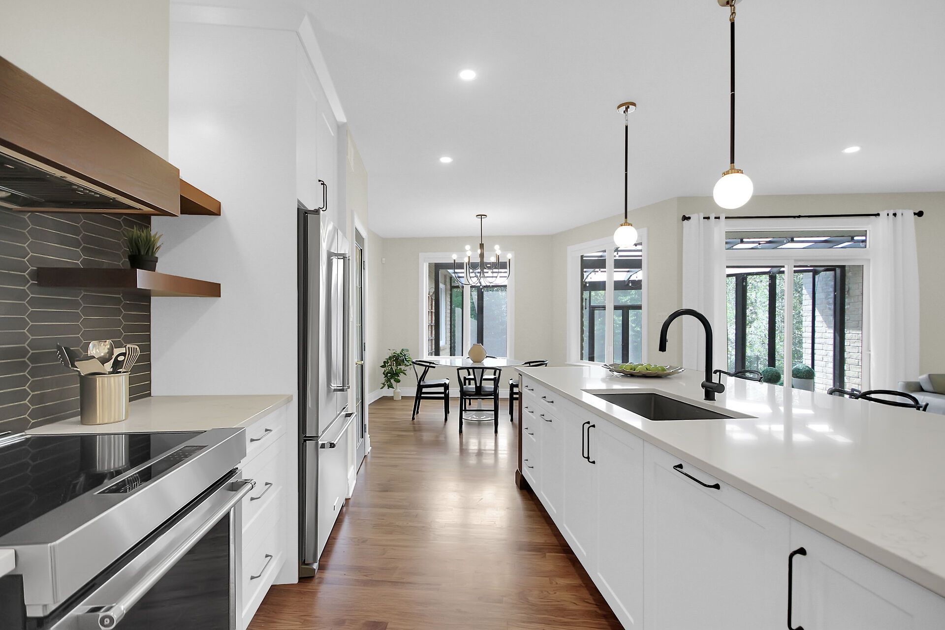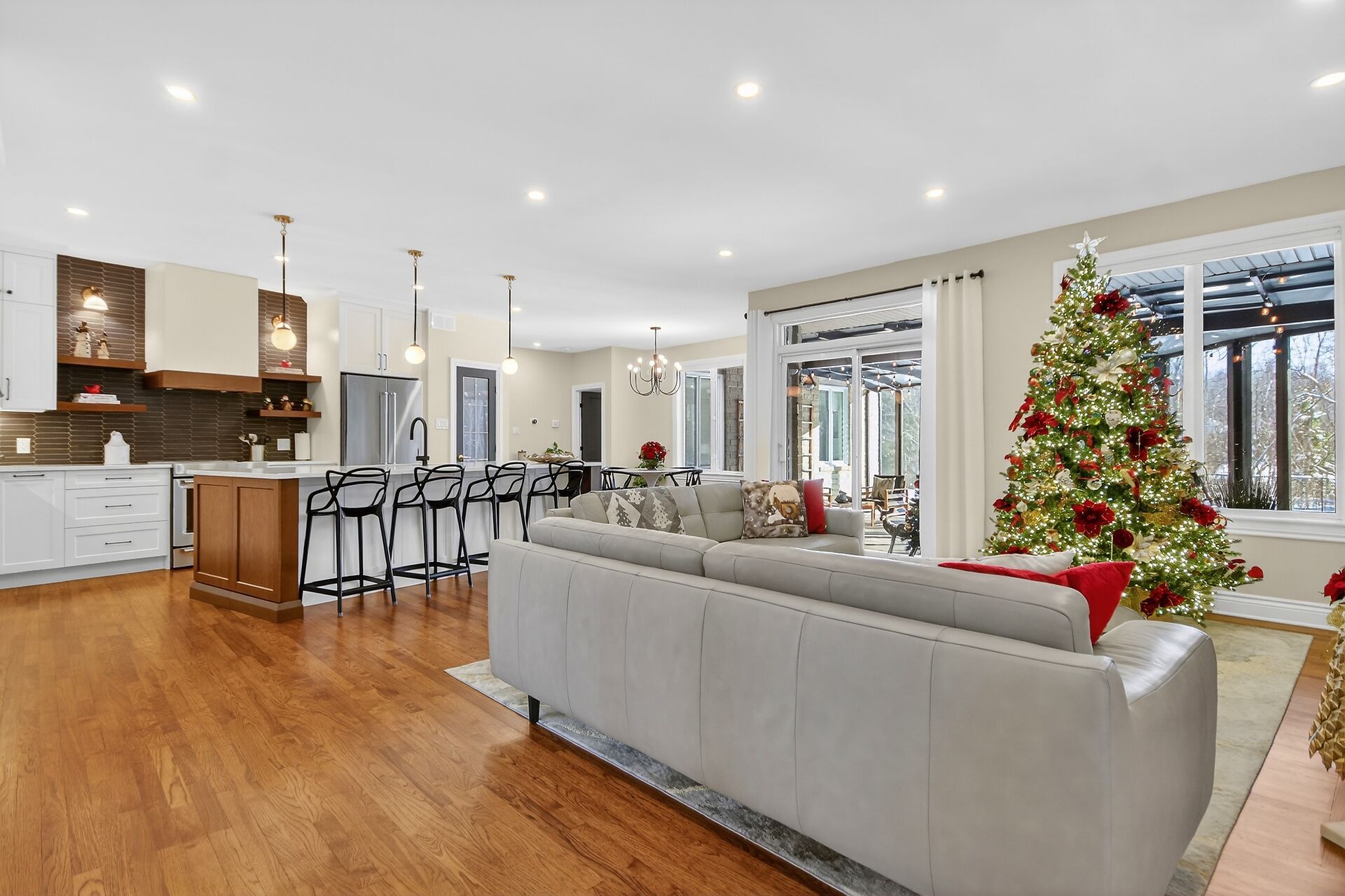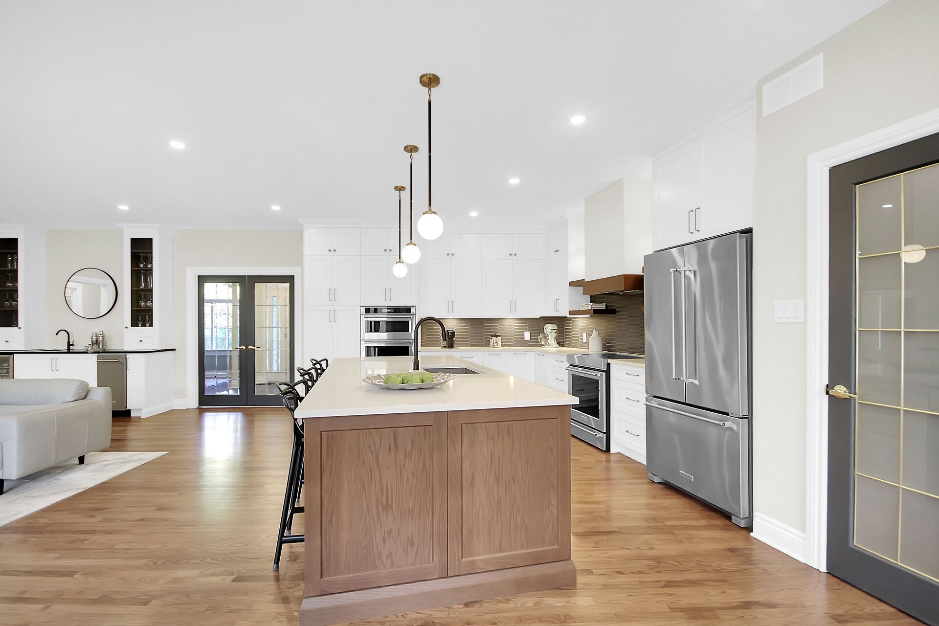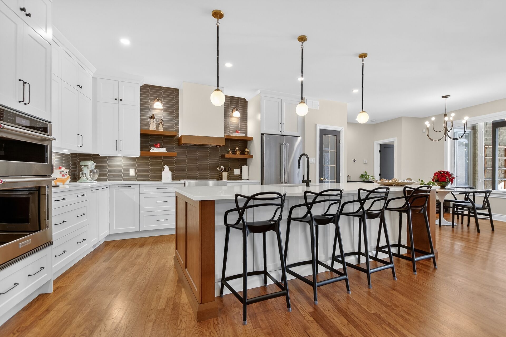 • Gourmet kitchen with walnut accents, quartz counters, and oversized island.