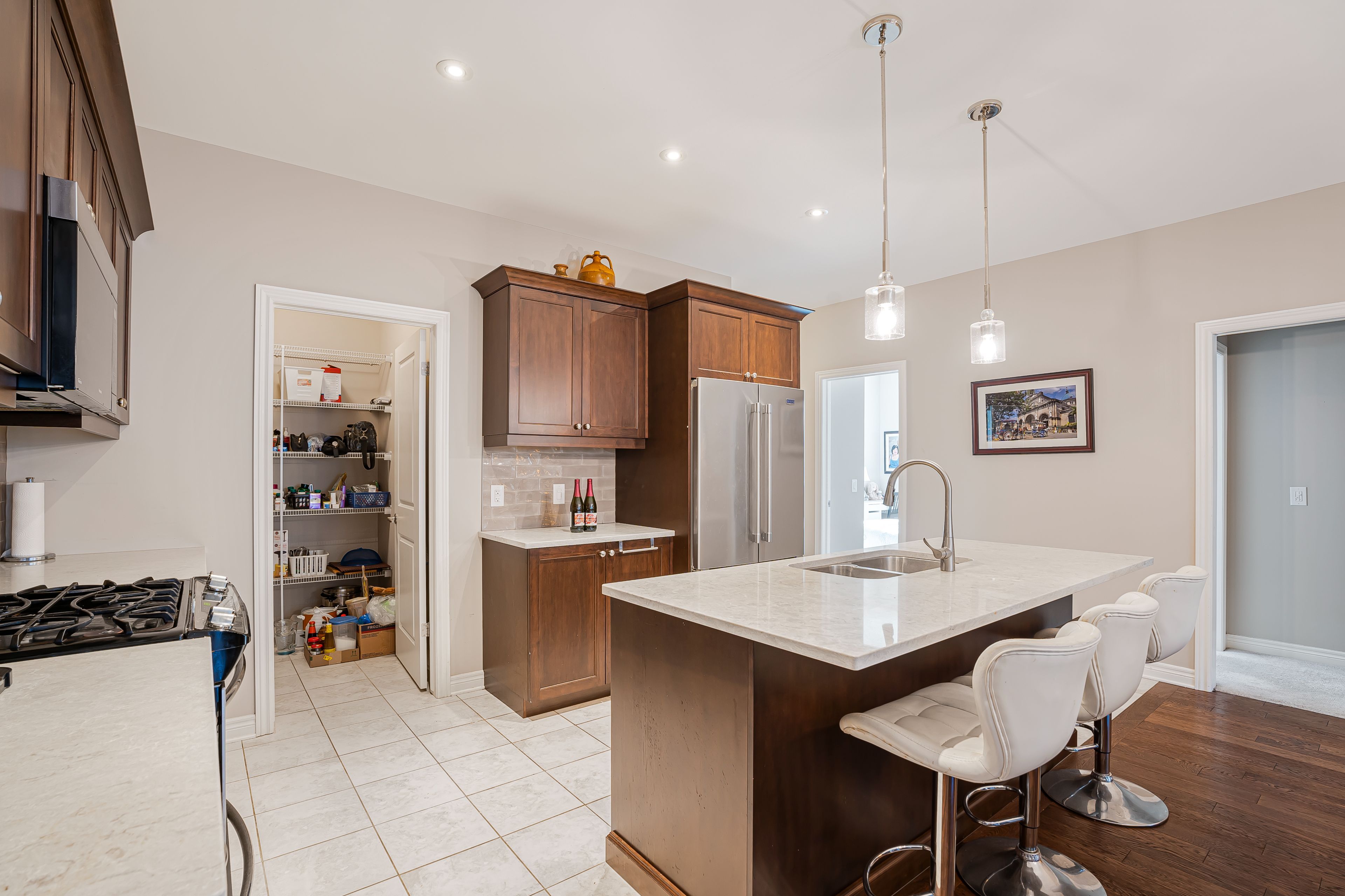 • Gourmet kitchen featuring large island, quartz counters, and walk-in pantry.