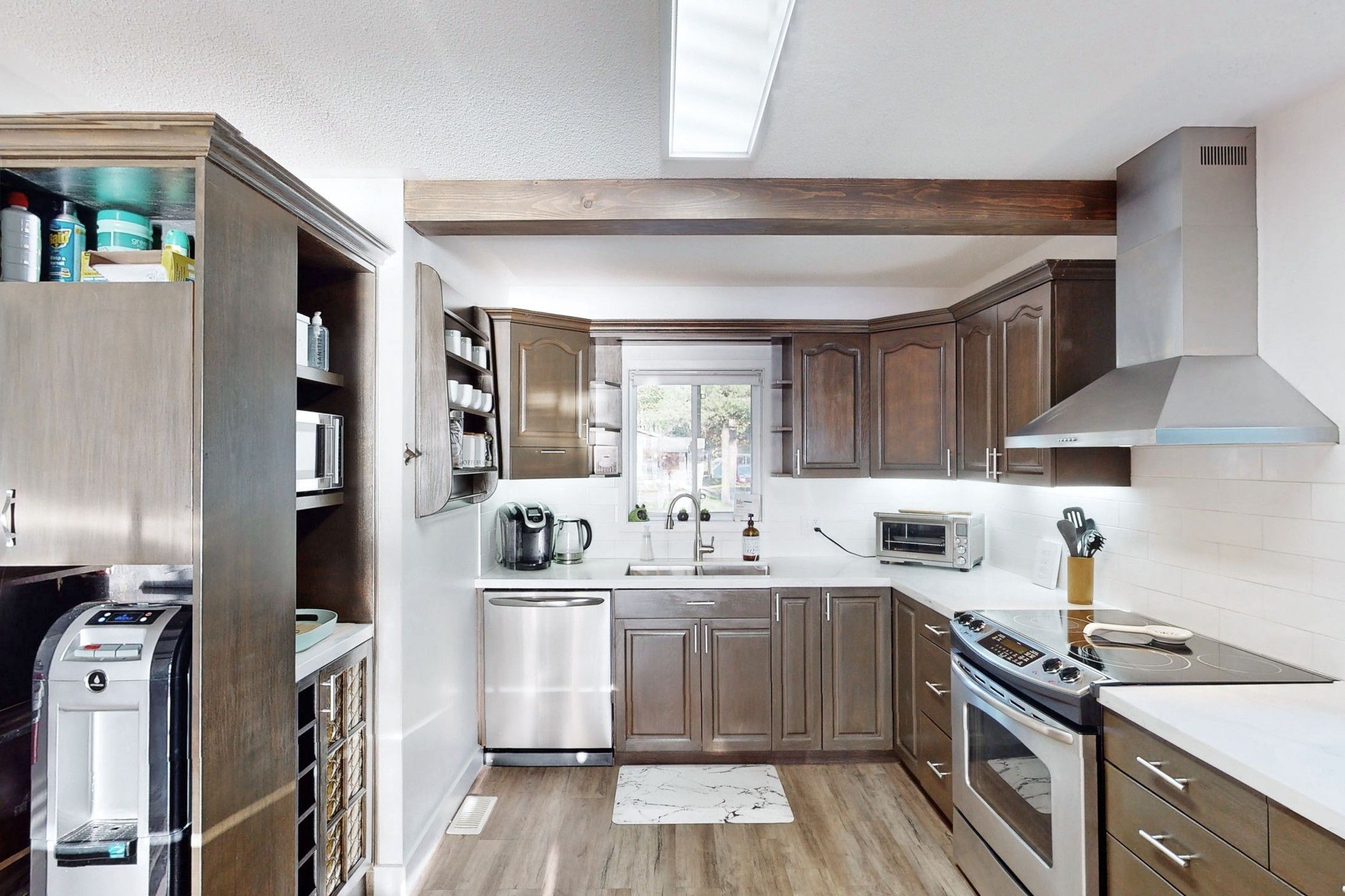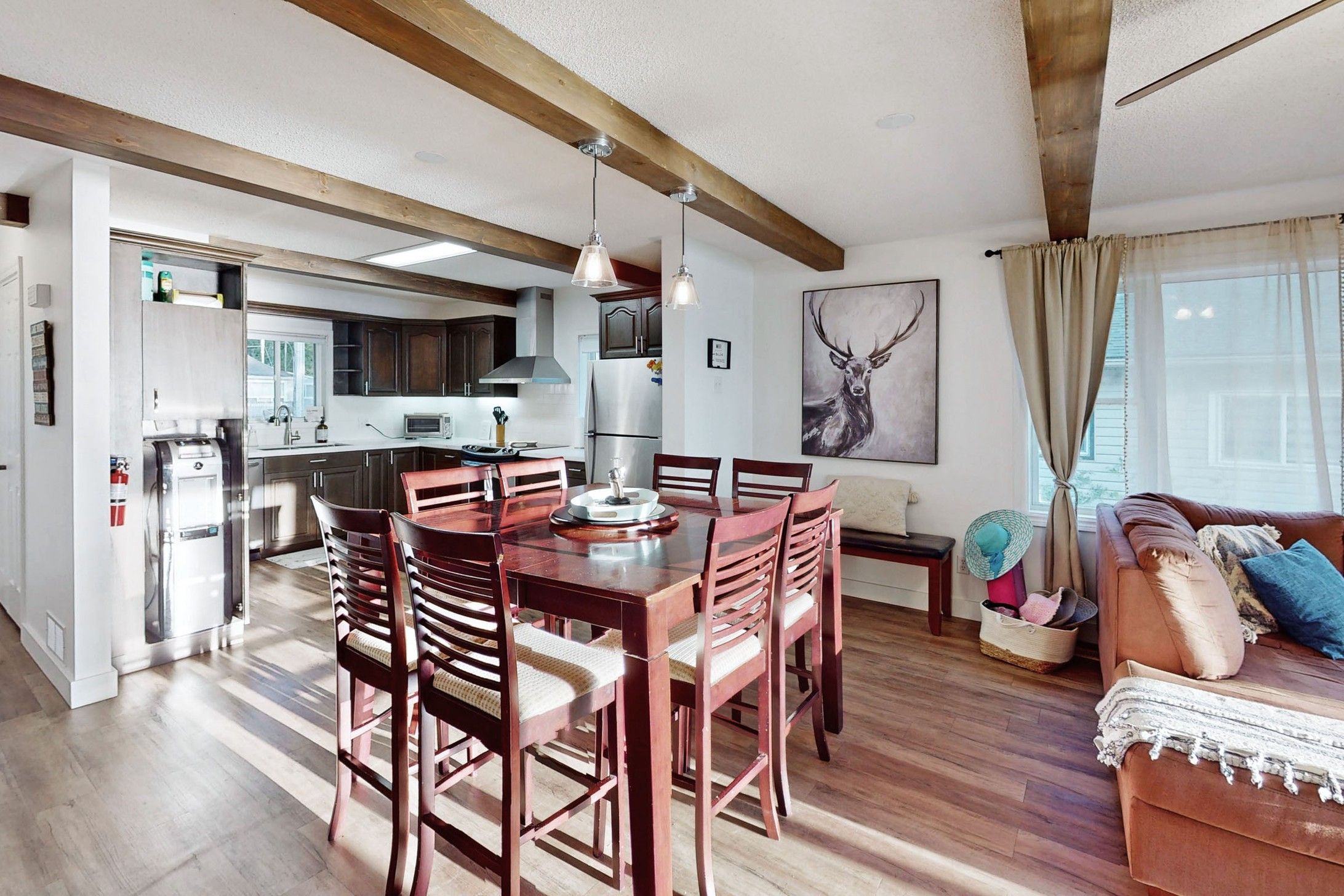 • Bright open-concept living with rustic beams and modern kitchen features.