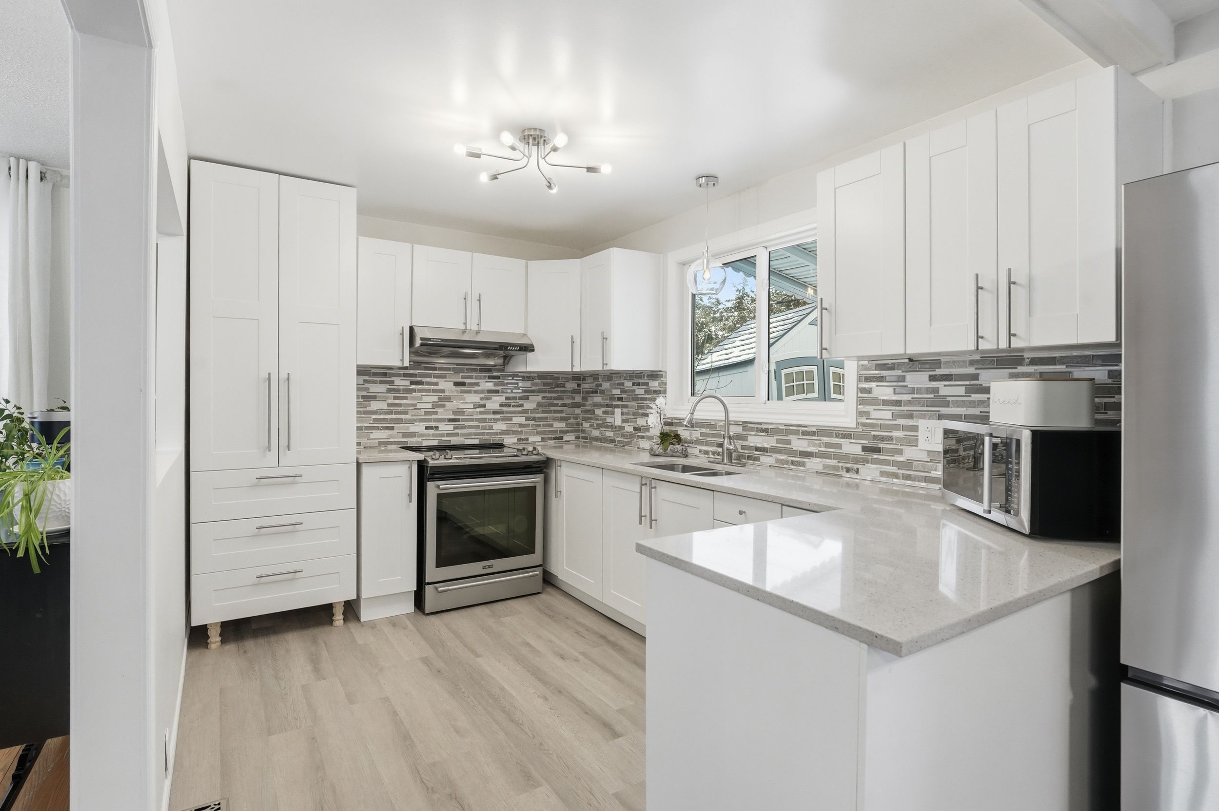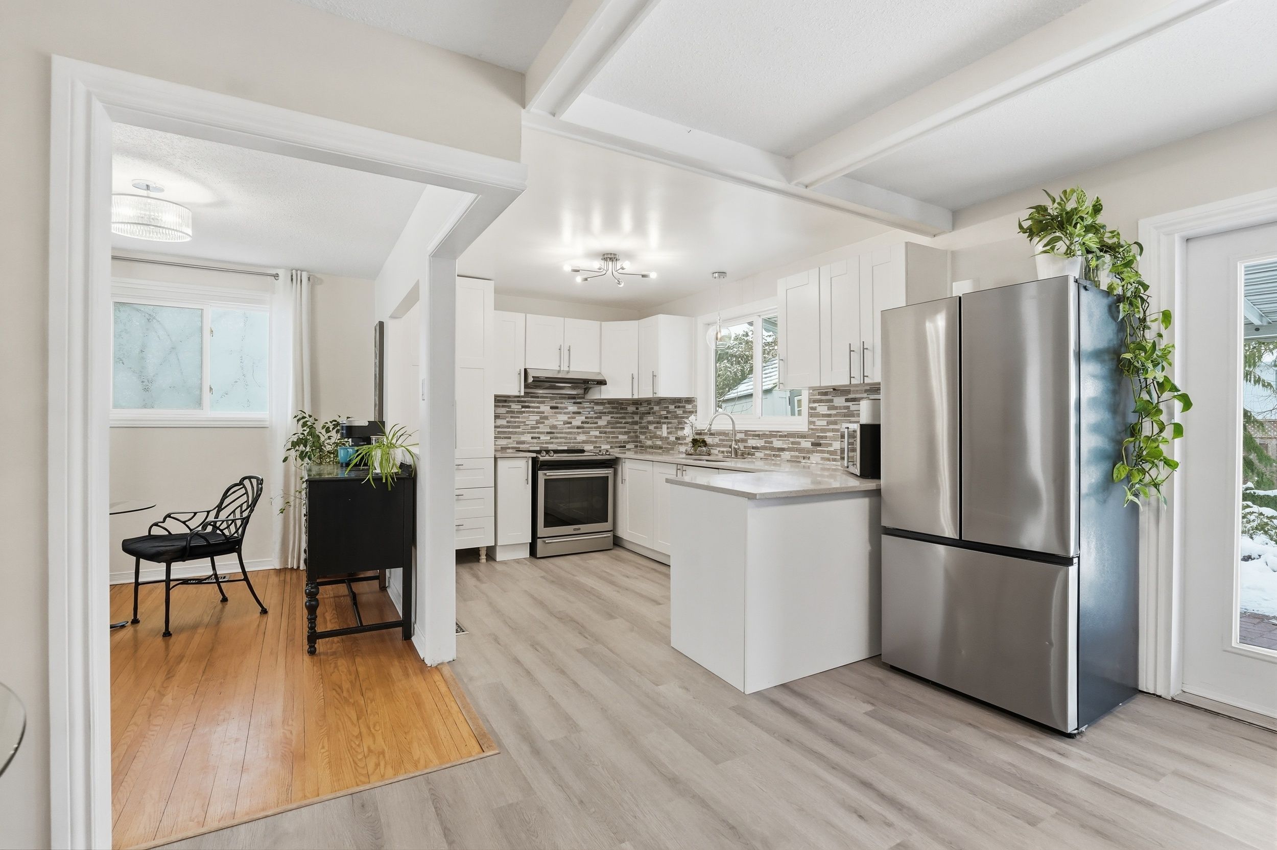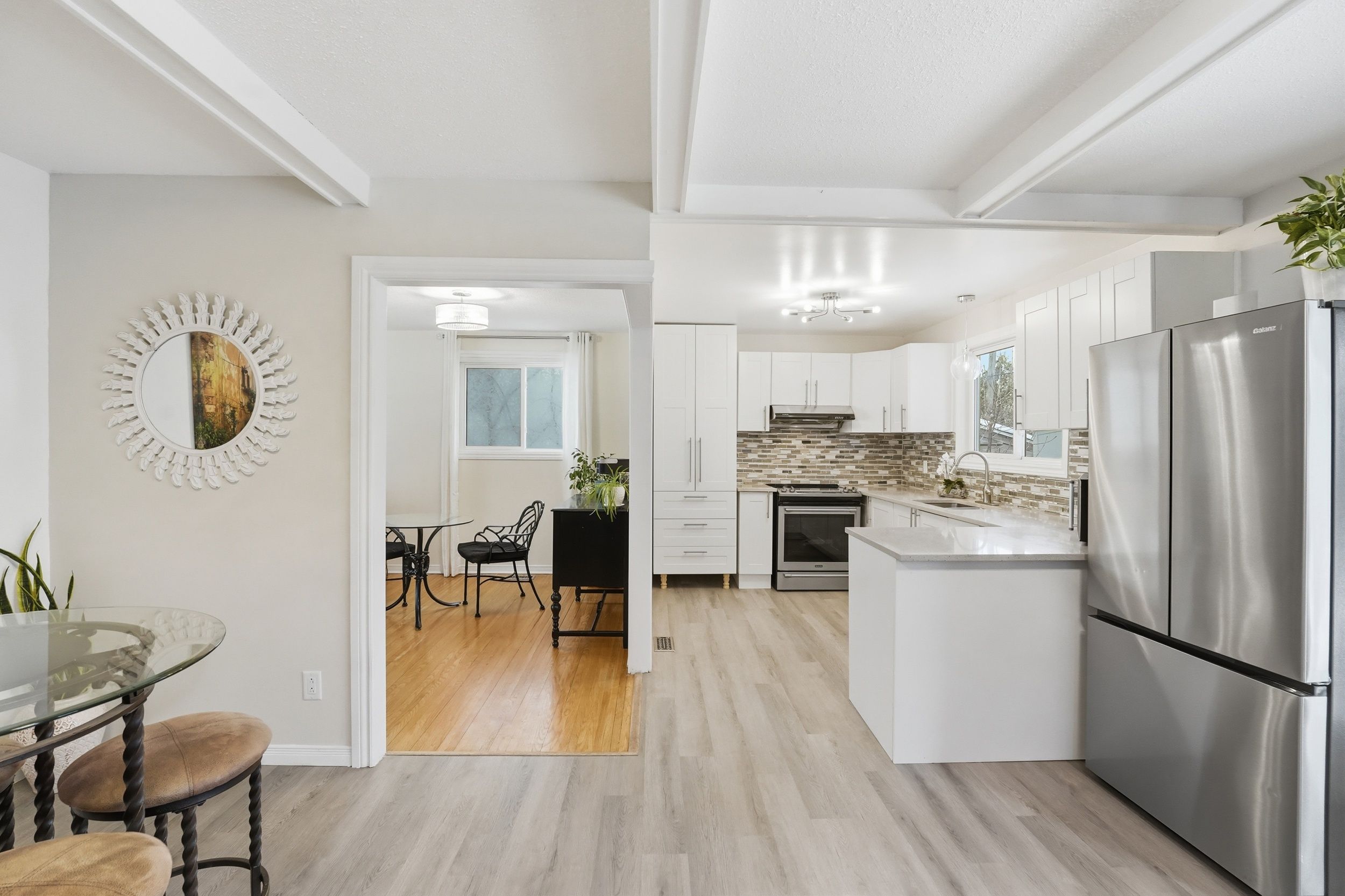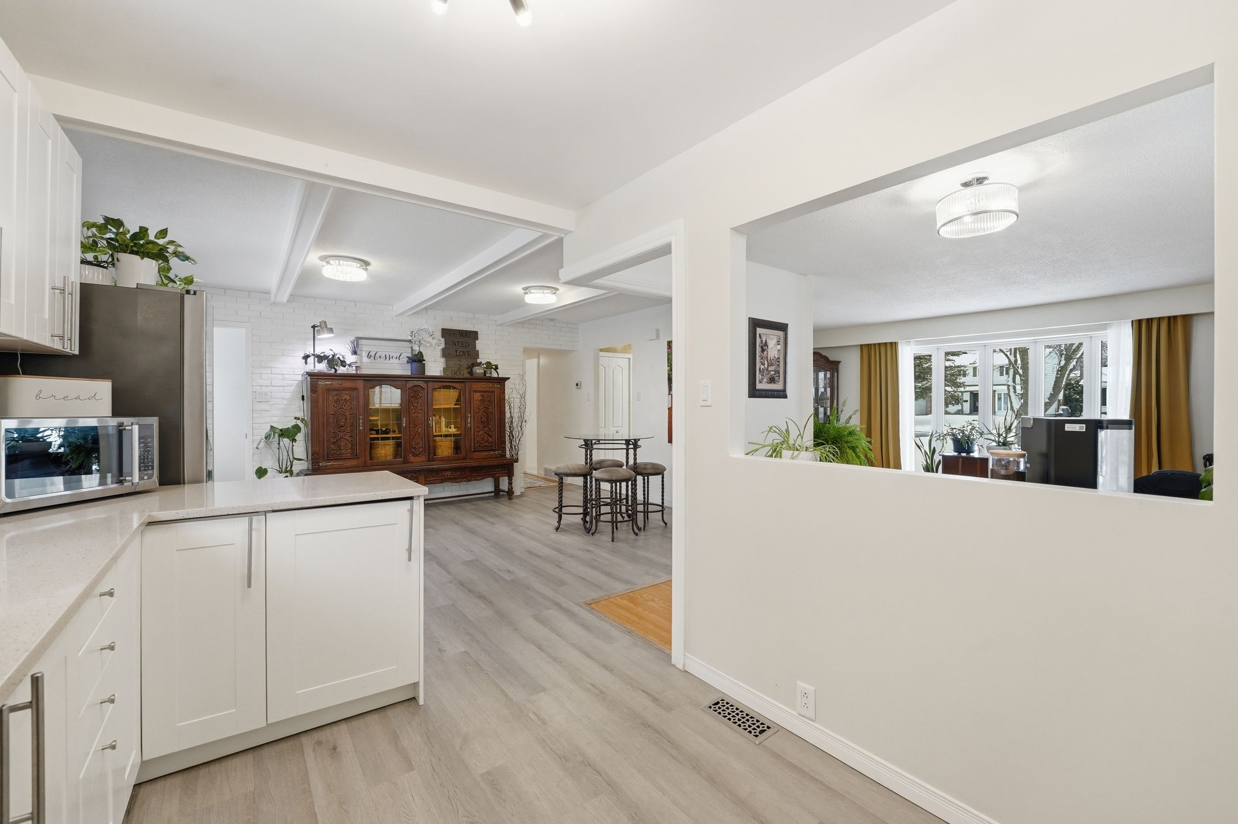 • Updated eat-in kitchen with stainless steel appliances and quartz countertops.