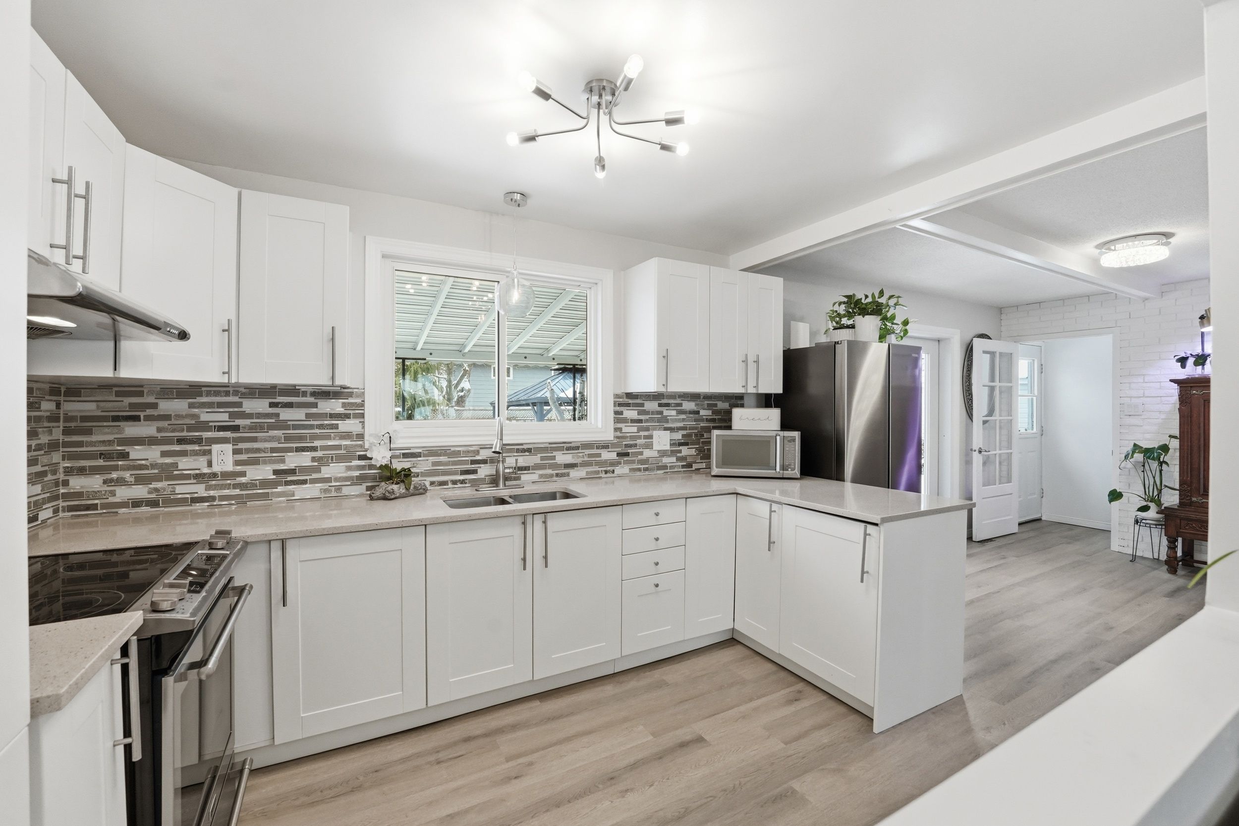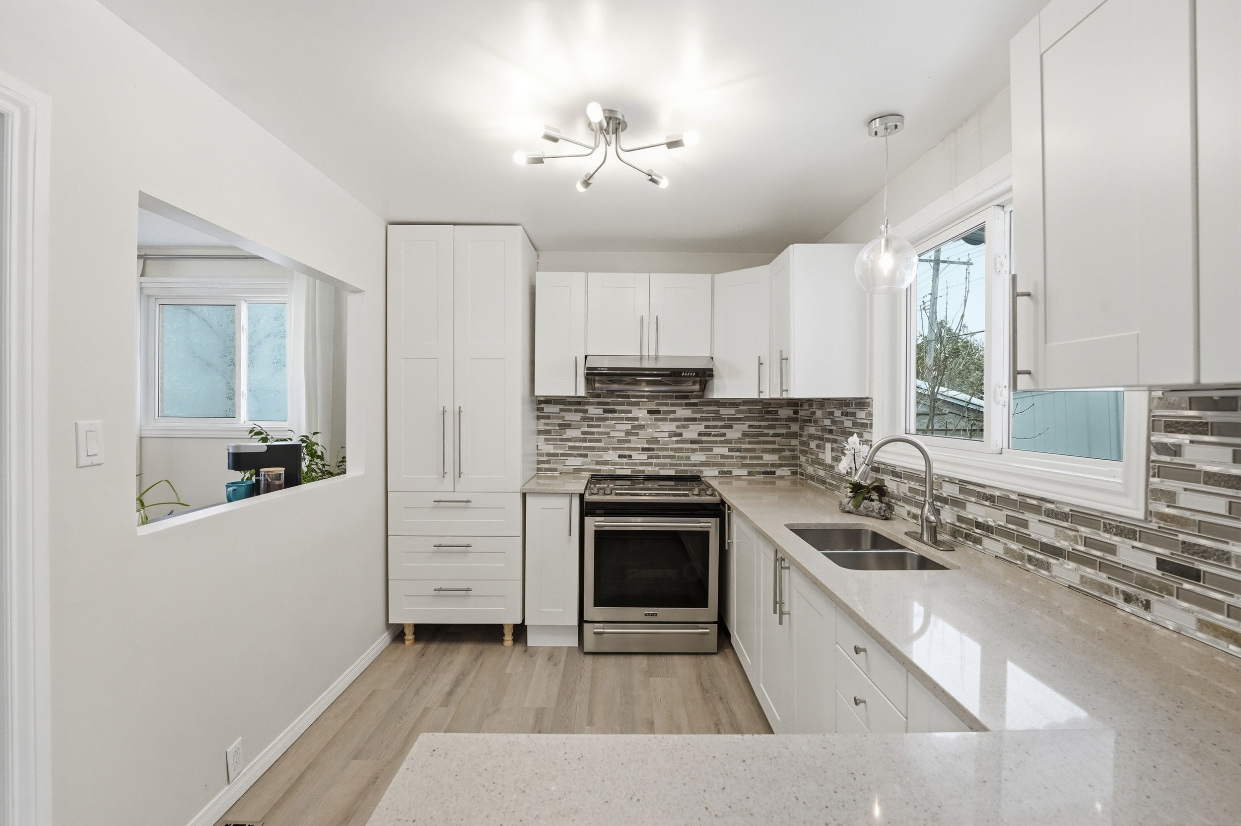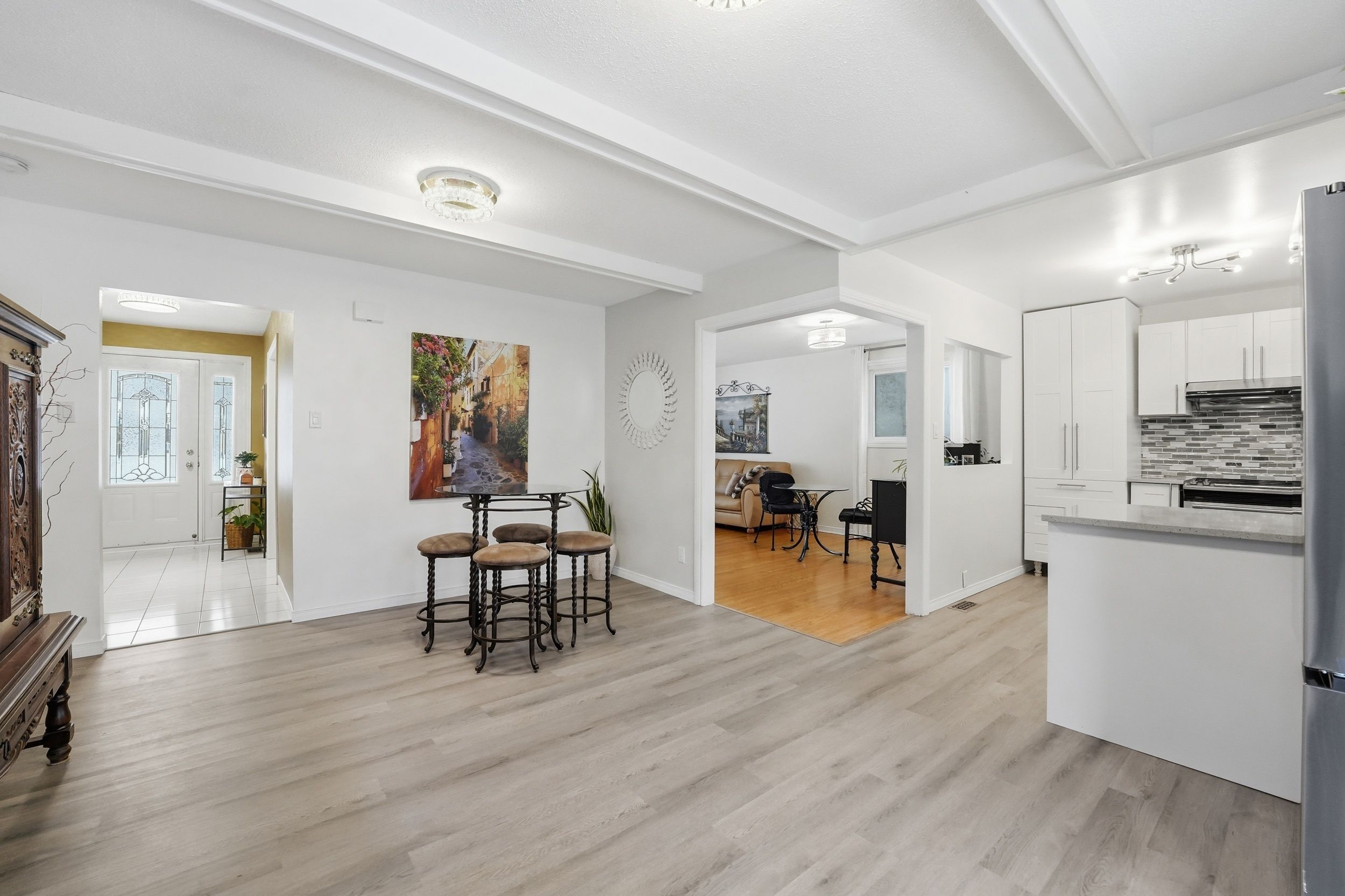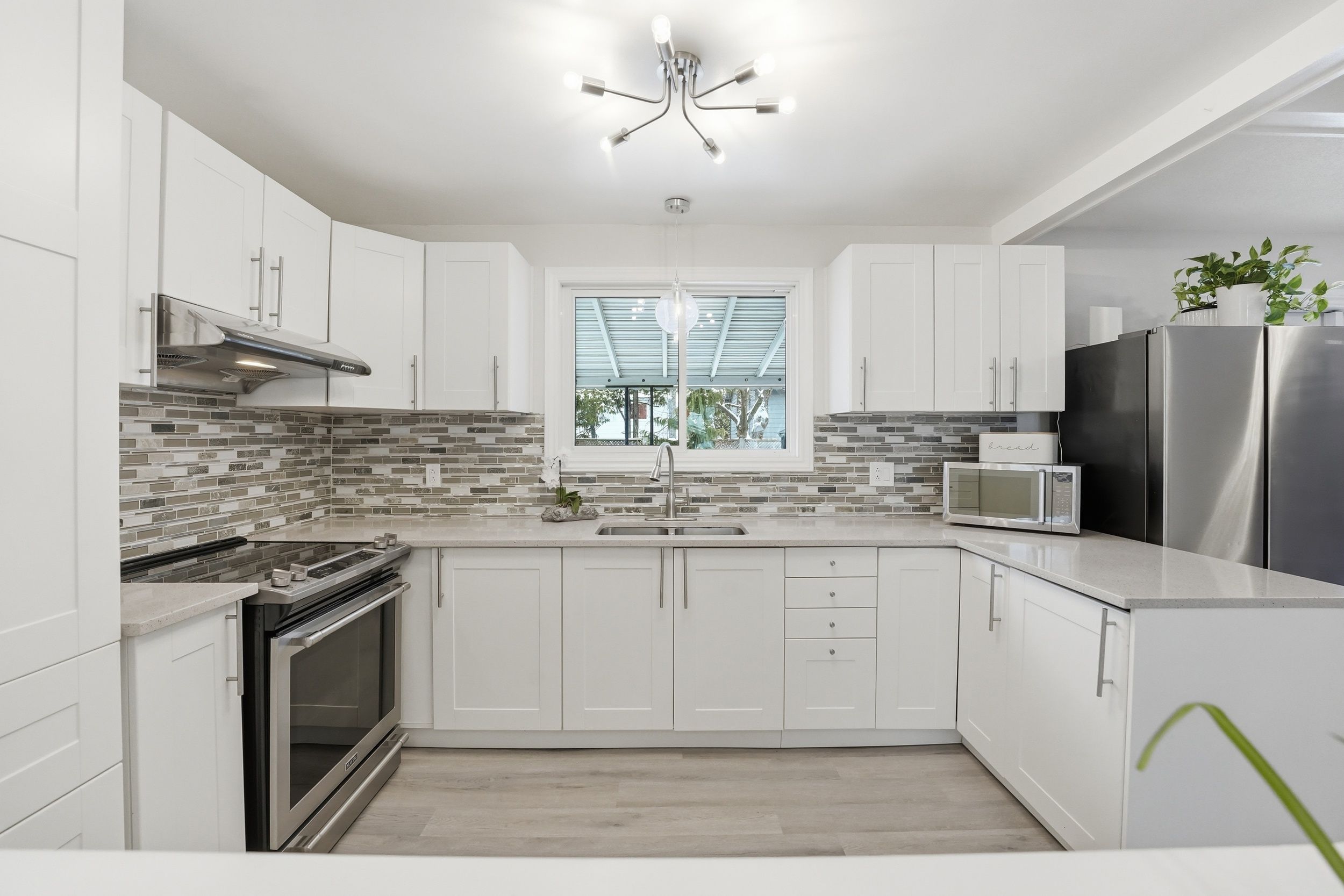 • Updated eat-in kitchen with stainless steel appliances and quartz countertops.