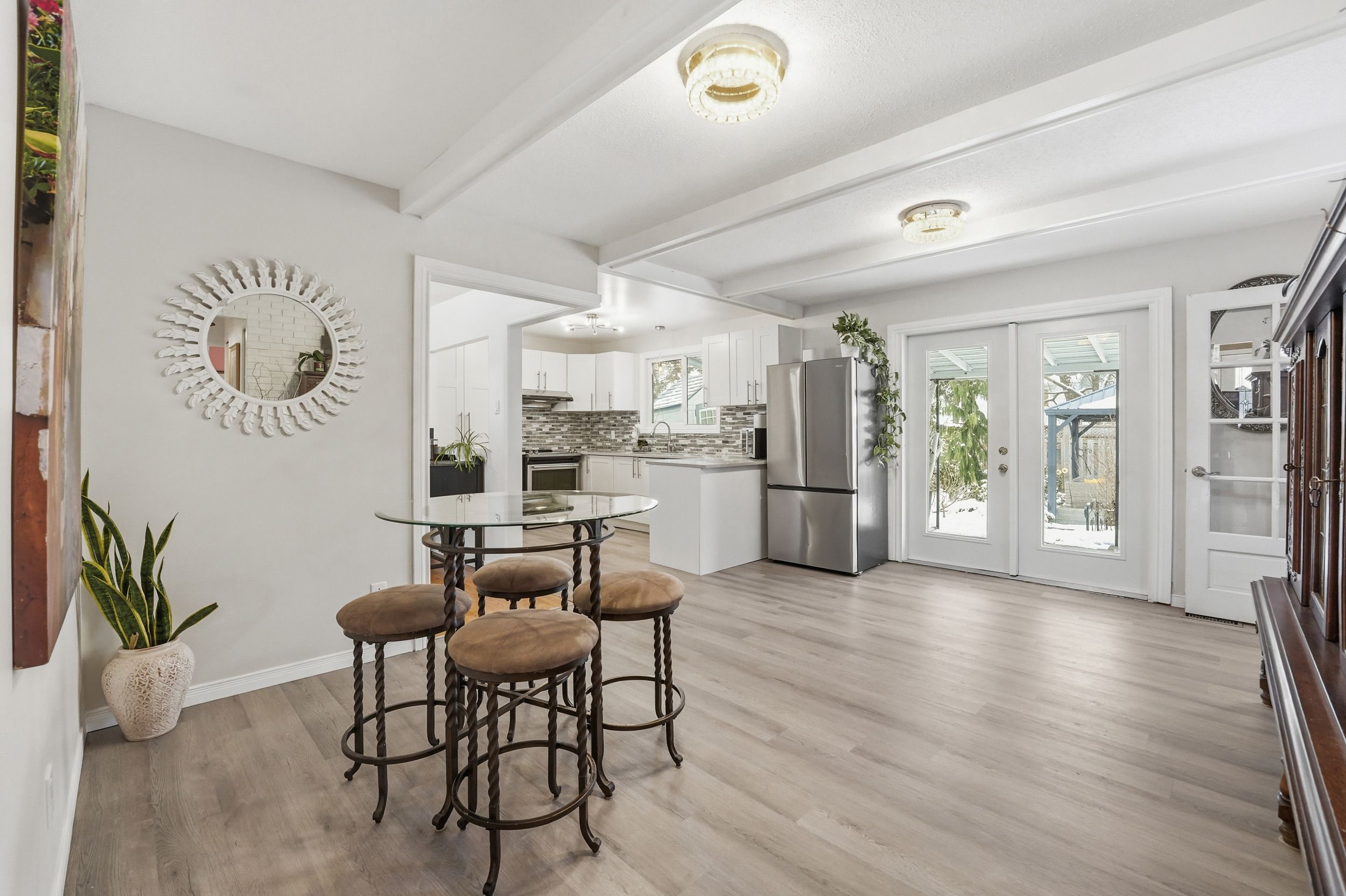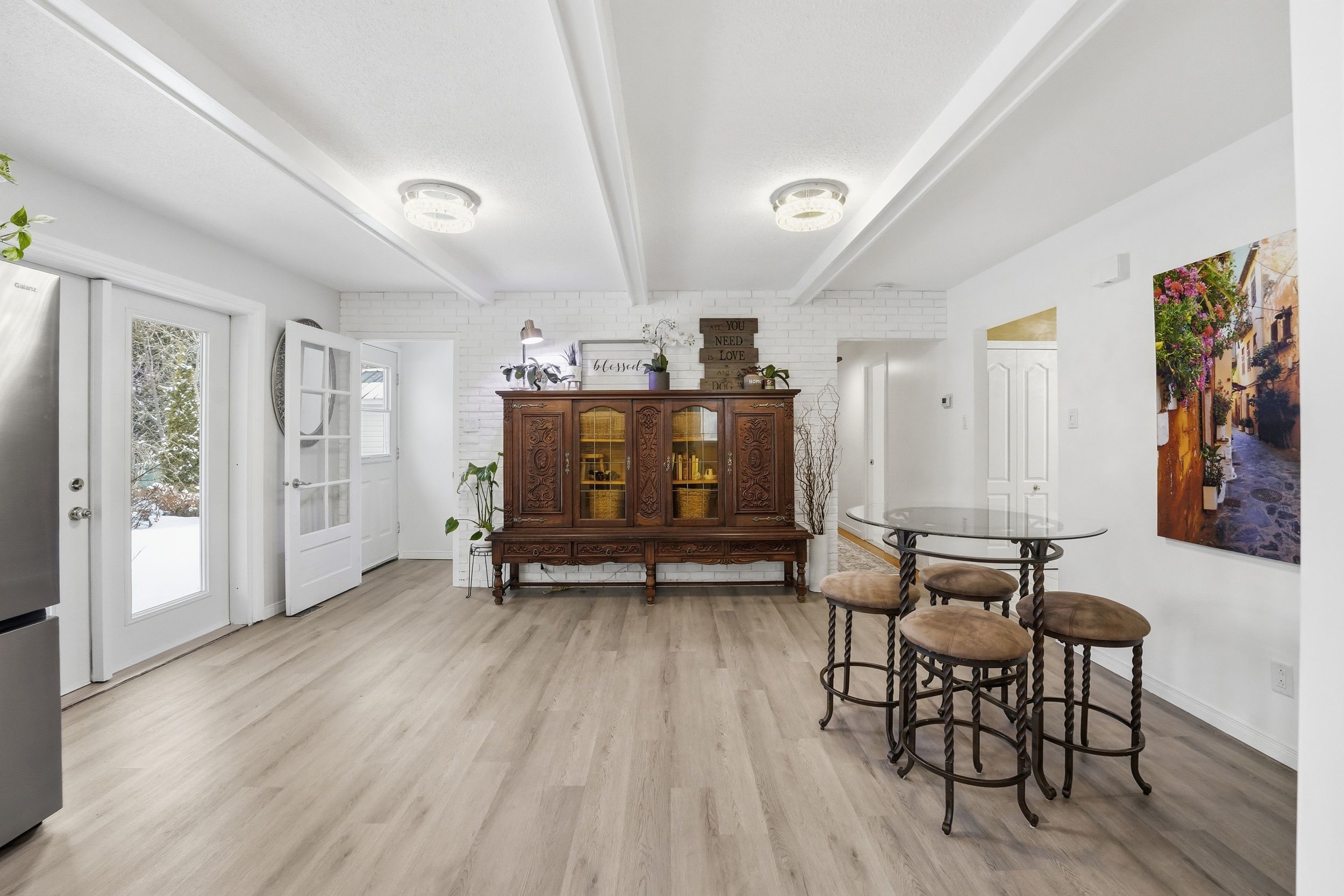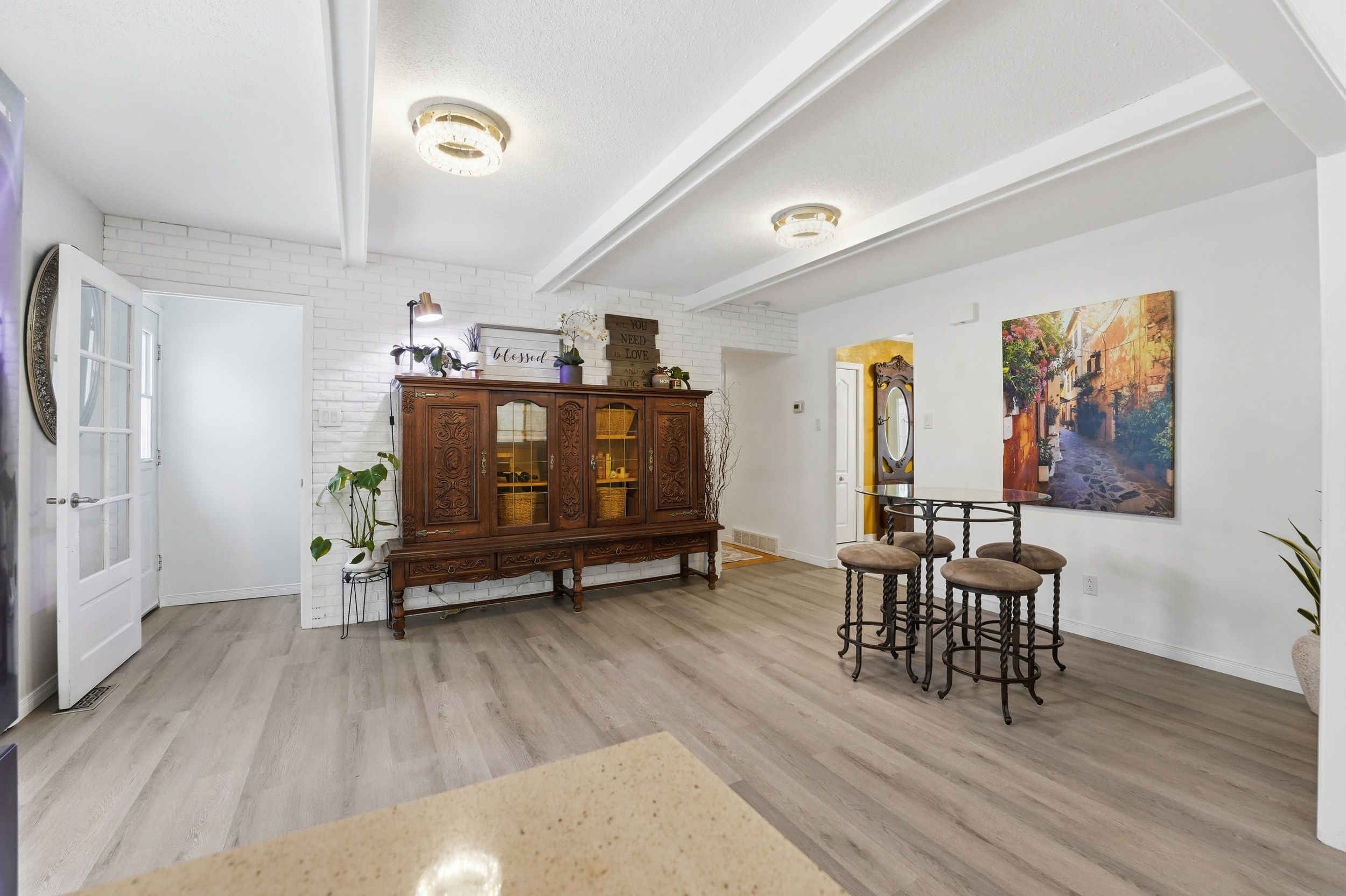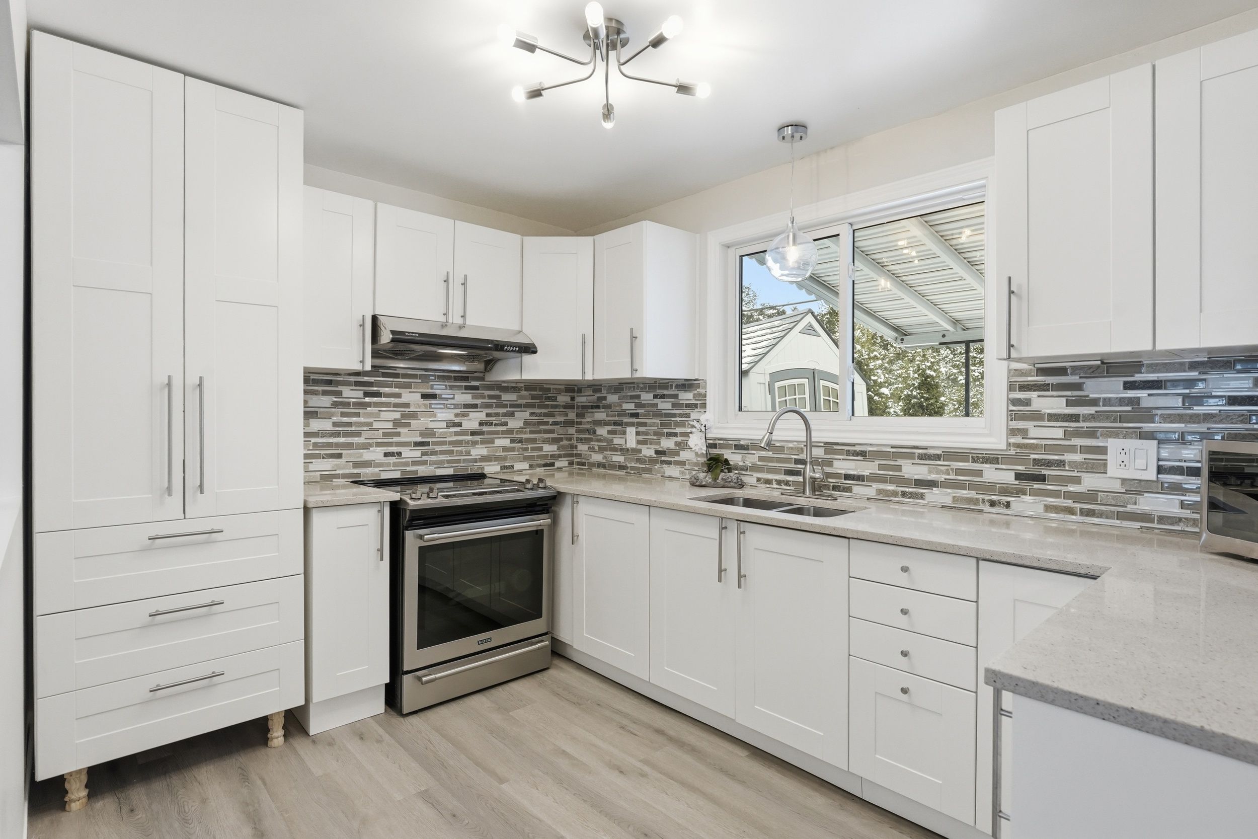• Updated eat-in kitchen with stainless steel appliances and quartz countertops.